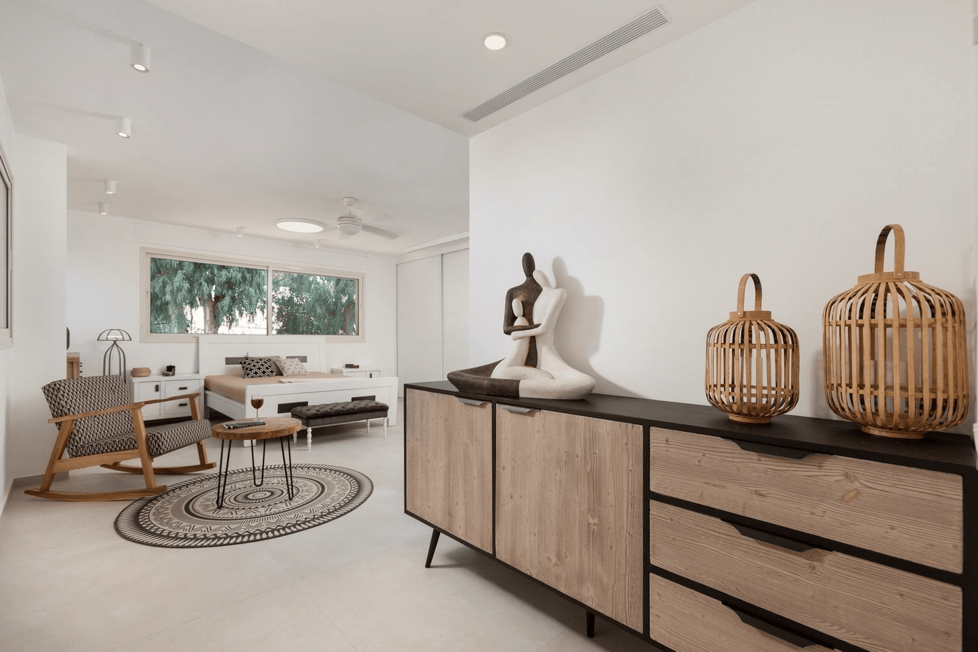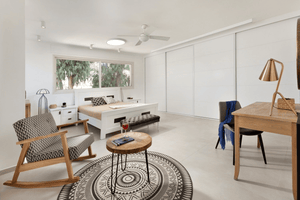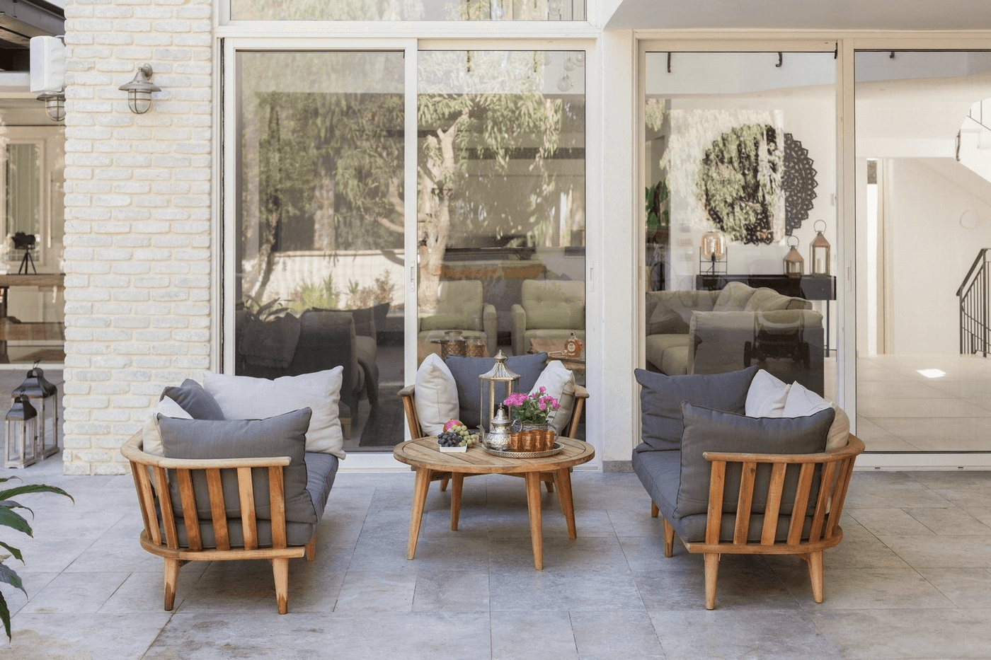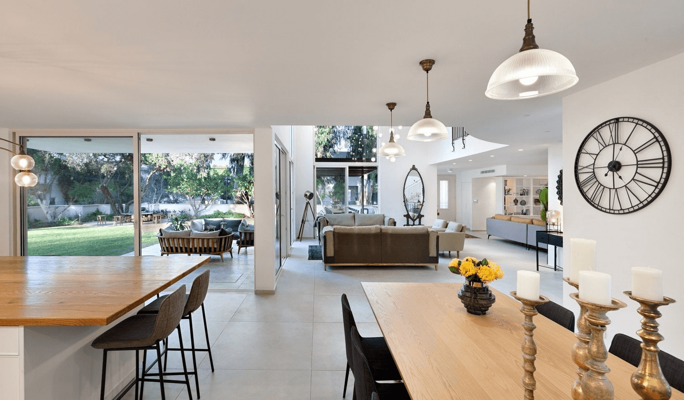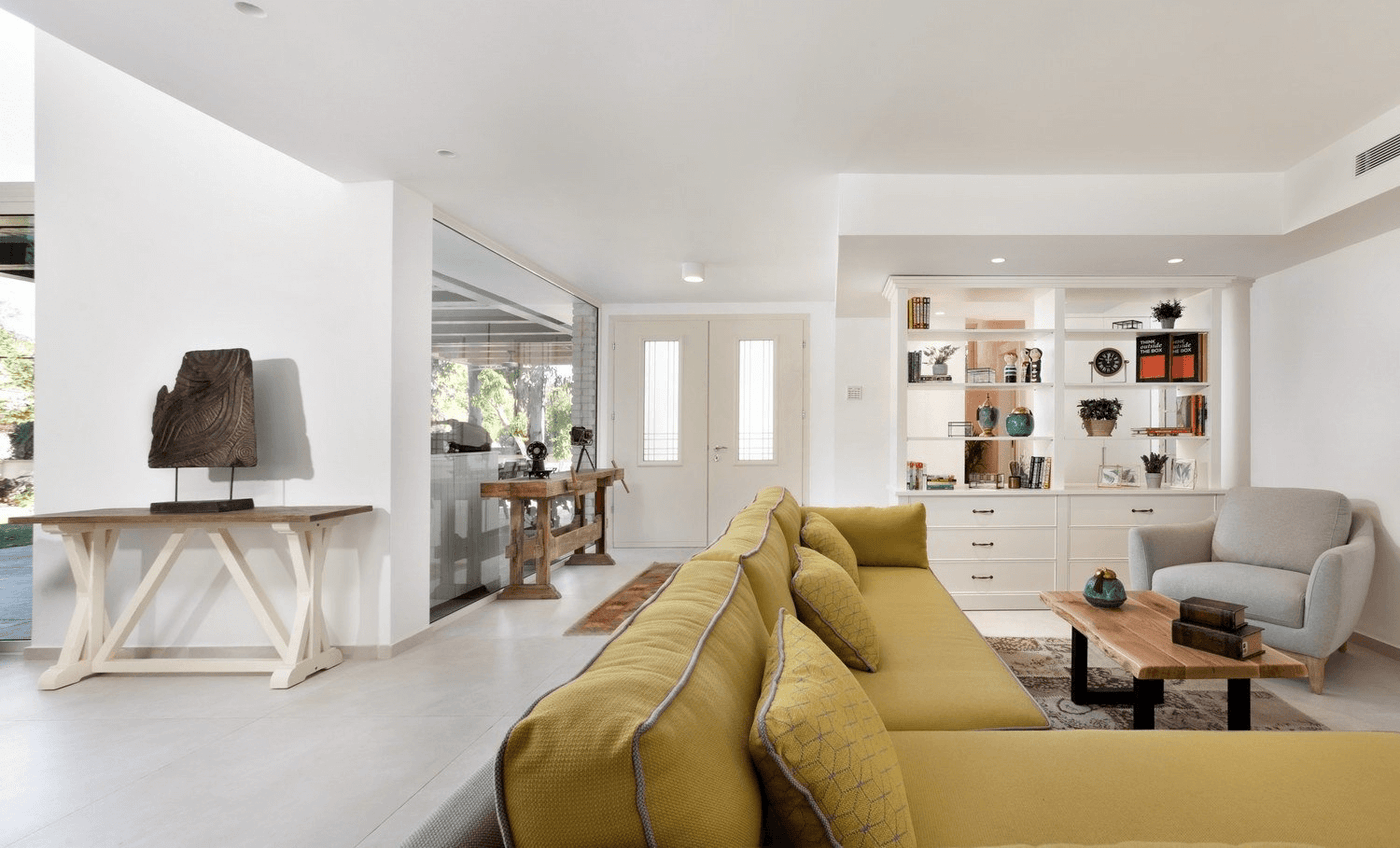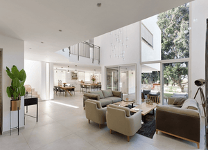 בית ברמת השרון. אדריכל נתי זיו משפחה שאוהבת לארח במיוחד, חלמה שהחלל המרכזי בבית יתמזג עם חוץ הבית. נבחרו בקפידה, שולחנות סלון מפלטות עץ אלון טבעי, ספות שיעניקו רכות בחלל, יחידות למטבח, קונסולה מברזל ומשרביה מעץ להשלמת התמונה. משפחה מיוחדת עם רהיטים מיוחדים