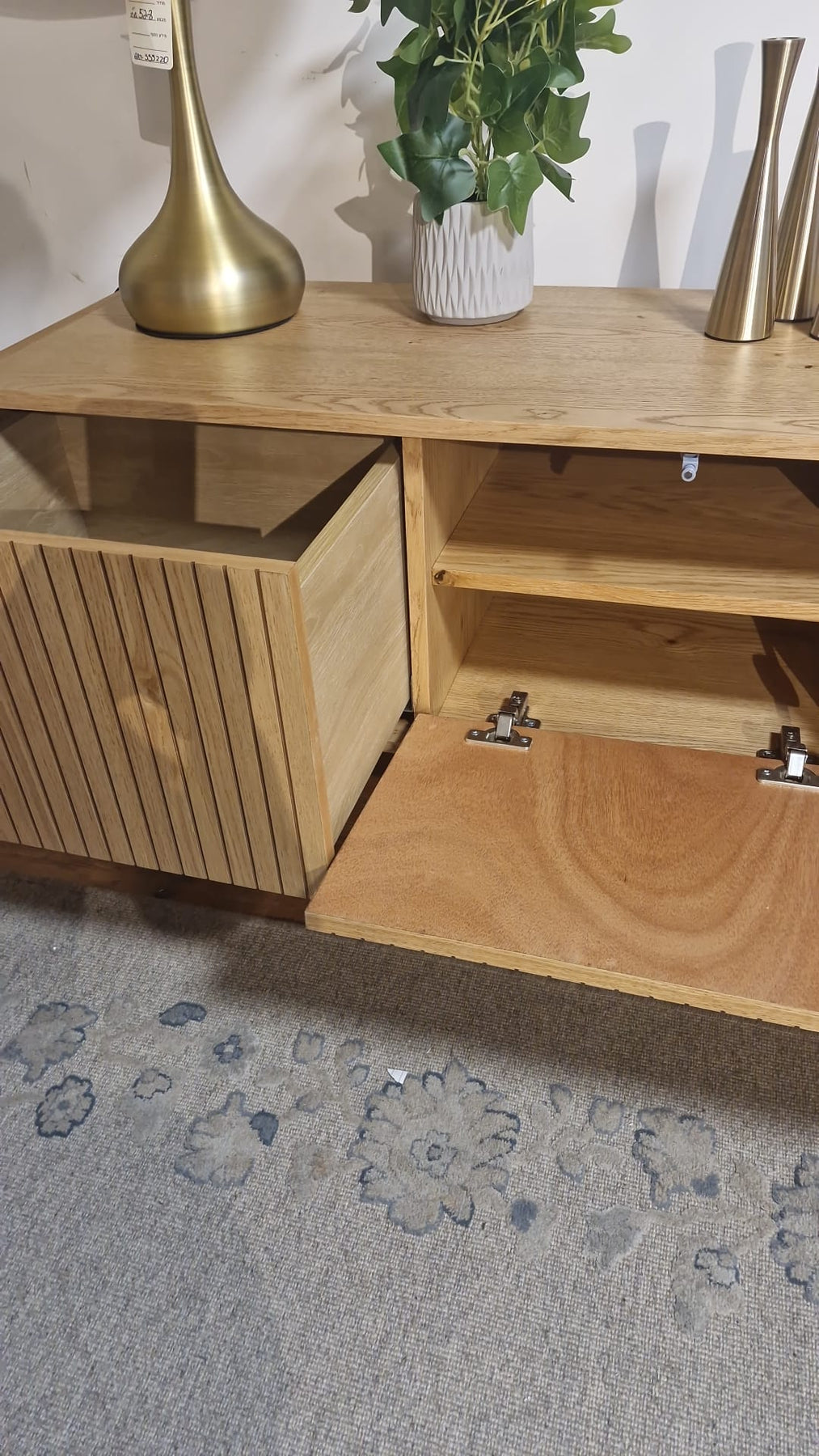 מזנון טלוויזיה יוקרתי בעיצוב נורדי נקי ומודרני, עשוי עץ מלא איכותי בשילוב פורניר אלון בגימור טבעי המדגיש את טקסטורת העץ והחום הטבעי שלו. חזית המזנון מעוצבת בחריצים אנכיים עדינים המעניקים מראה ייחודי, אלגנטי ועכשווי.