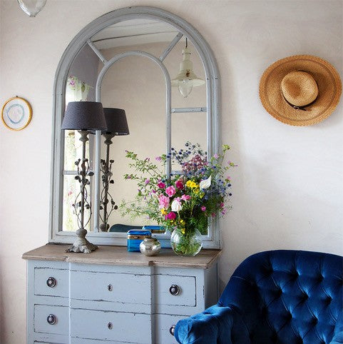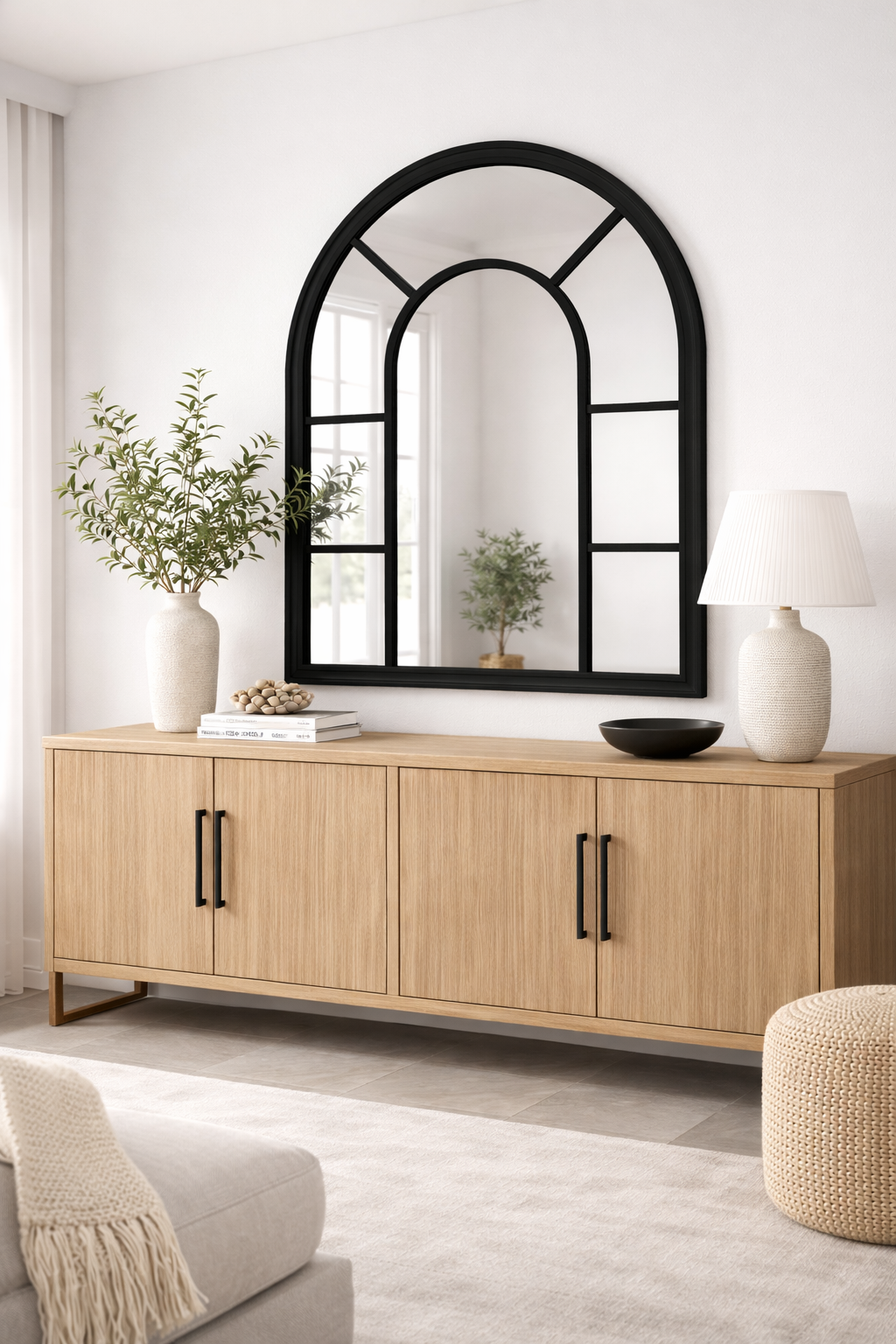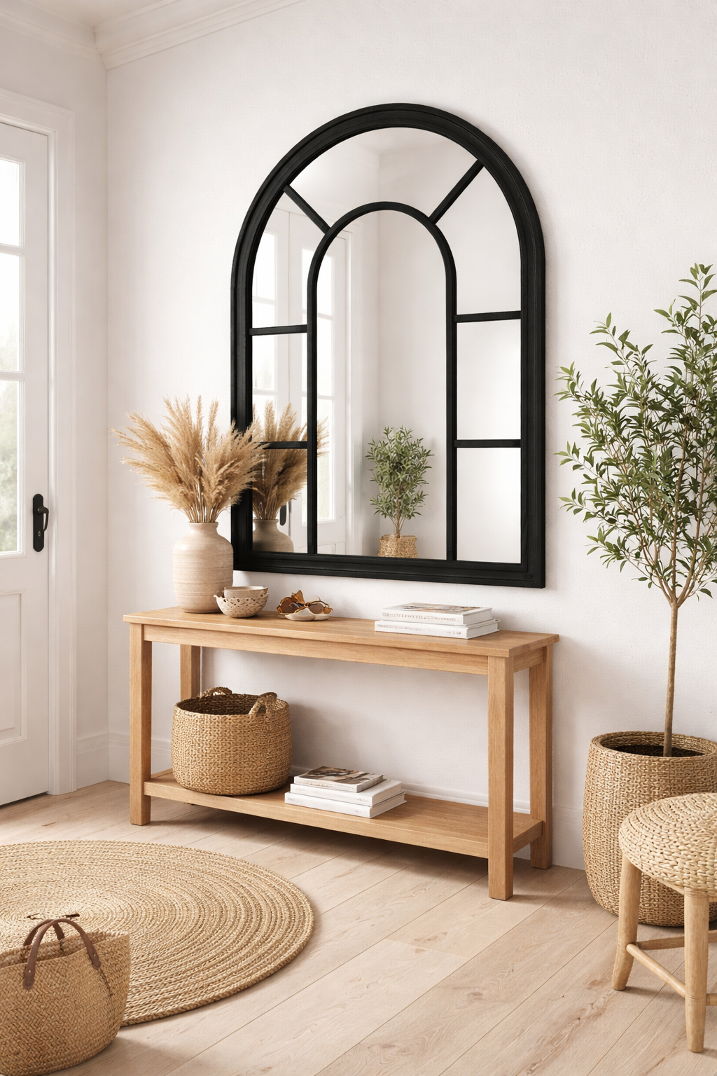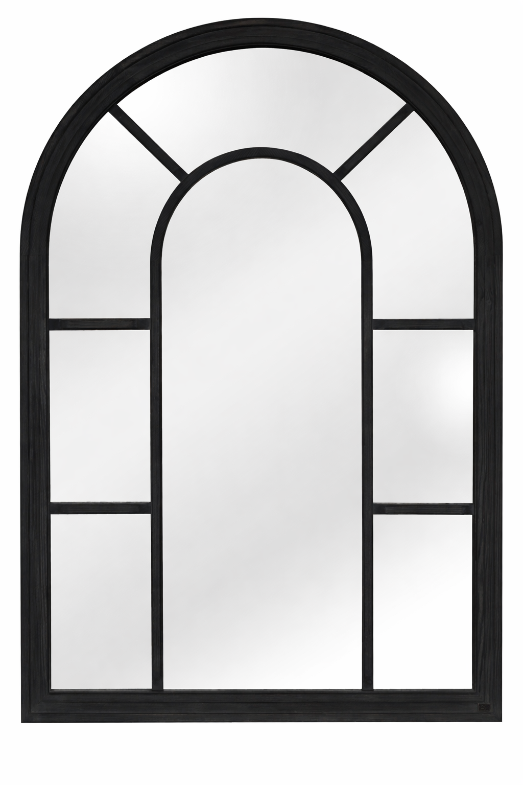 מראת קיר מעוצבת בקשת ייחודית בסגנון חלון, עם מסגרת עץ שחורה וגימור יוקרתי.