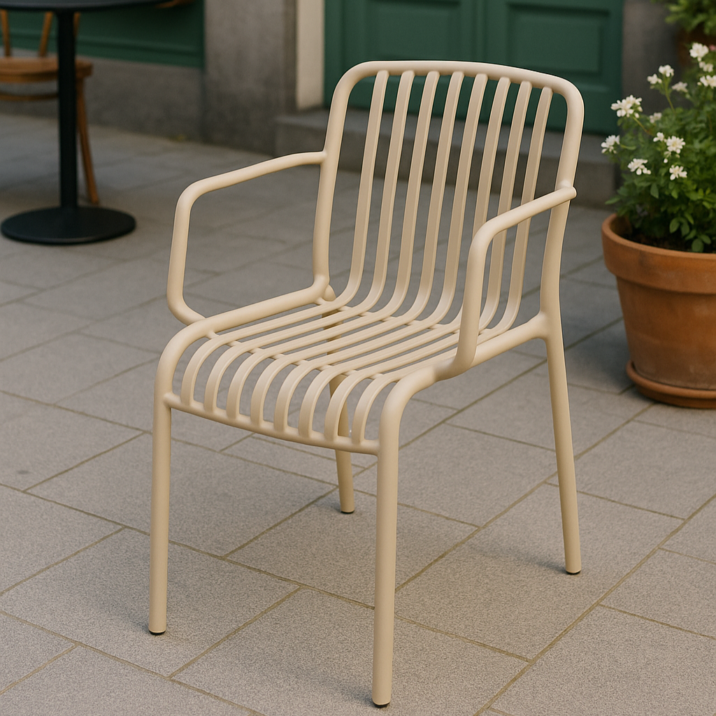 כסא אירוח למשרד או למרפסת, גוף פלסטיק בצבע קרם ,נס קפה עם ידיות