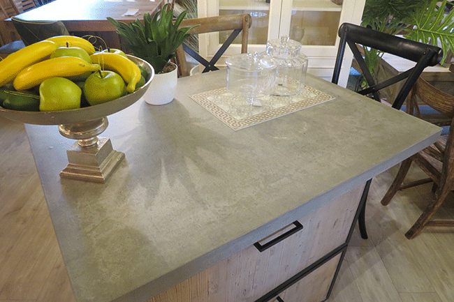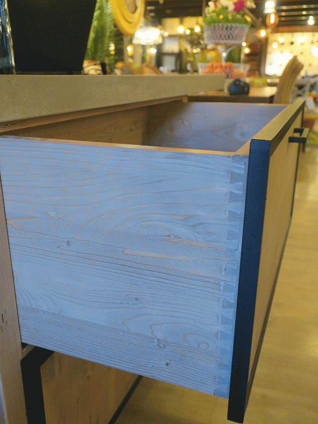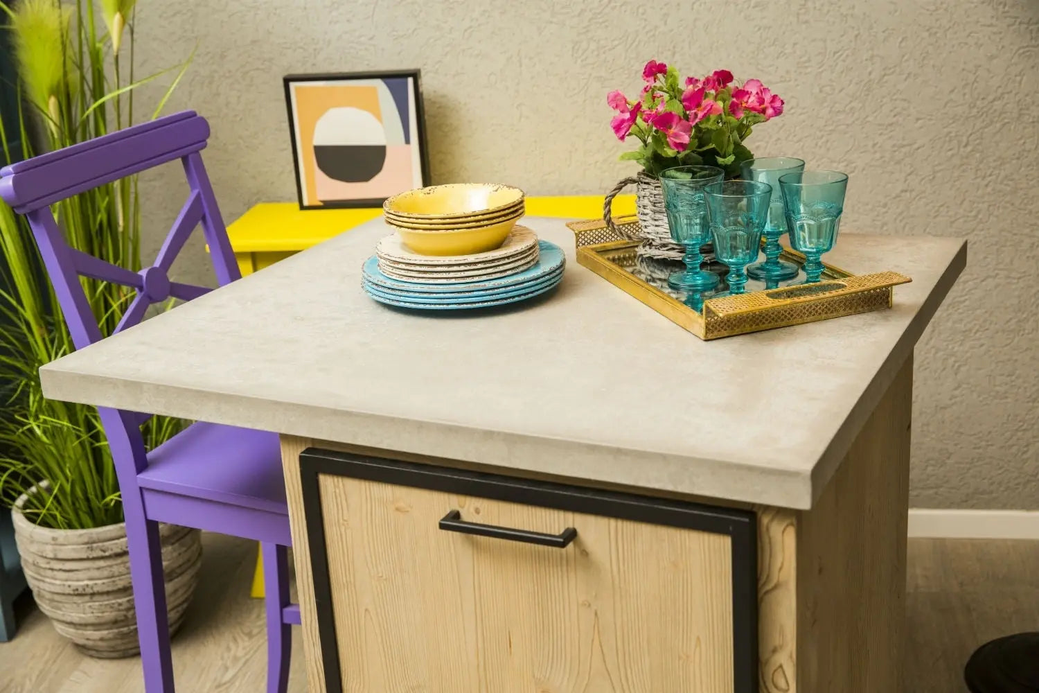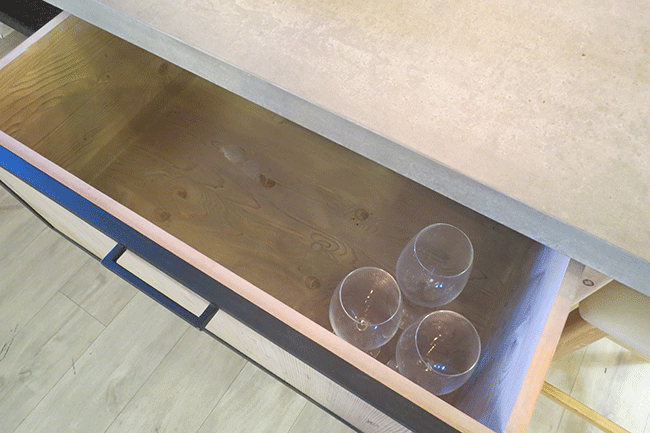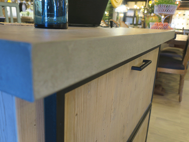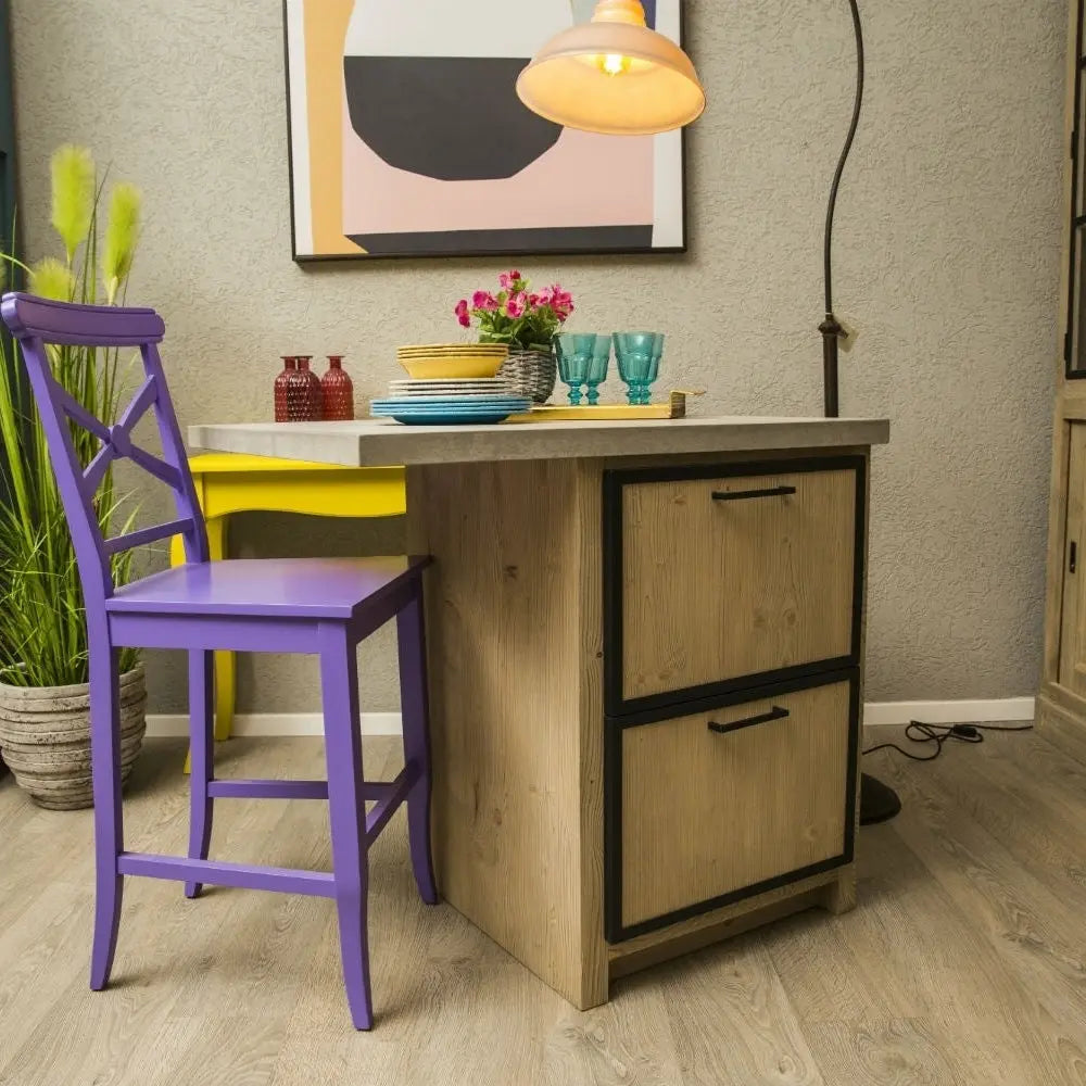 אי למטבח עשוי עץ מלא בעל שטח אחסון גדול הכולל 2 מגירות בעלות טריקה שקטה ופירזול דקורטיבי להשלמת המראה האורבני. לאי פלטה מעוצבת ציפוי בטון היכולה לשמש כשטח עבודה נוסף למטבח ומקום אכילה לשניים עד שלושה סועדים. אי קטן ונייד היכול להפוך בקלות למקום מפגש אינטימי וחמים בבית.