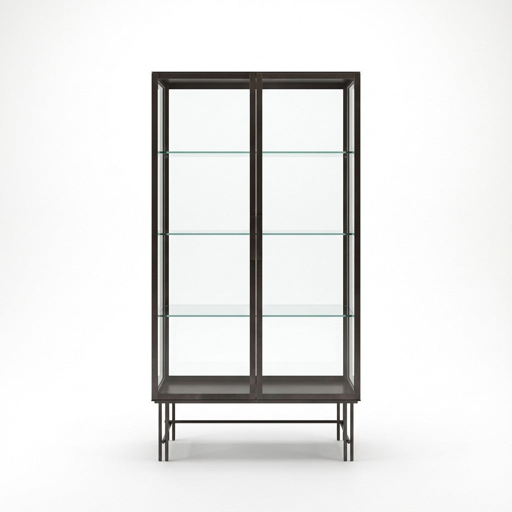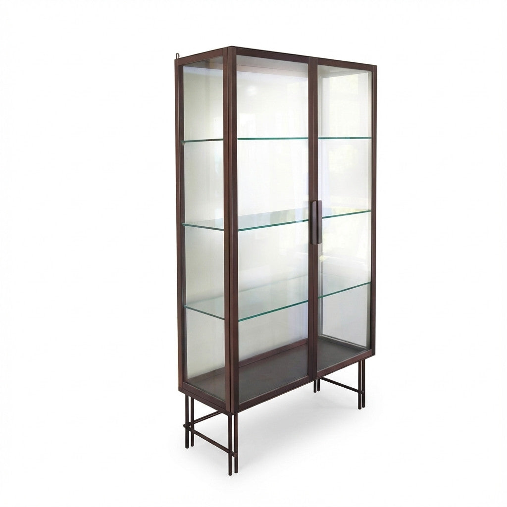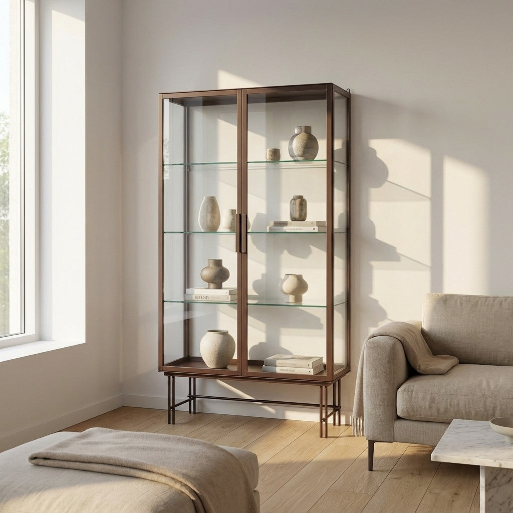 ויטרינת SOHO אלגנטית ומינימליסטית, עם מסגרת מתכת בצבע קפה ושילוב מדפי זכוכית שקופים ליצירת מראה קליל ויוקרתי. אידיאלית להצגת פריטים מעוצבים בסלון, חדר עבודה או חלל מסחרי.