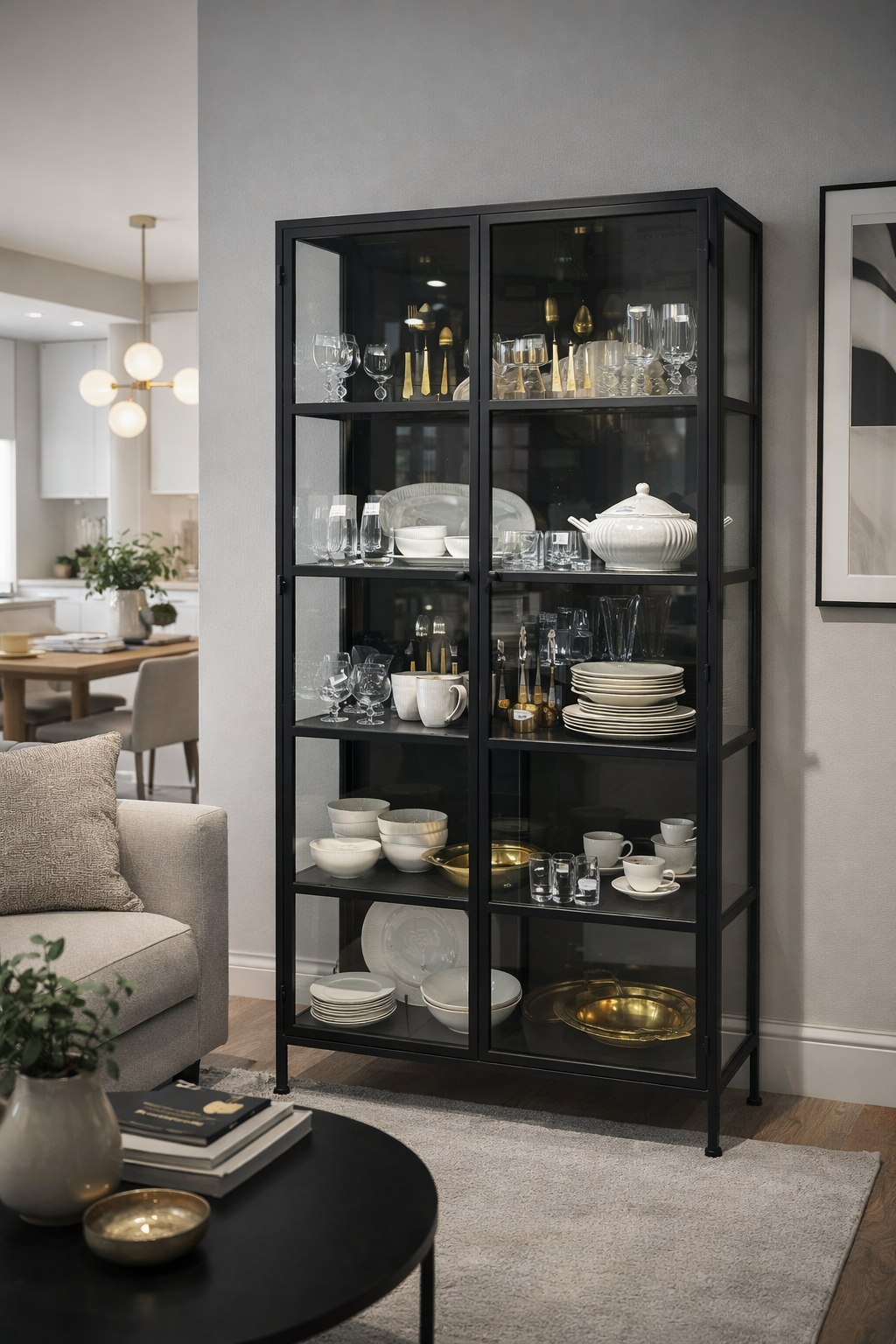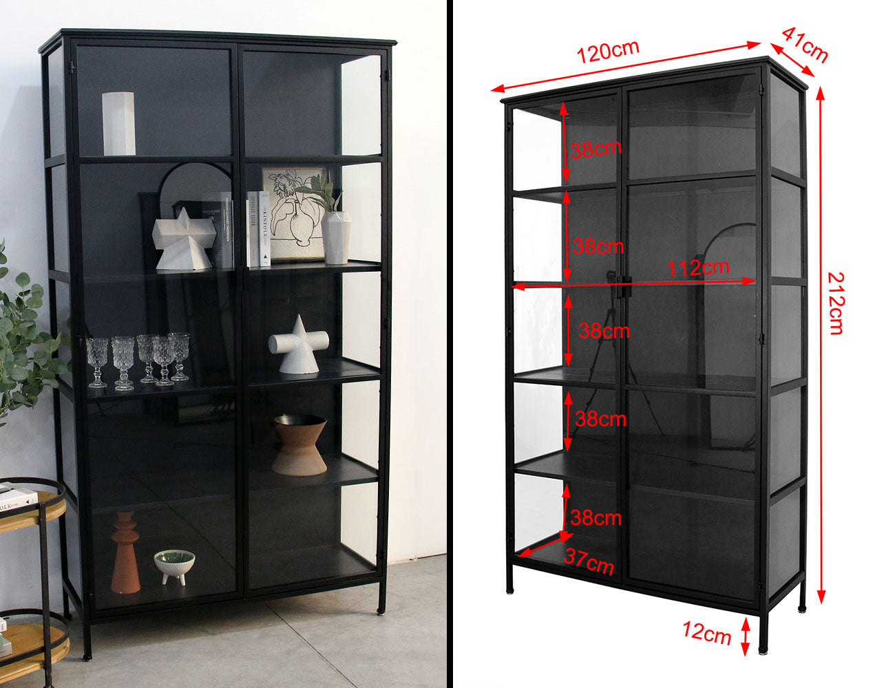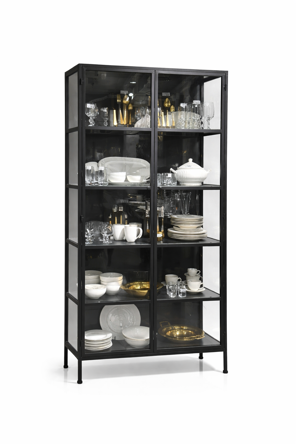 ויטרינה גבוהה בעיצוב תעשייתי־מודרני, עשויה שלדת מתכת שחורה בשילוב זכוכית כהה, ליצירת מראה אלגנטי ונוכח אך מאוזן.