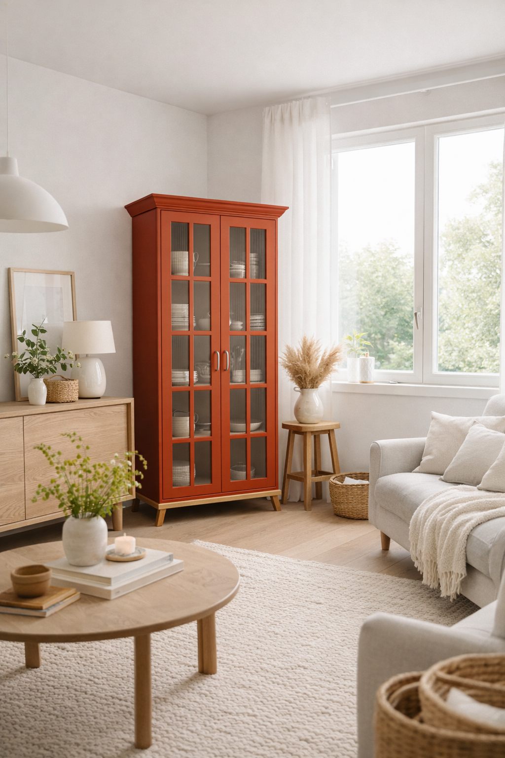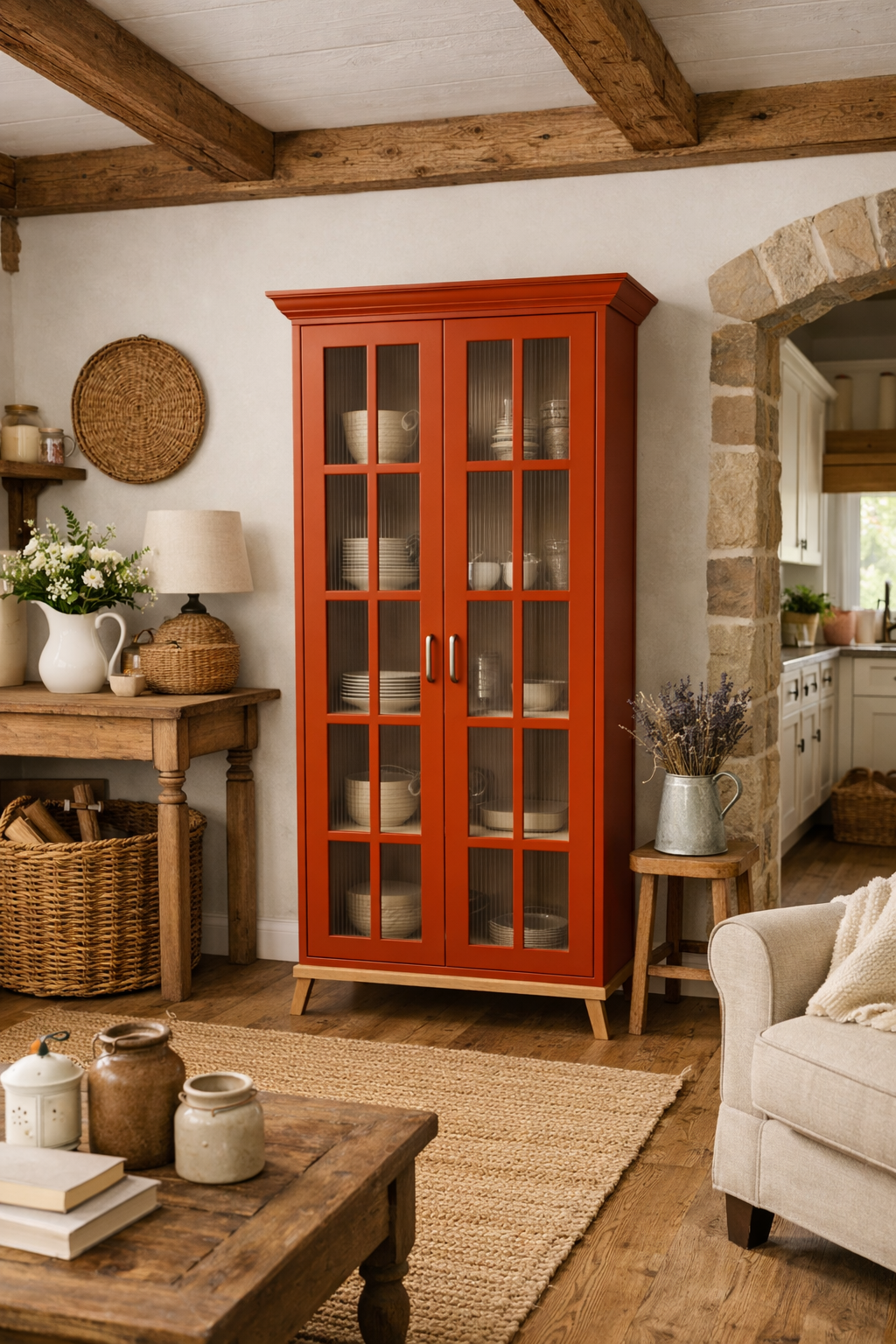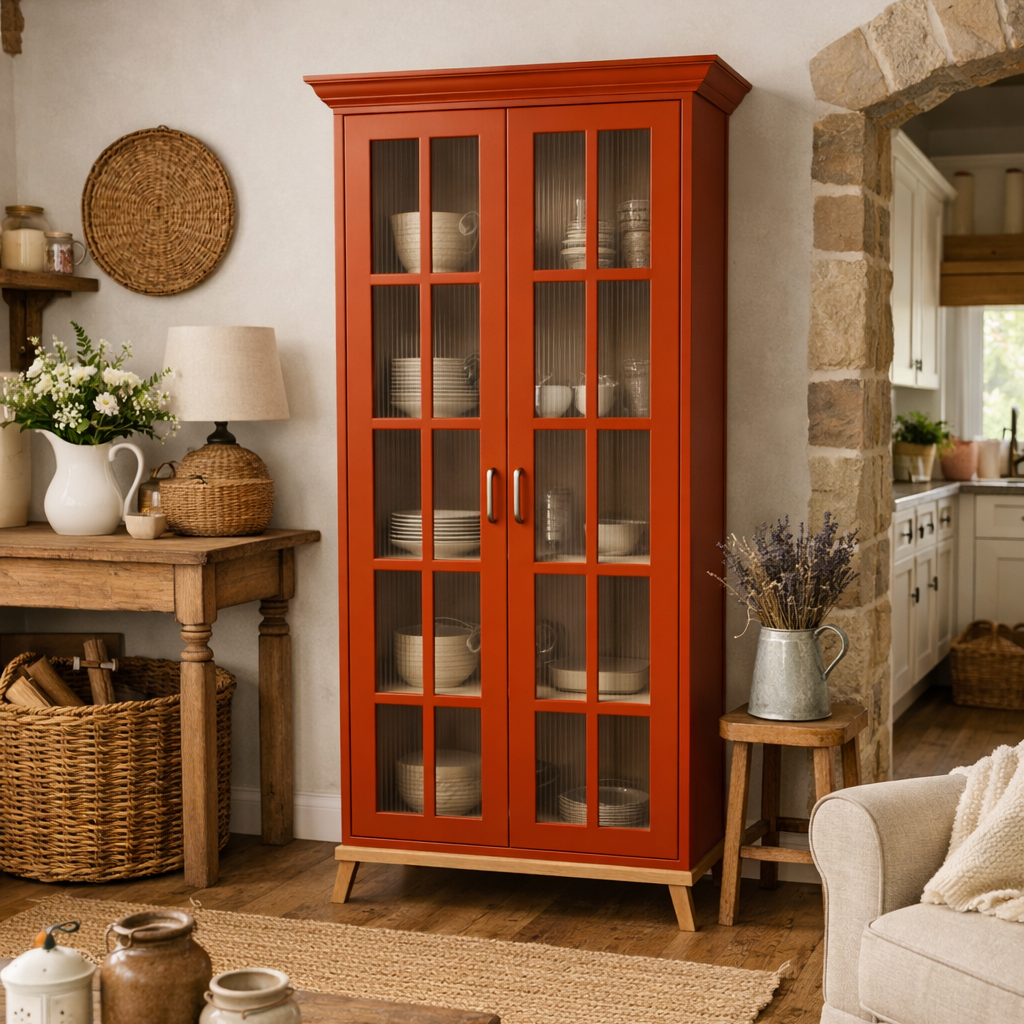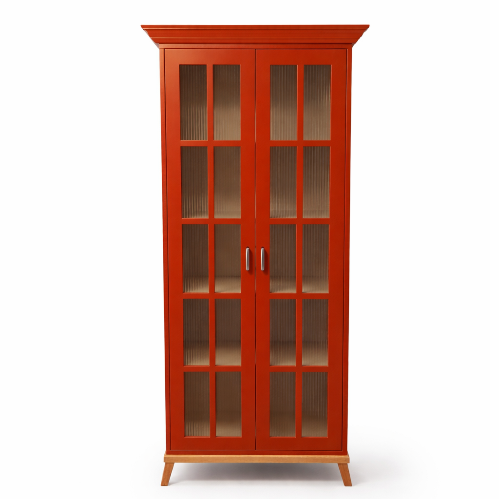 ויטרינה מרשימה בעיצוב ייחודי המשלב מראה רטרו קלאסי עם נגיעות נורדיות מודרניות. הארון צבוע בגוון אדום חם ועמוק, עם דלתות זכוכית מחוסמת בטקסטורת פסים, המאפשרות הצצה עדינה לתכולה תוך שמירה על מראה אלגנטי.