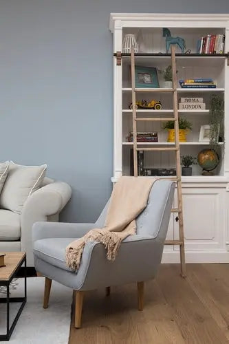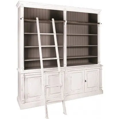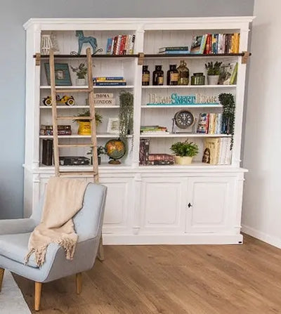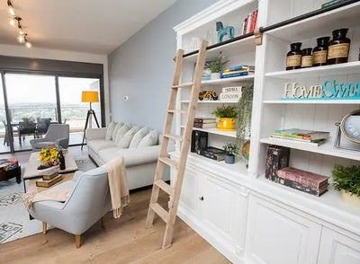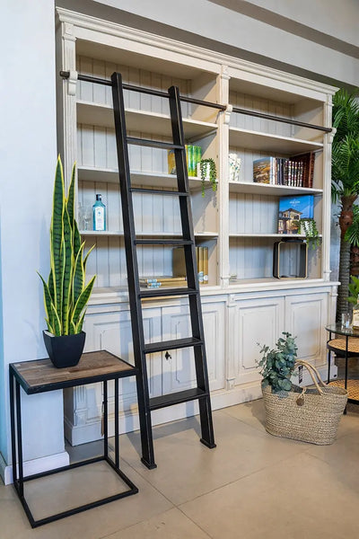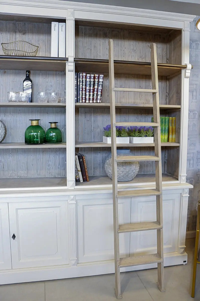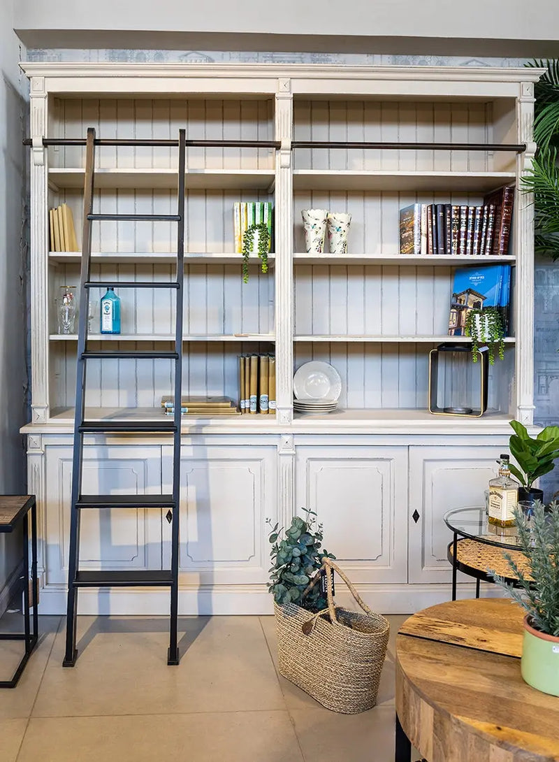 לספרייה המרשימה סולם דקורטיבי ושימושי המאפשר גישה נוחה למדפים העליונים.