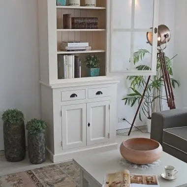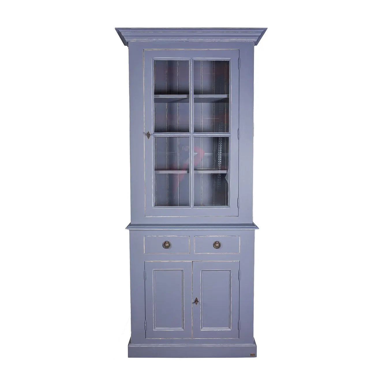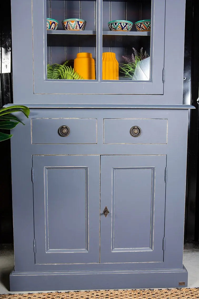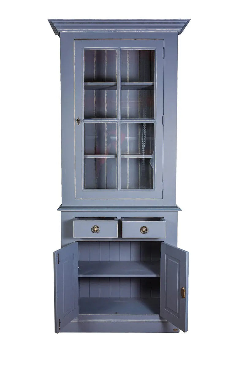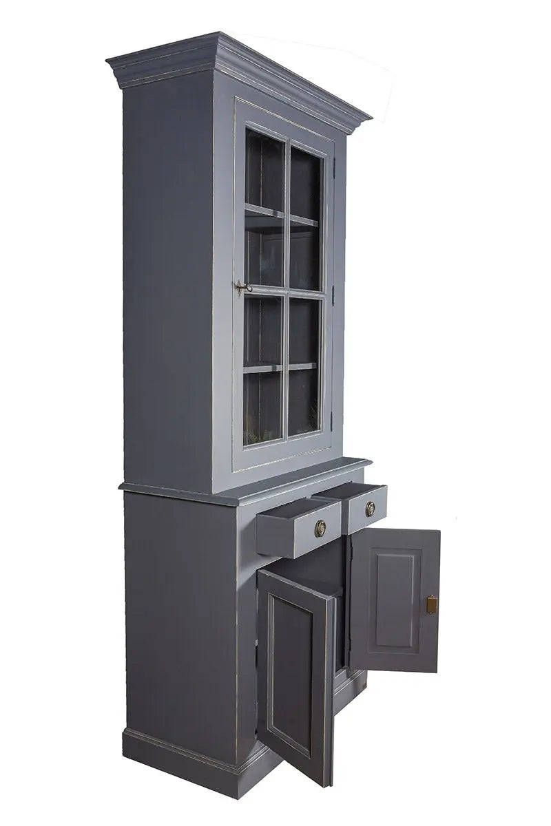 ויטרינה זכוכית המורכבת מ-2 חלקים: דלת זכוכית עליונה היושבת על ארונית בעלת 2 דלתות מעץ.