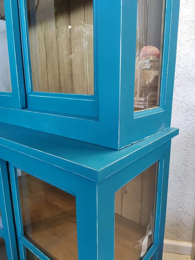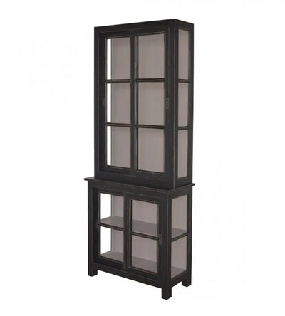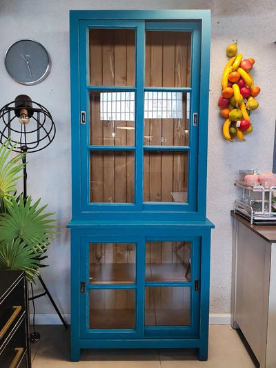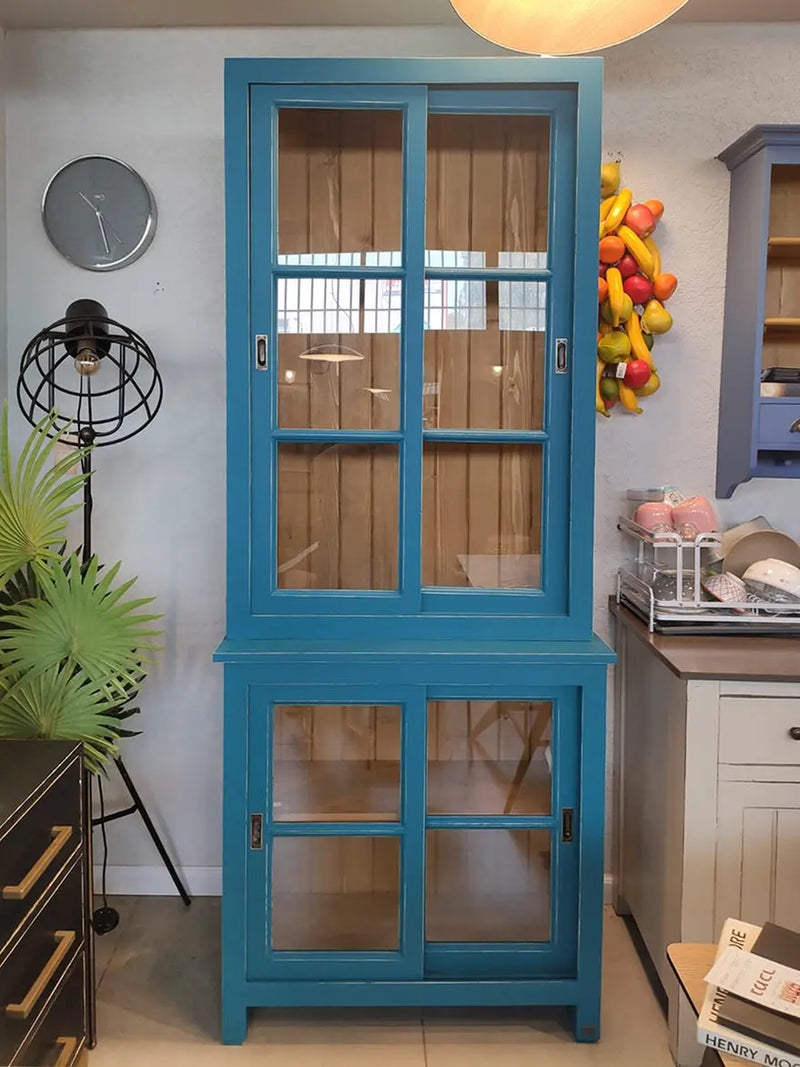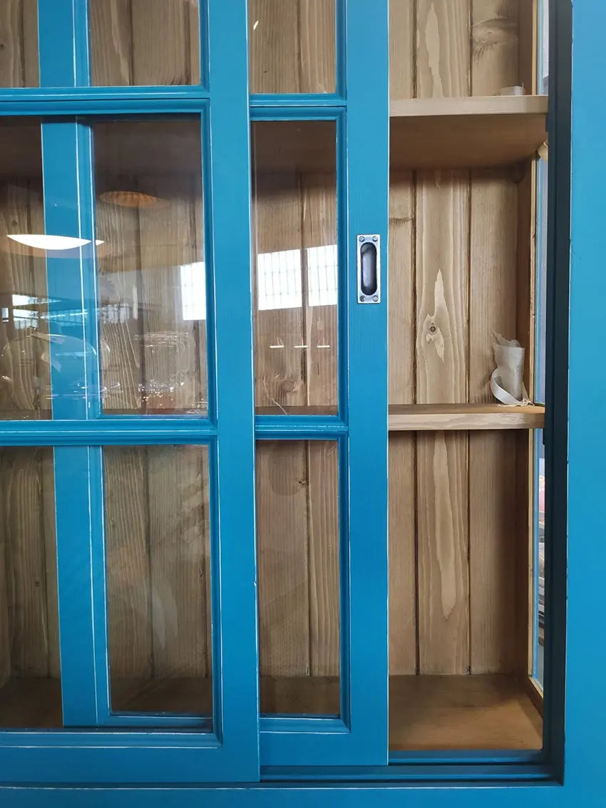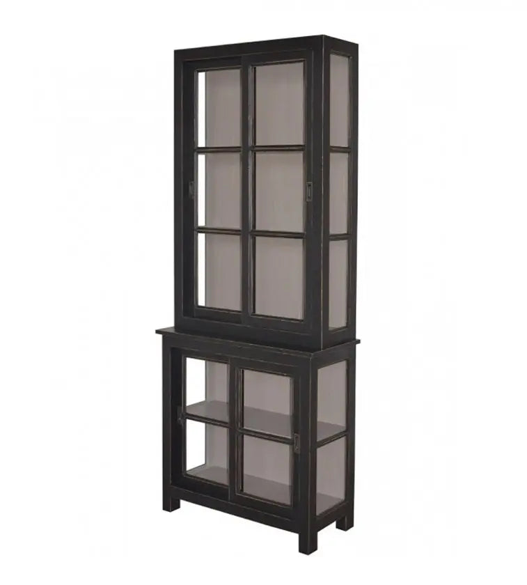 ויטרינה זכוכית המורכבת משני חלקים נפרדים בעלי דלתות הזזה מזכוכית,