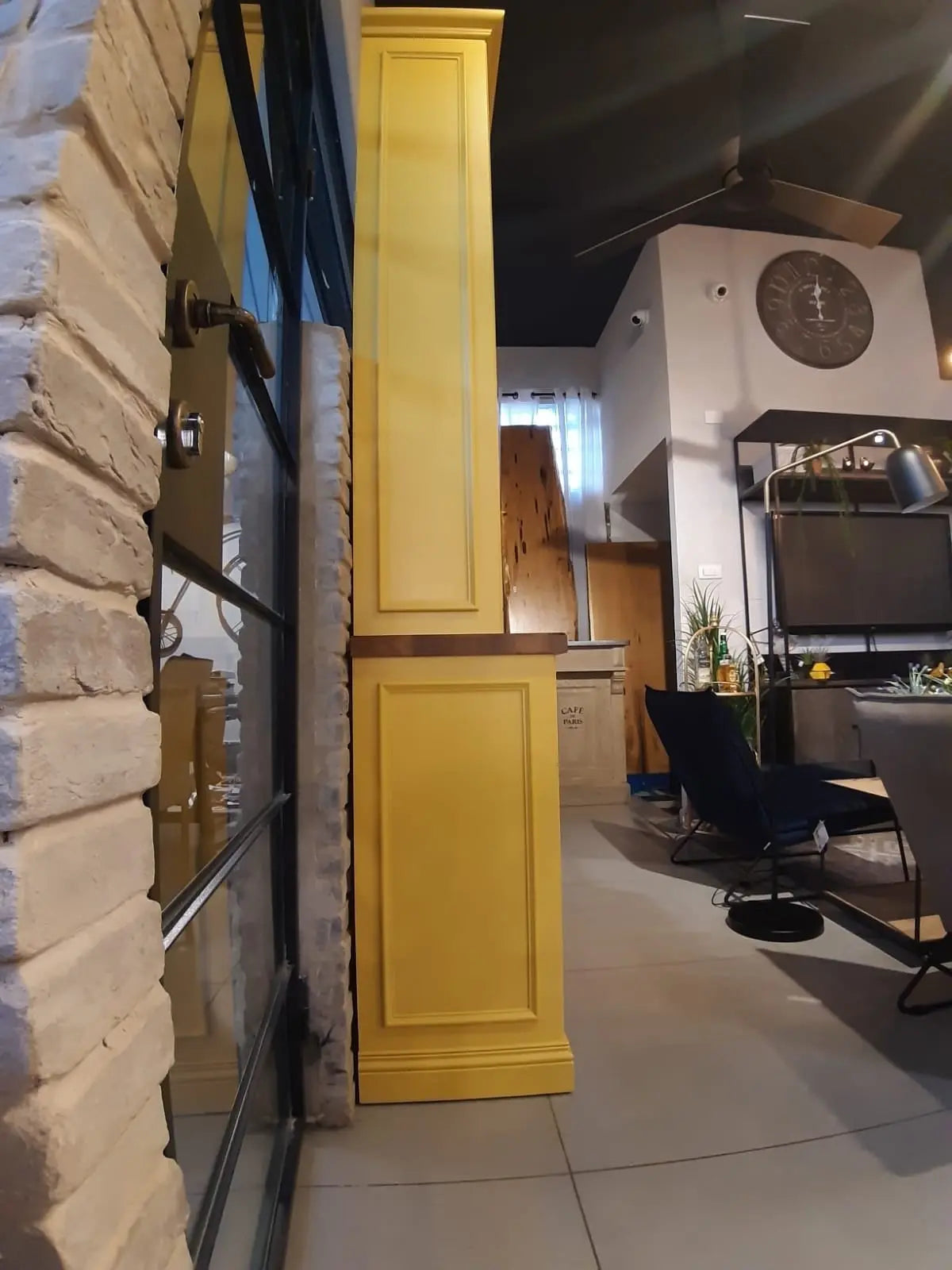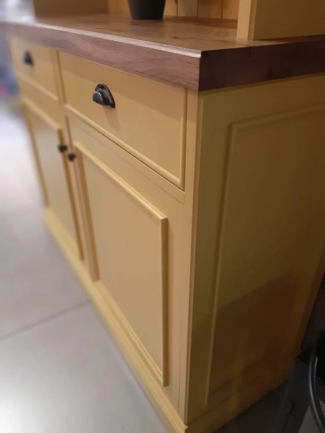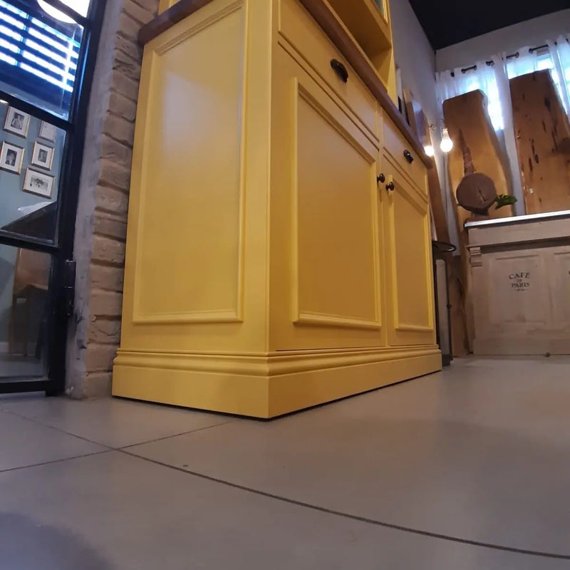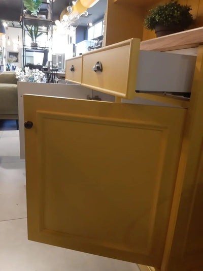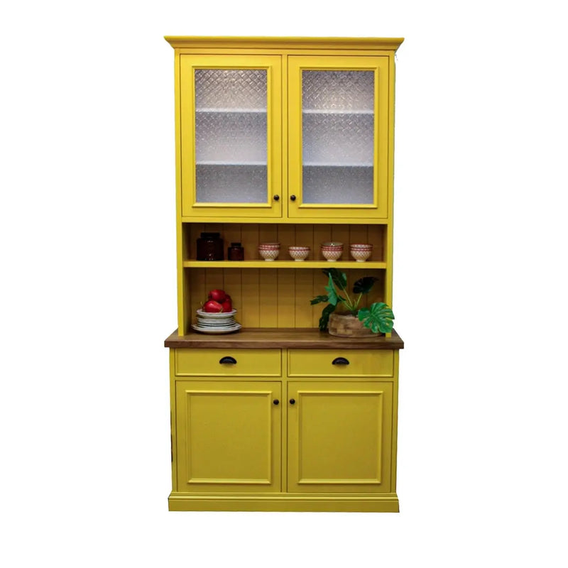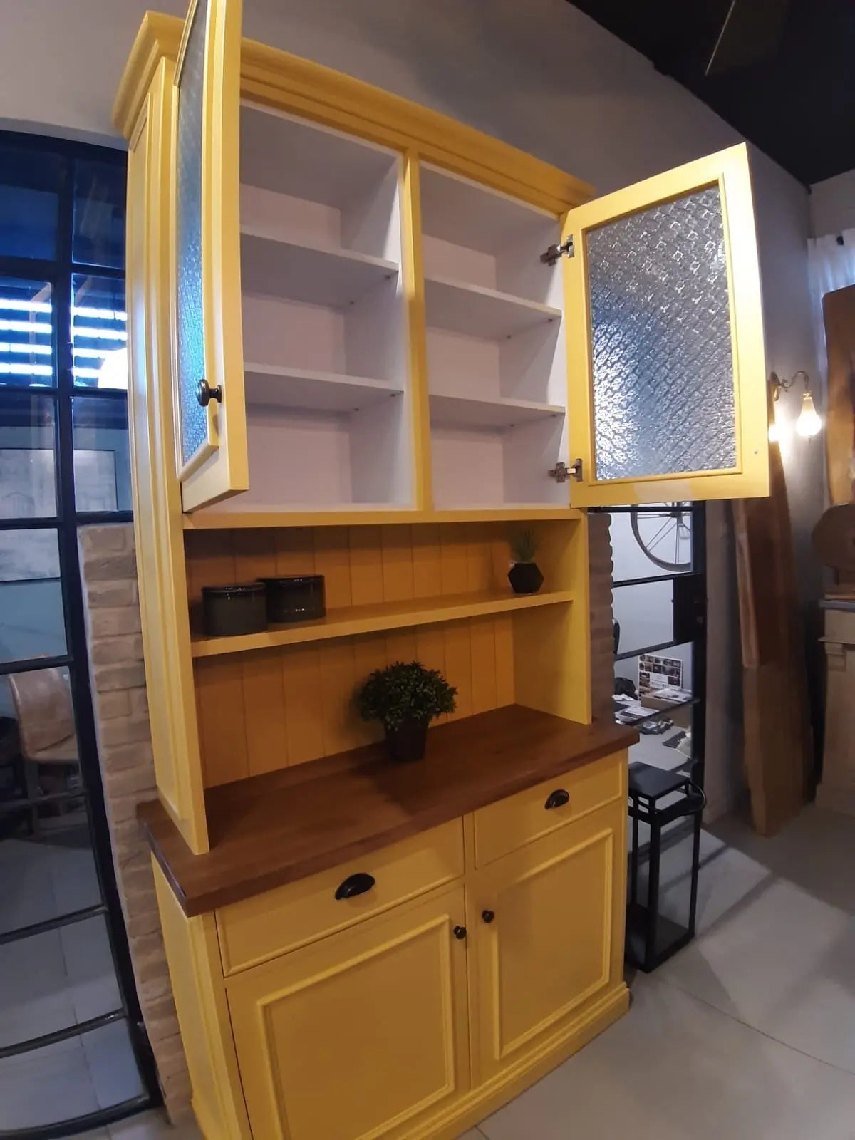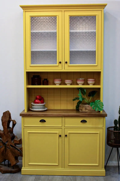 ויטרינה כפרית בעיצוב קלאסי עדכני, עשויה עץ אלון מלא, בשילוב MDF ירוק וסנדביץ.