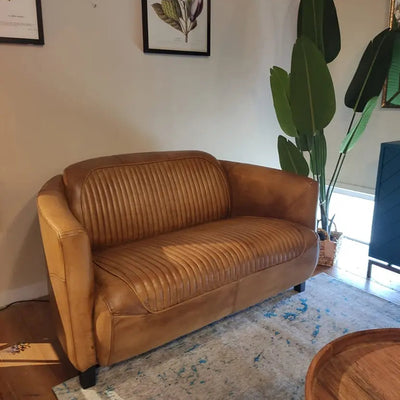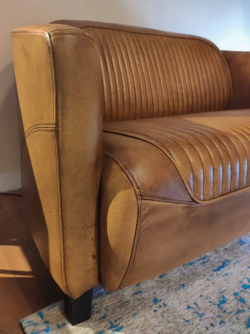 כורסת עור זוגית דגם מאזרטי צבע קוניאק עמוק. עיצוב קלאסי מלא נוכחות, יוקרה ועוצמה שלא נשארים אדישים אליה