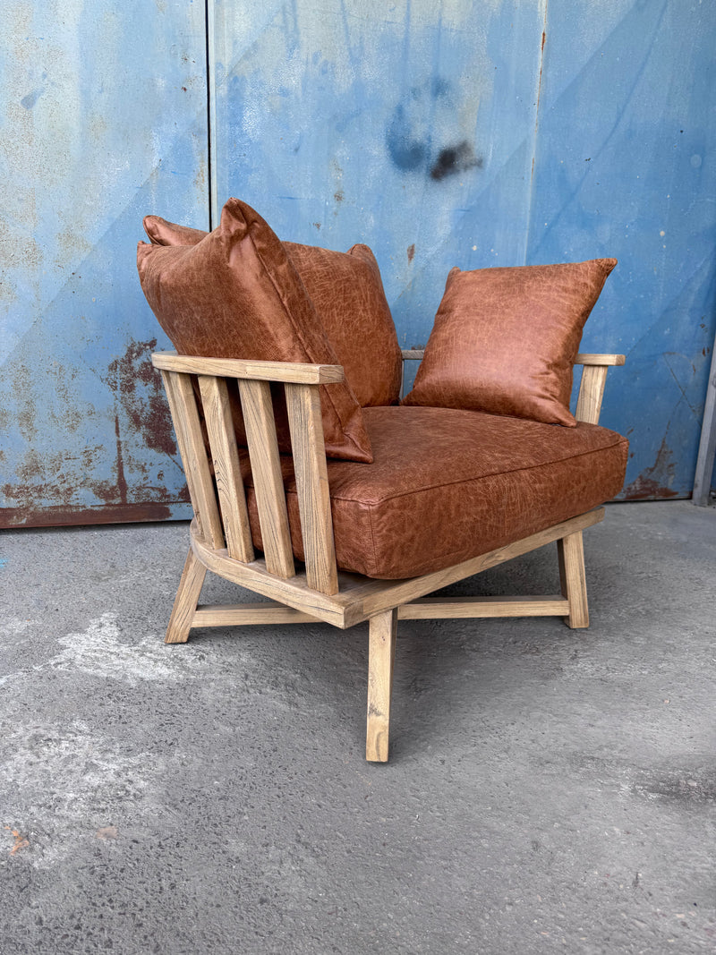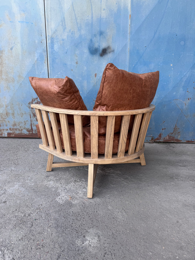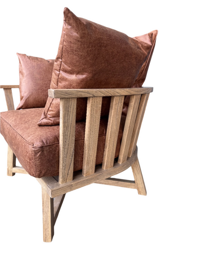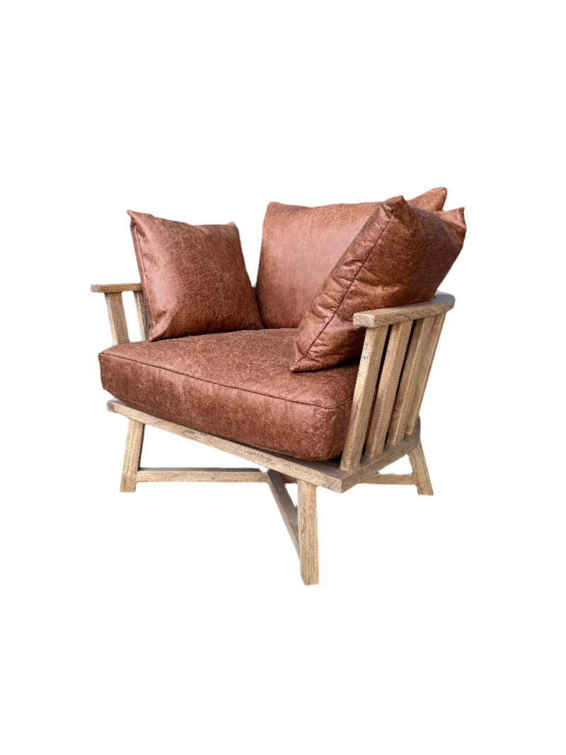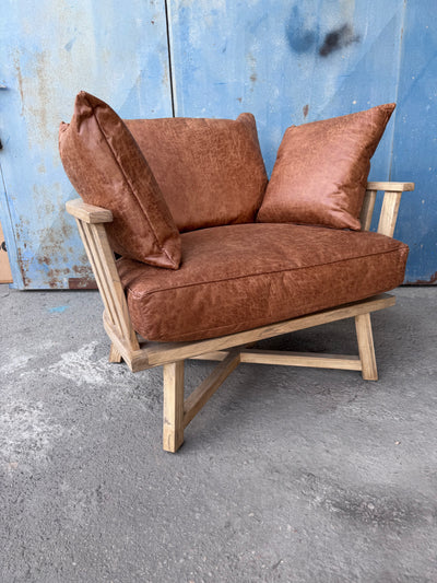 כורסא מעוצבת בסגנון אקלקטי, עשויה עץ מלא עם רפיוד עור בגוון קוניאק איכותי עם רכות מלטפת.