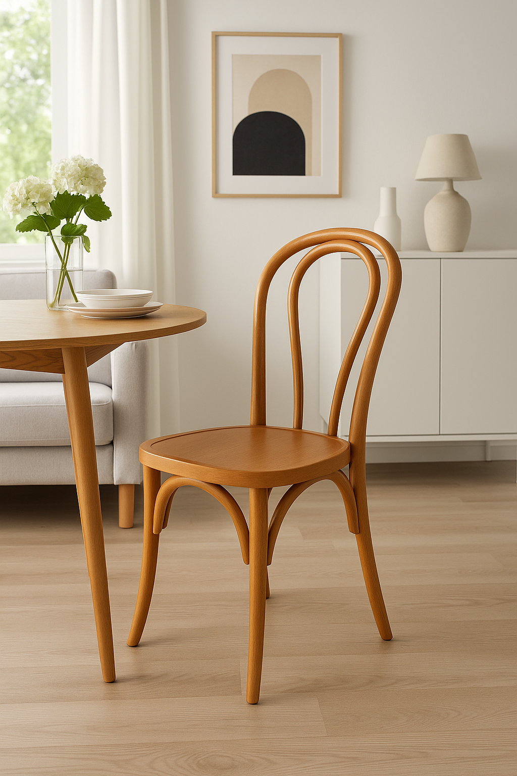 כיסא בעיצוב אייקוני על-זמני, המשלב אלגנטיות אירופית עם חמימות עץ טבעי. עשוי בעבודת עץ מוקפדת בשיטת Bentwood – כיפוף עץ באדים, המקנה לו קווים רכים ועמידות גבוהה לאורך שנים.