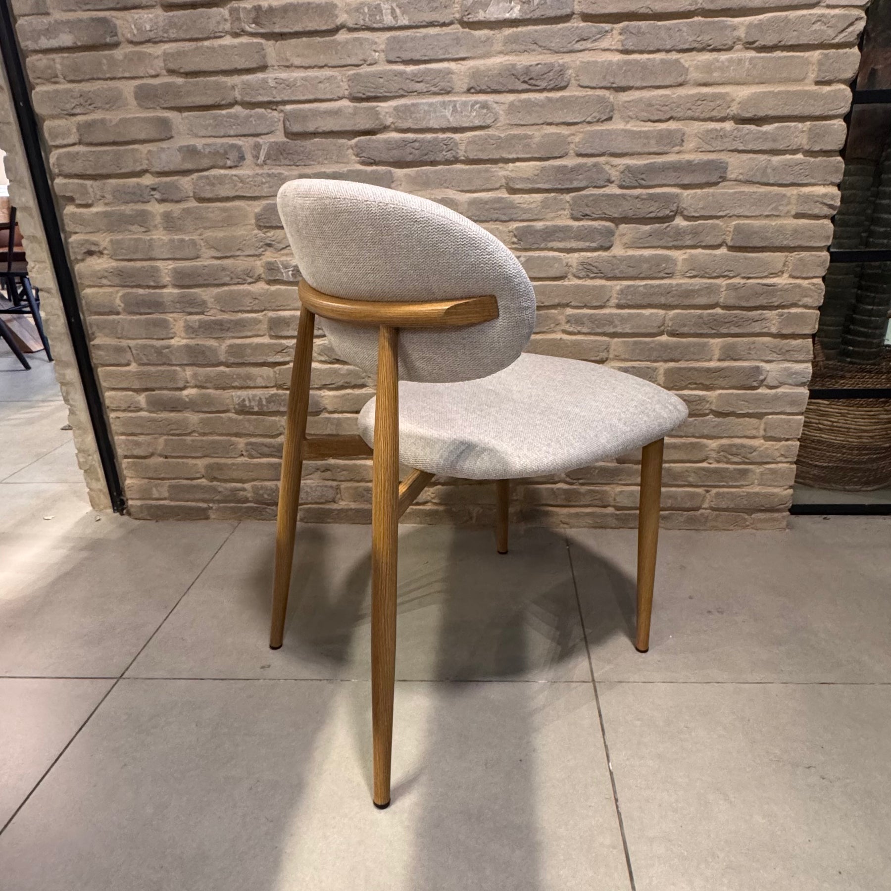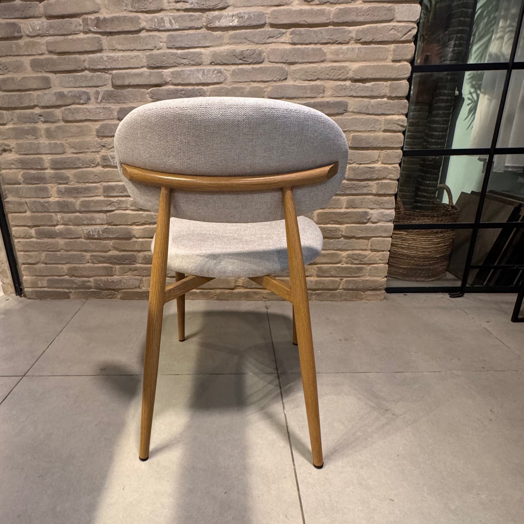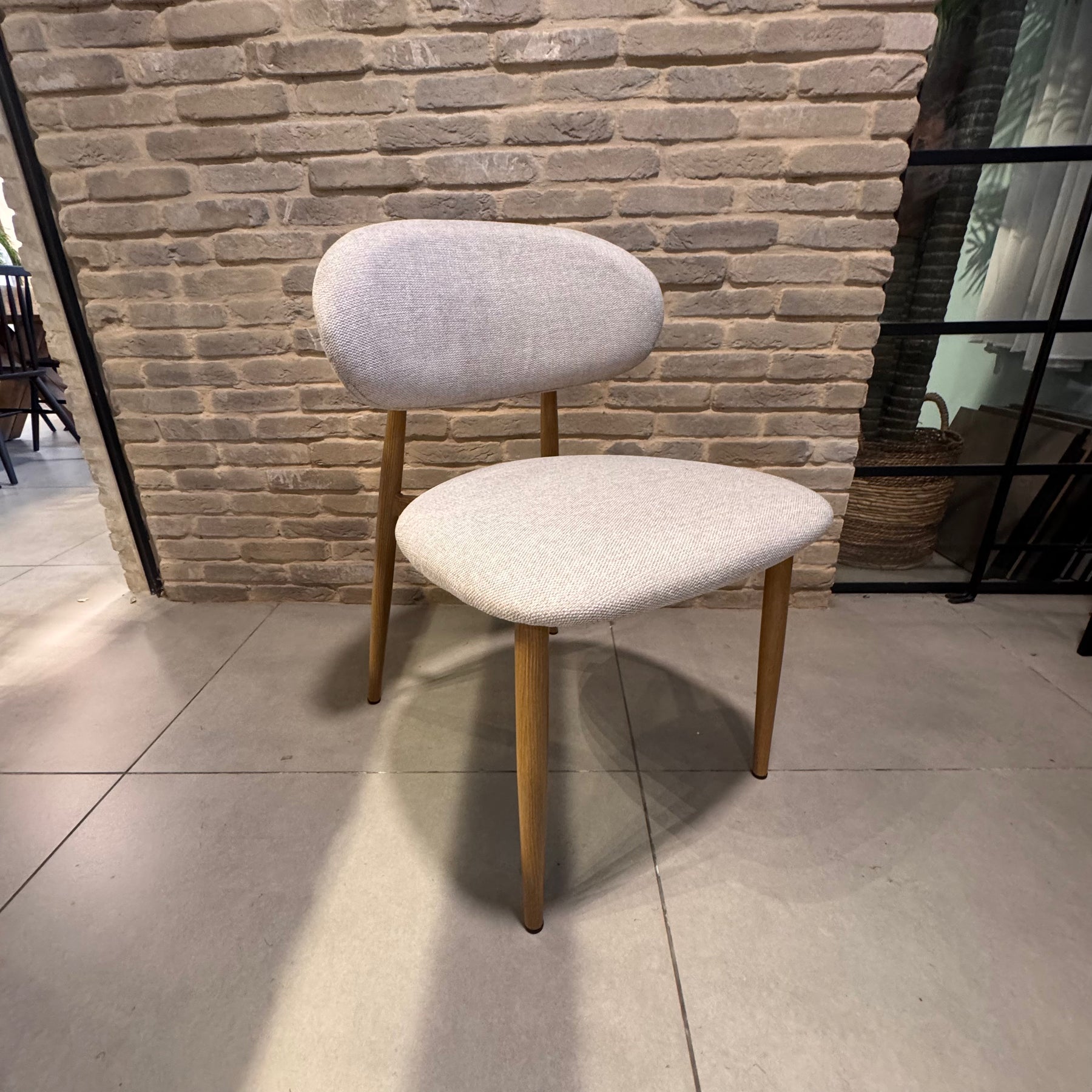 .כסא מעוצב במראה נקי מרופד בבד בצבע בז, נעים למגע ונוח מאוד לישיבה