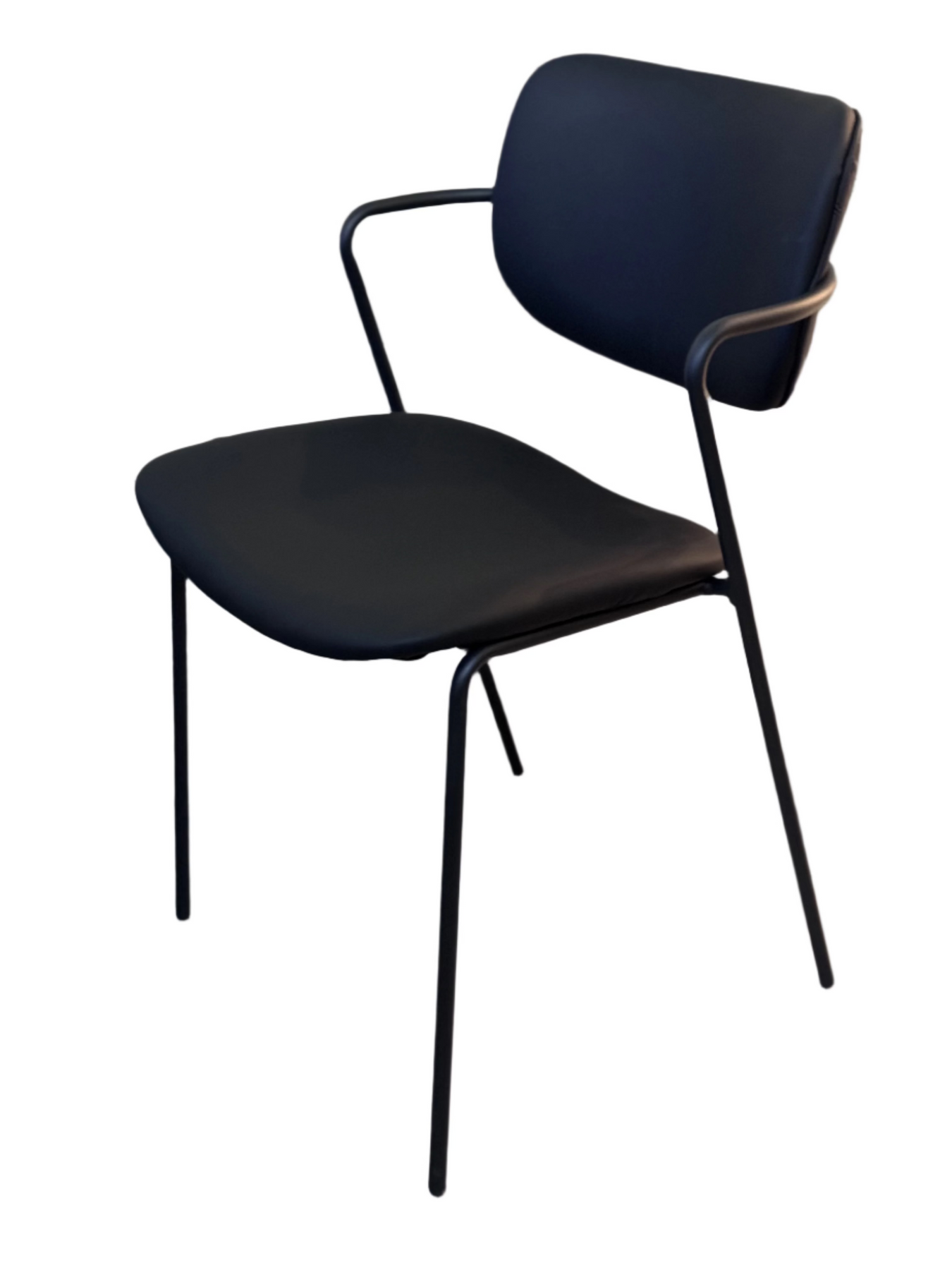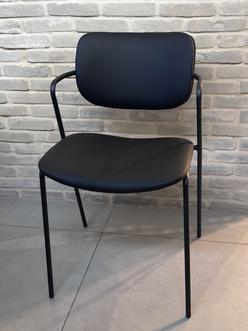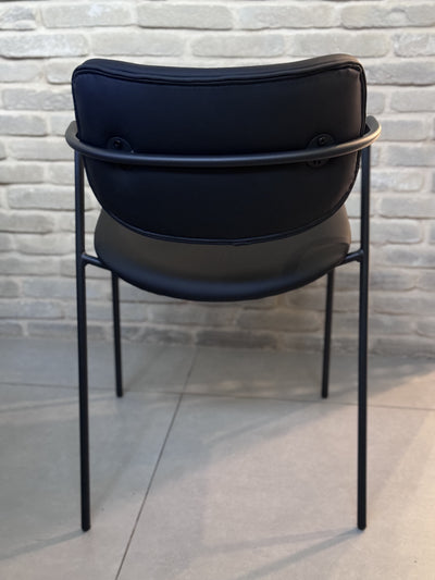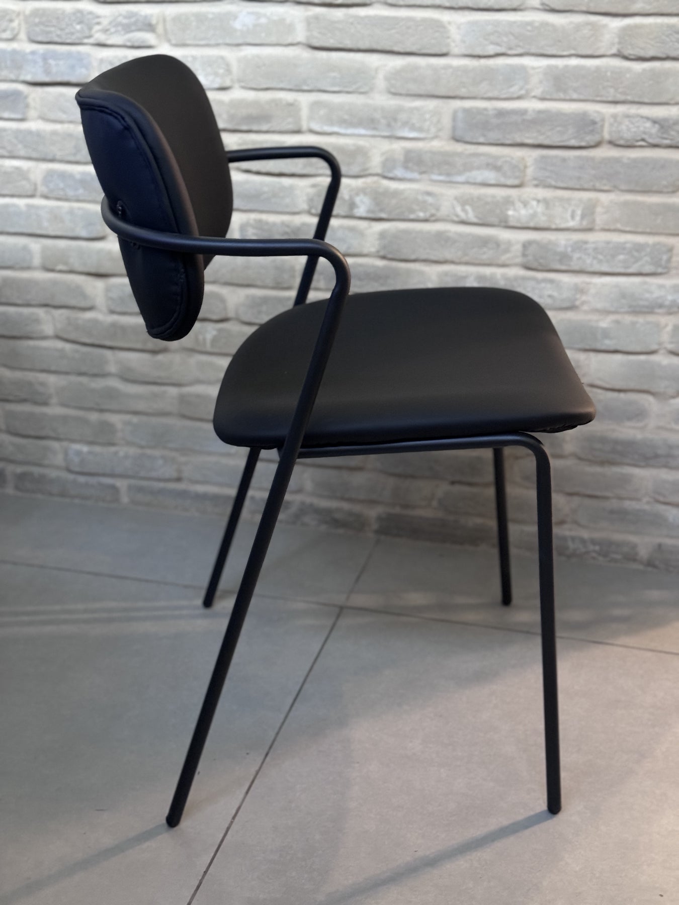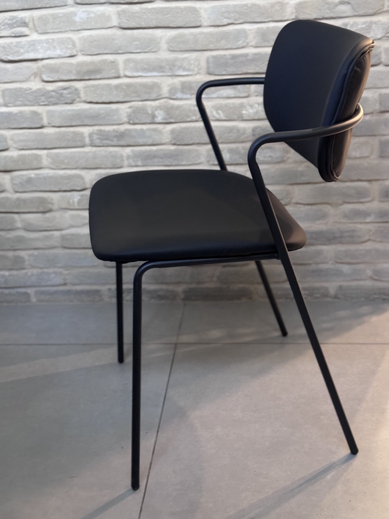 .כסא מעוצב במראה נקי עם ידיות קטנות, מרופד בבד דמוי עור שחור