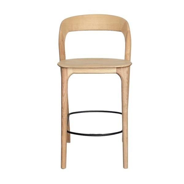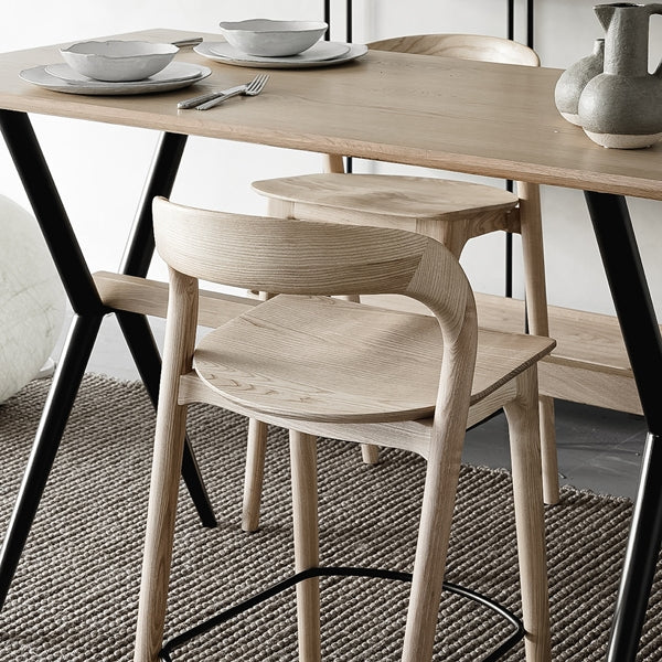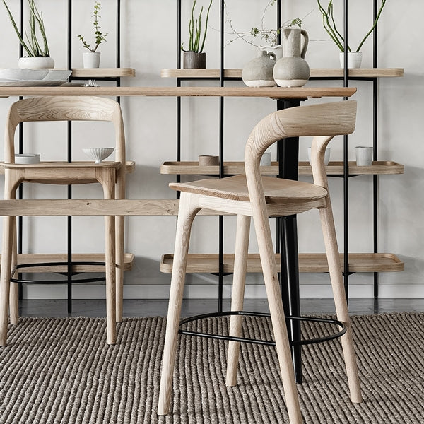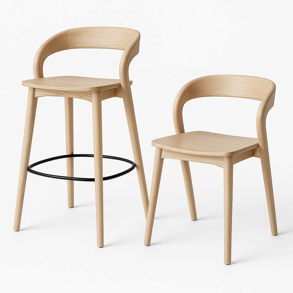 כיסאות בר וכיסאות אוכל בסגנון סקנדינבי מודרני, עשויים עץ בהיר עם קווים נקיים ואלגנטיים.