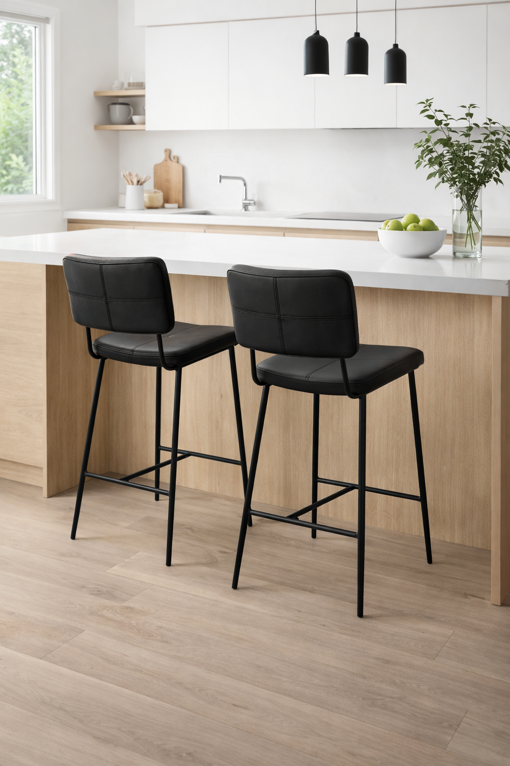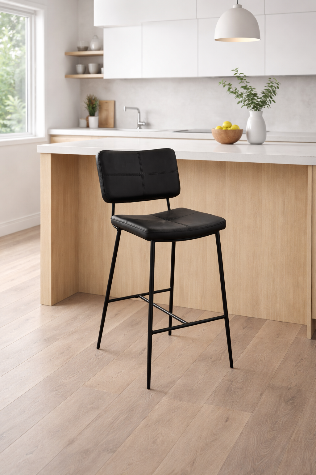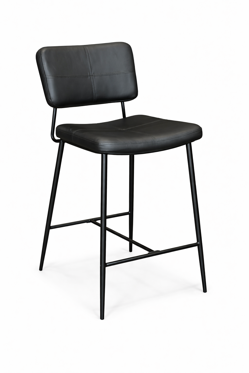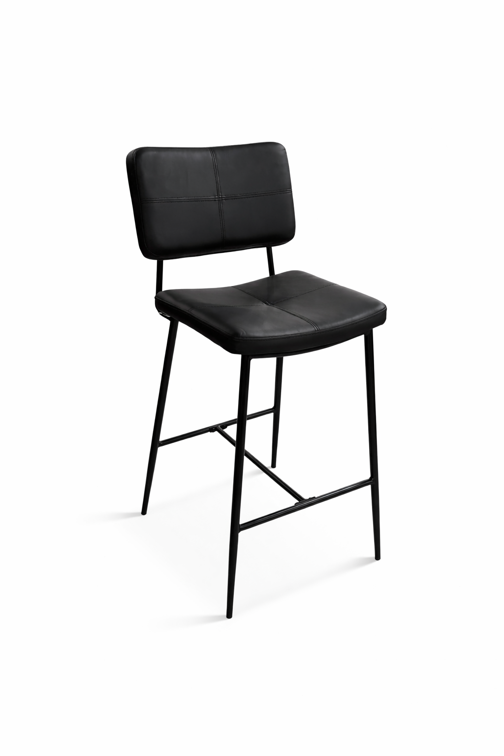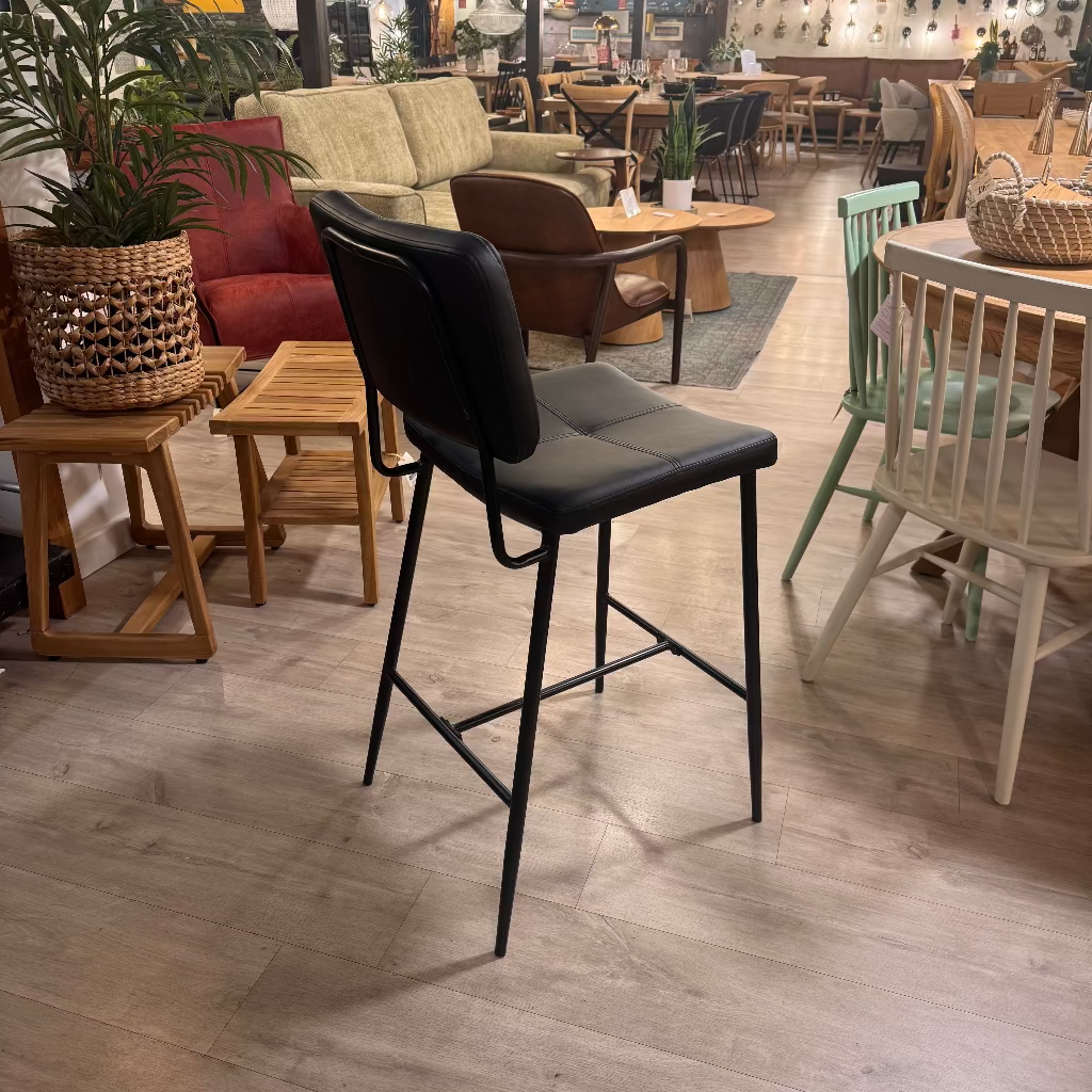כיסא בר אלגנטי בעיצוב מודרני ונקי, עם מושב וגב מרופדים לנוחות ישיבה גבוהה גם לאורך זמן. שילוב של ריפוד דמוי עור איכותי עם שלדת מתכת שחורה מעניק מראה יוקרתי ומעודכן, המתאים למטבח מודרני, אי, פינת אוכל גבוהה או בר ביתי.