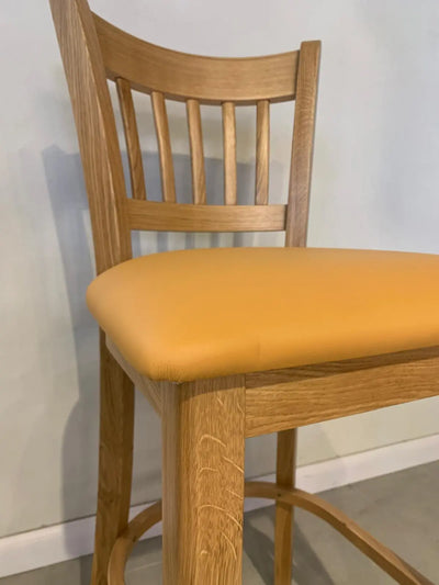 כסא בר מעץ אלון מלא בגוון טבעי בעיצוב כפרי.