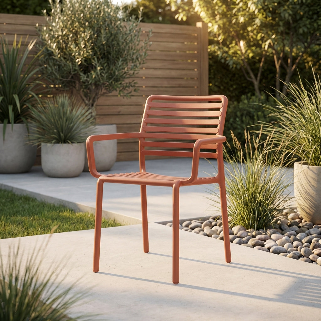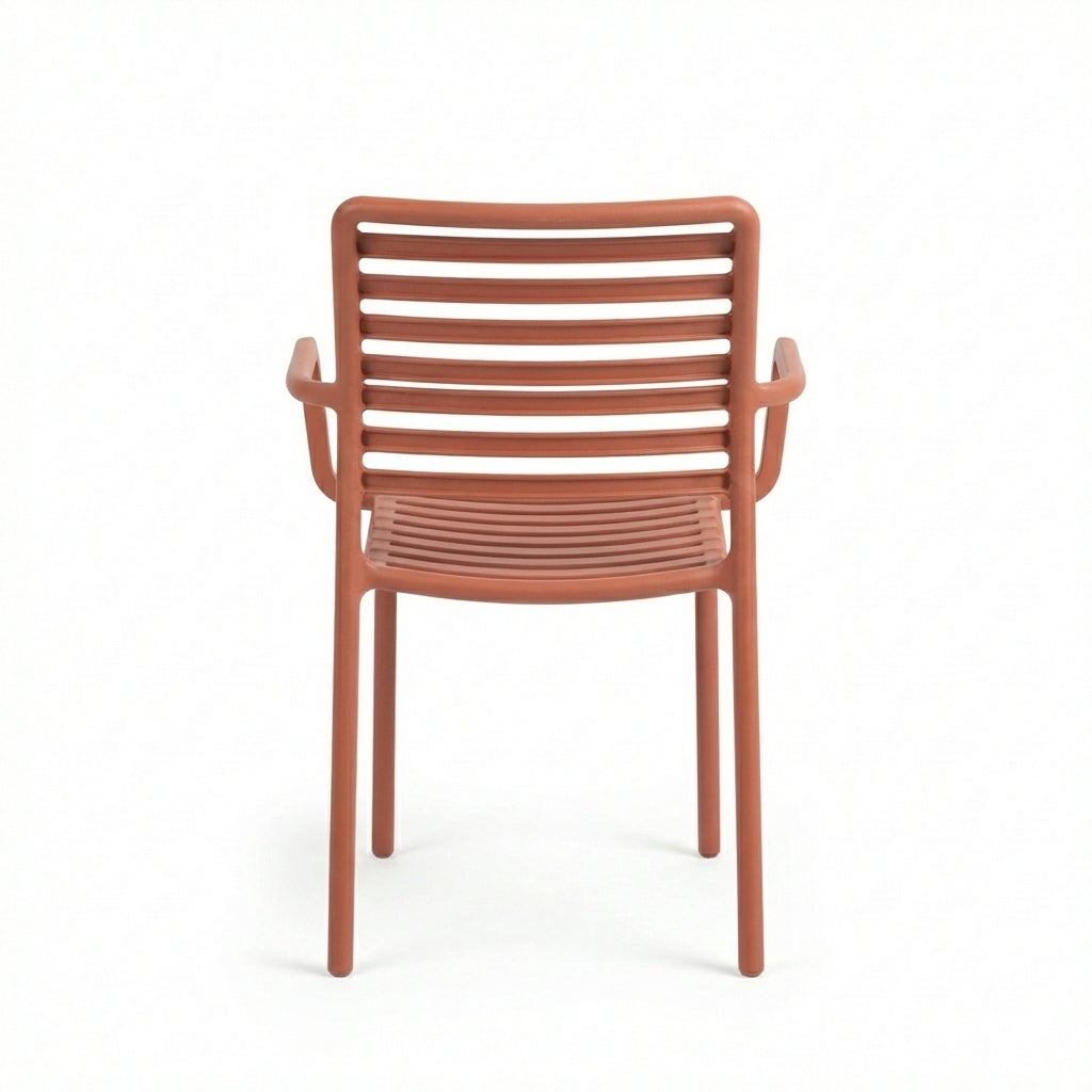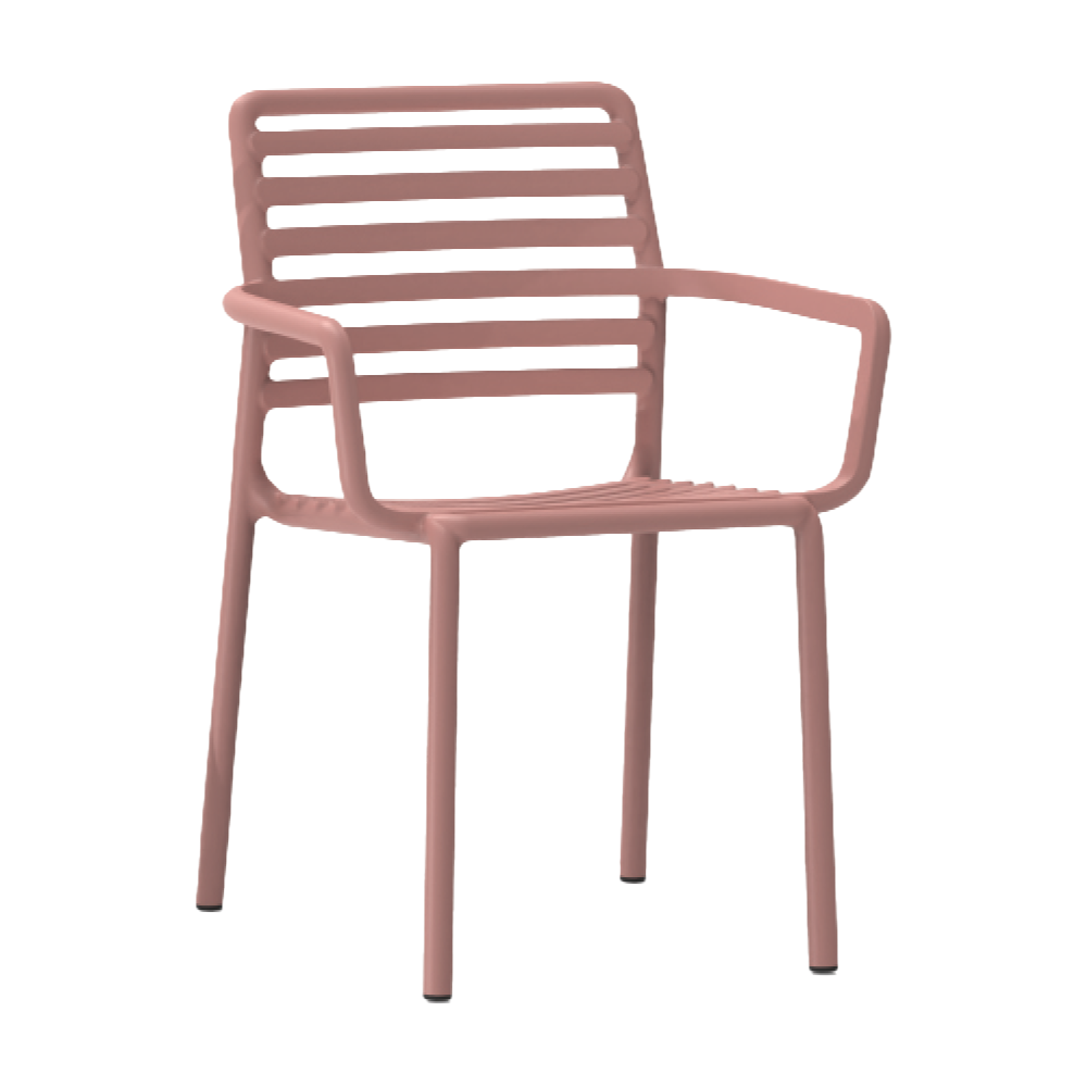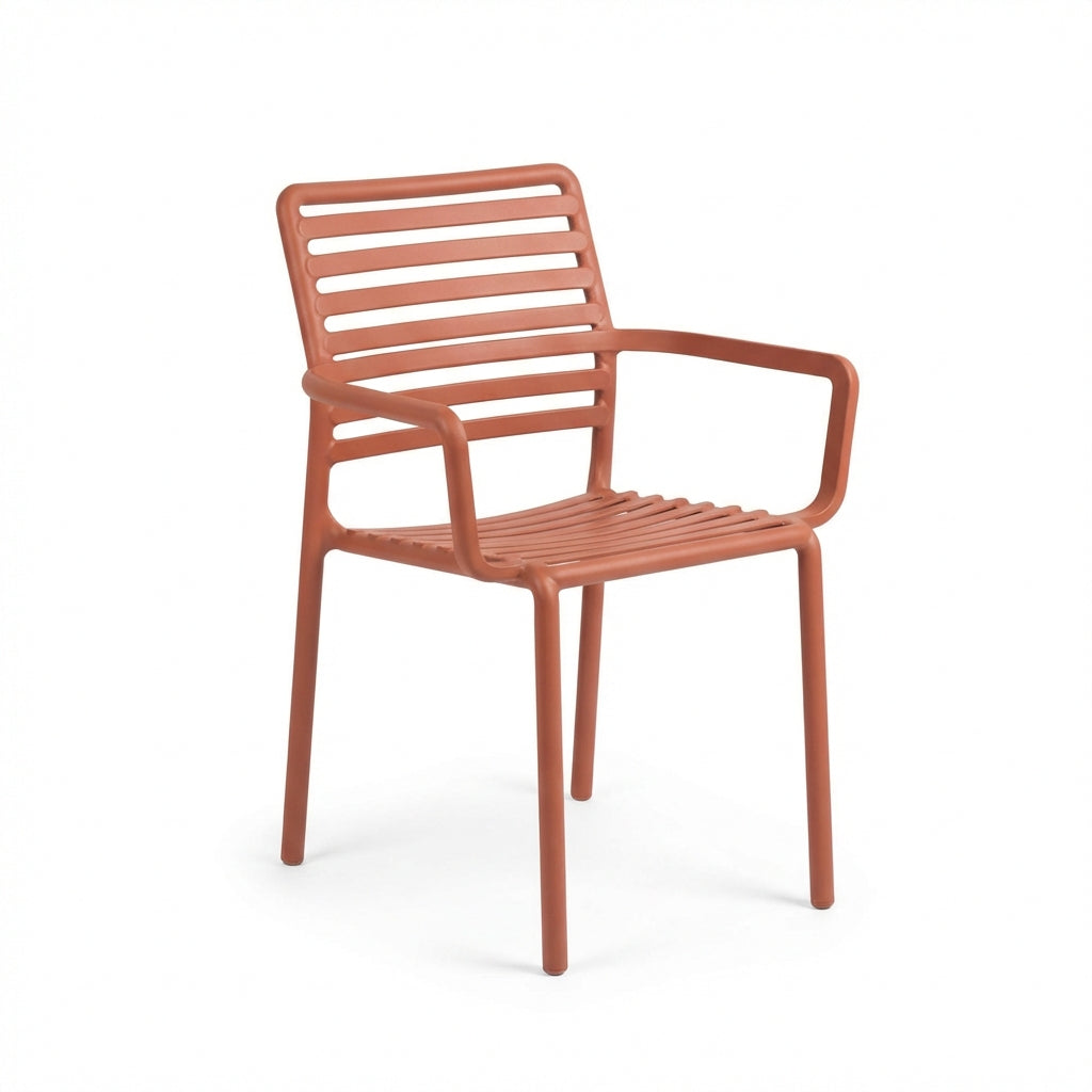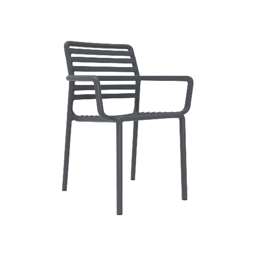 כיסא נוח עם ידיות בעיצוב קולקציית דוגה. עשוי פולימר עמיד המותאם לתנאי חוץ, כולל משענות ידיים לנוחות מוגברת. מתאים למסעדות ומרפסות.
