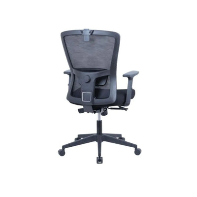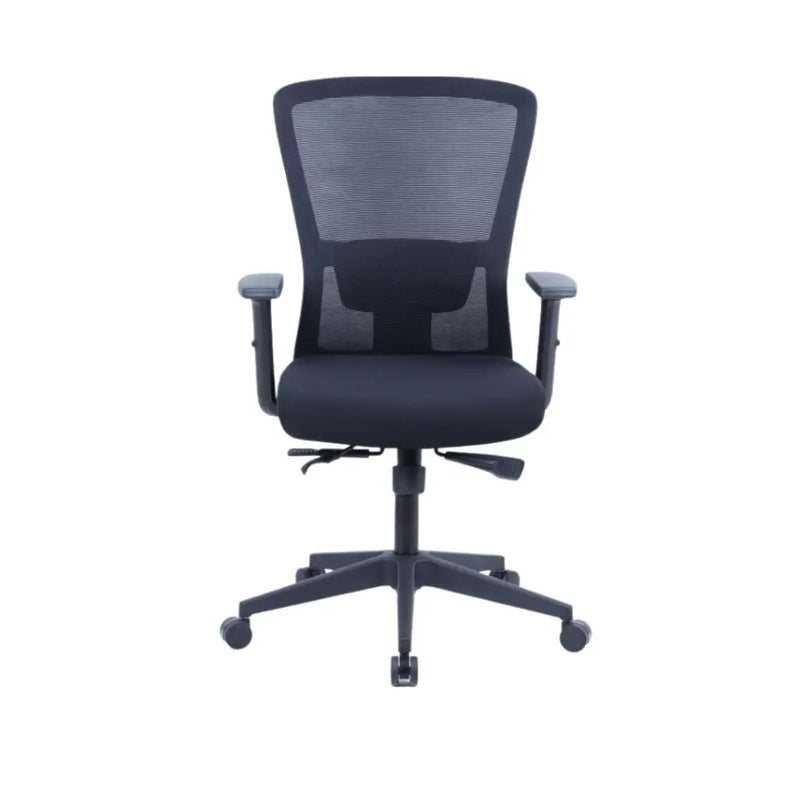 כסא מנהלים אפור מעוצב ומרופד. ריפוד בד שחור וגב רשת שחור אלסטי. בסיס בעל 5 זרועות ליציבות וניידות קלה