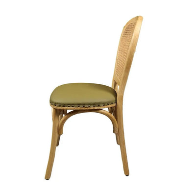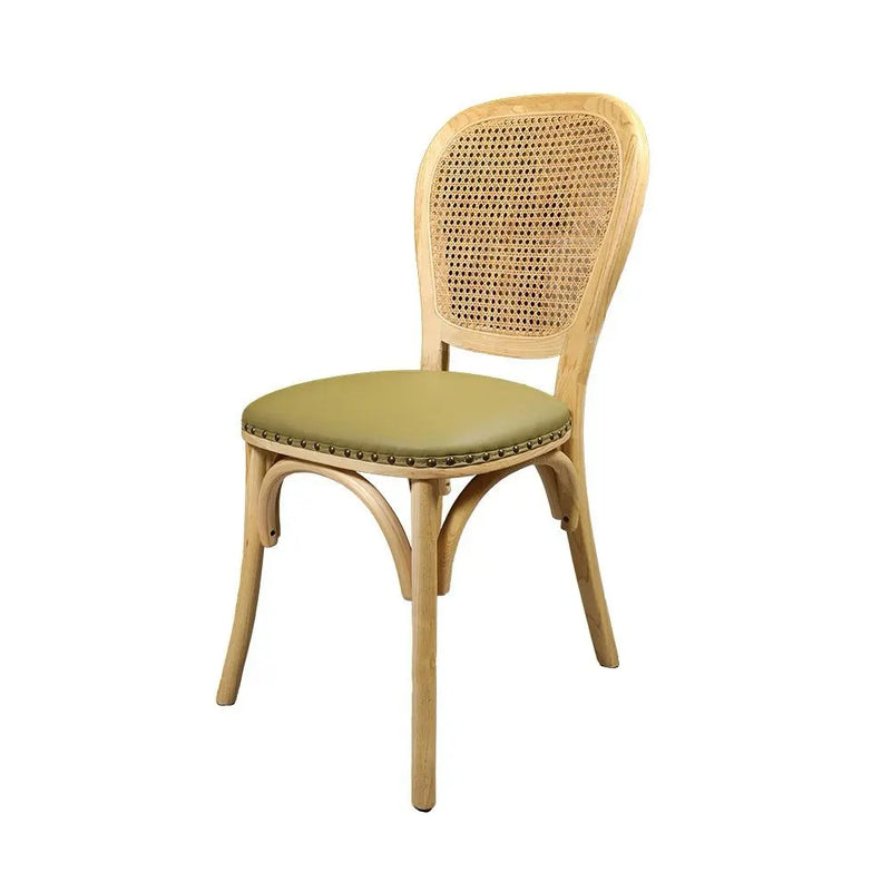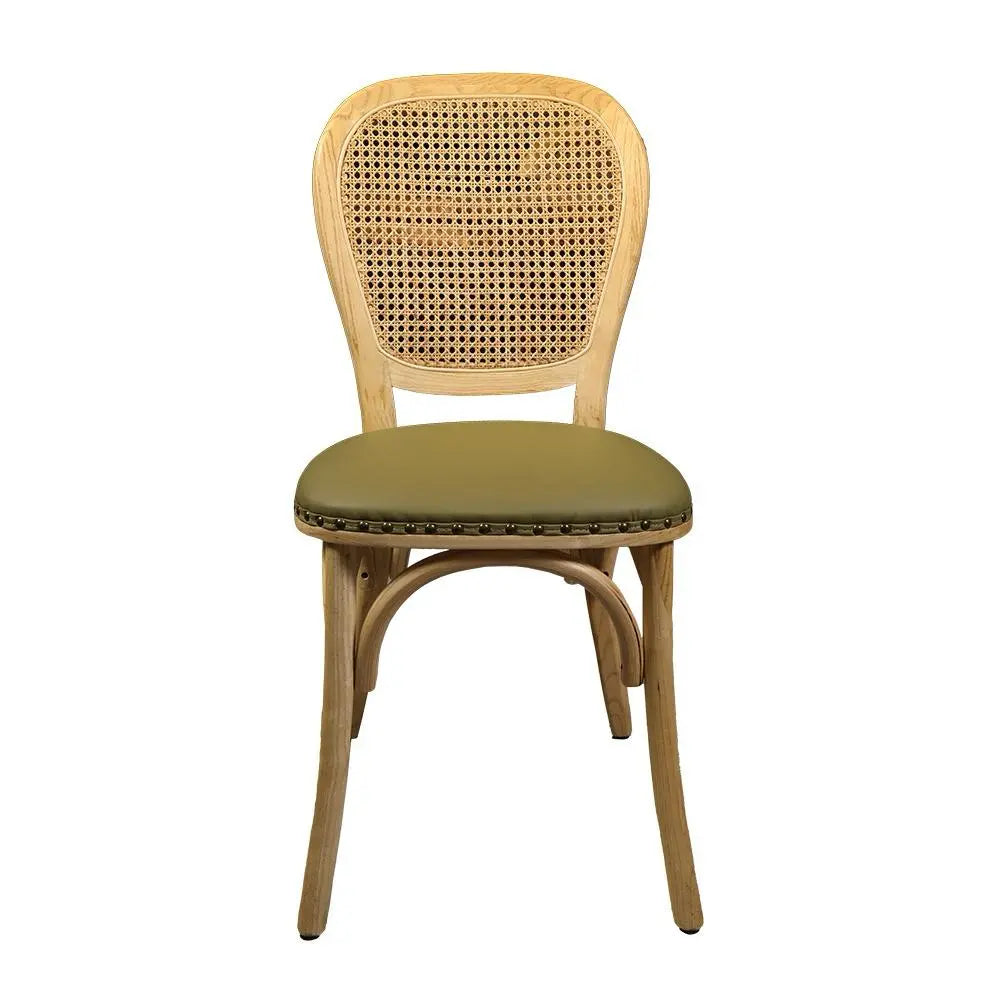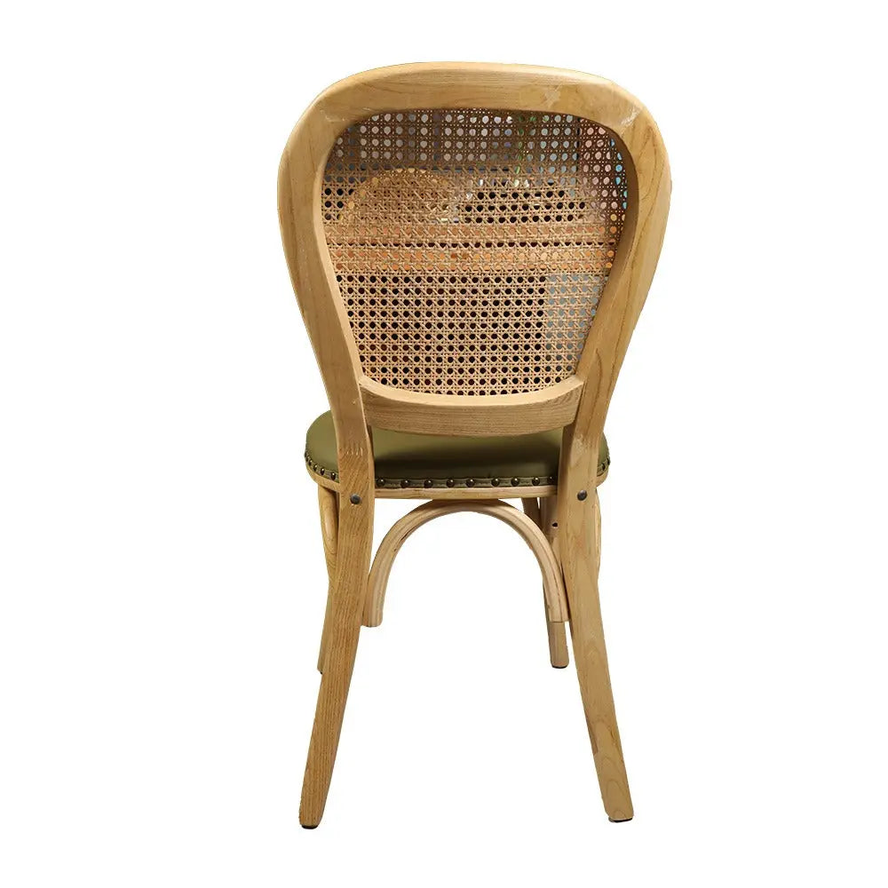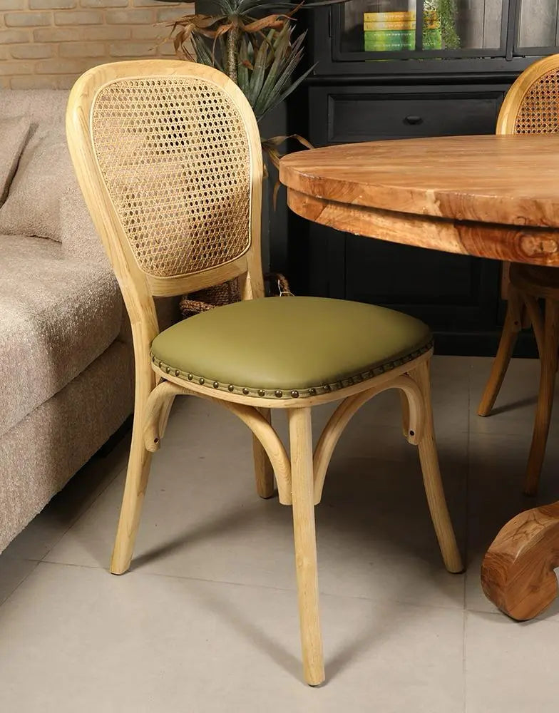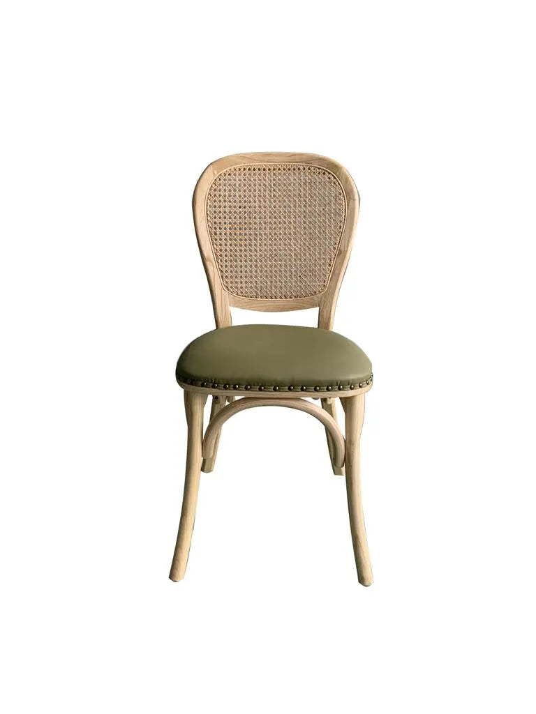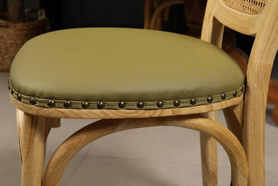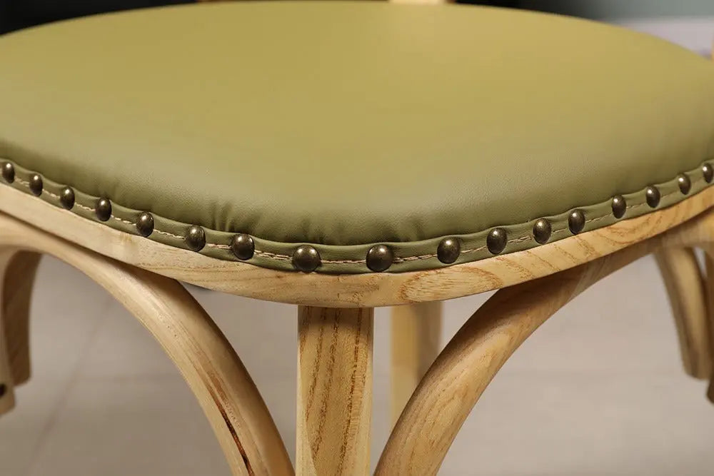 כסא אוכל בעל מושב במילוי ספוג עטוף בבד דמוי עור בגוון ירוק, עם מסמרי ברונזה בחיבור הבד לעץ