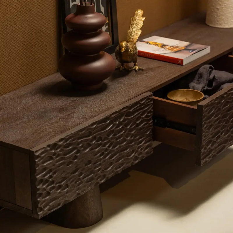 מזנון עם מראה אותנטי הודות למבנה הצר ולרגליים הרחבות. בנוסף, יש מספיק מקום להניח אביזרים על הרהיטים או לאחסן פריטים בשלוש המגירות. המזנון עשוי מעץ מנגו מה שמקנה לו שיק בוהו שמשפר כל חלל. רהיט מעוצב עם נוכחות מדהימה - פיס ייחודי.