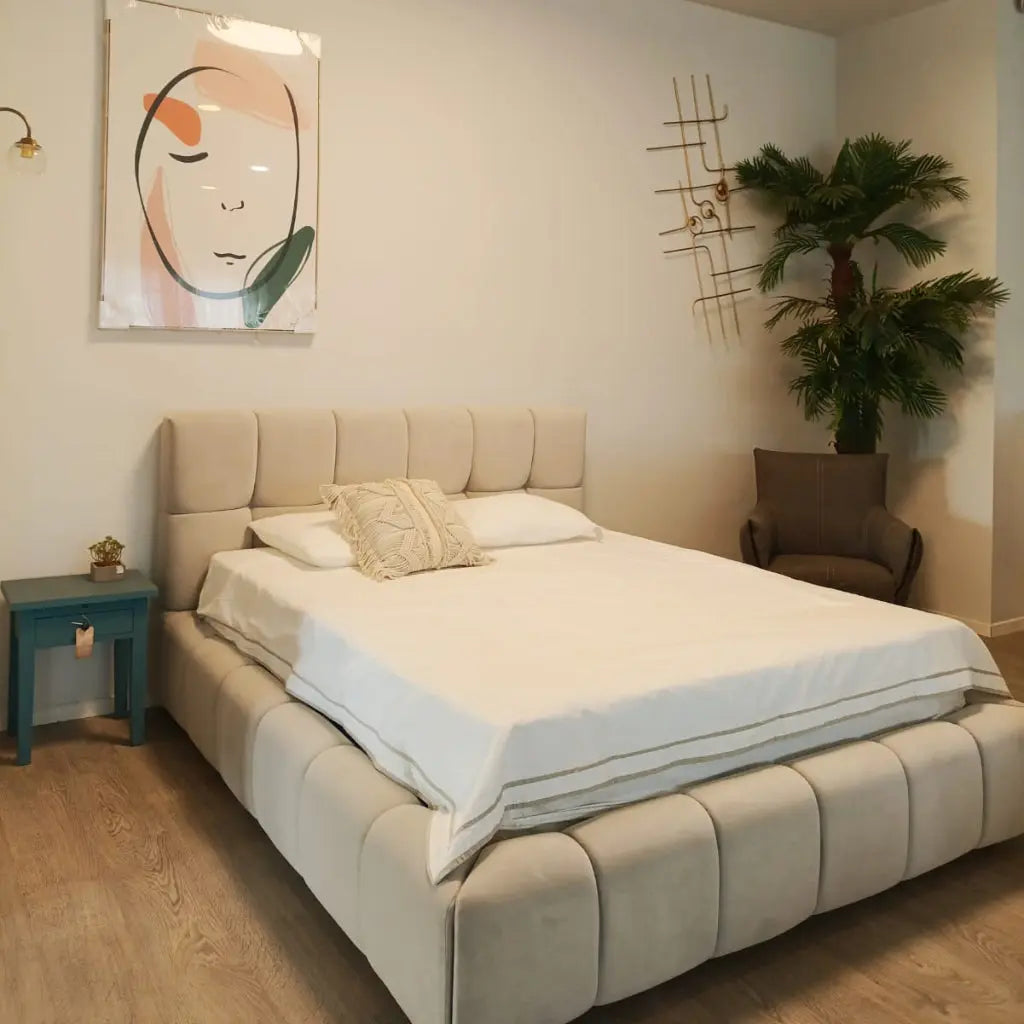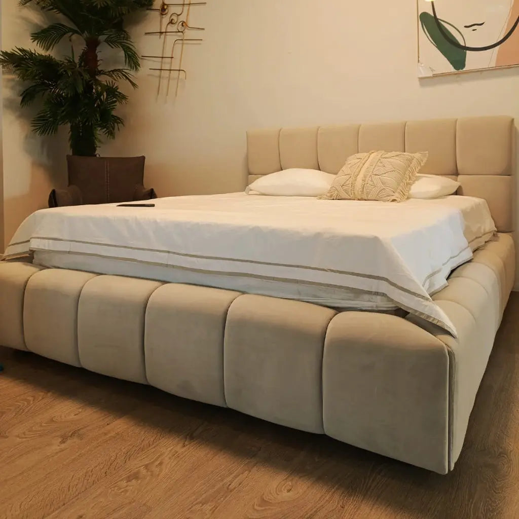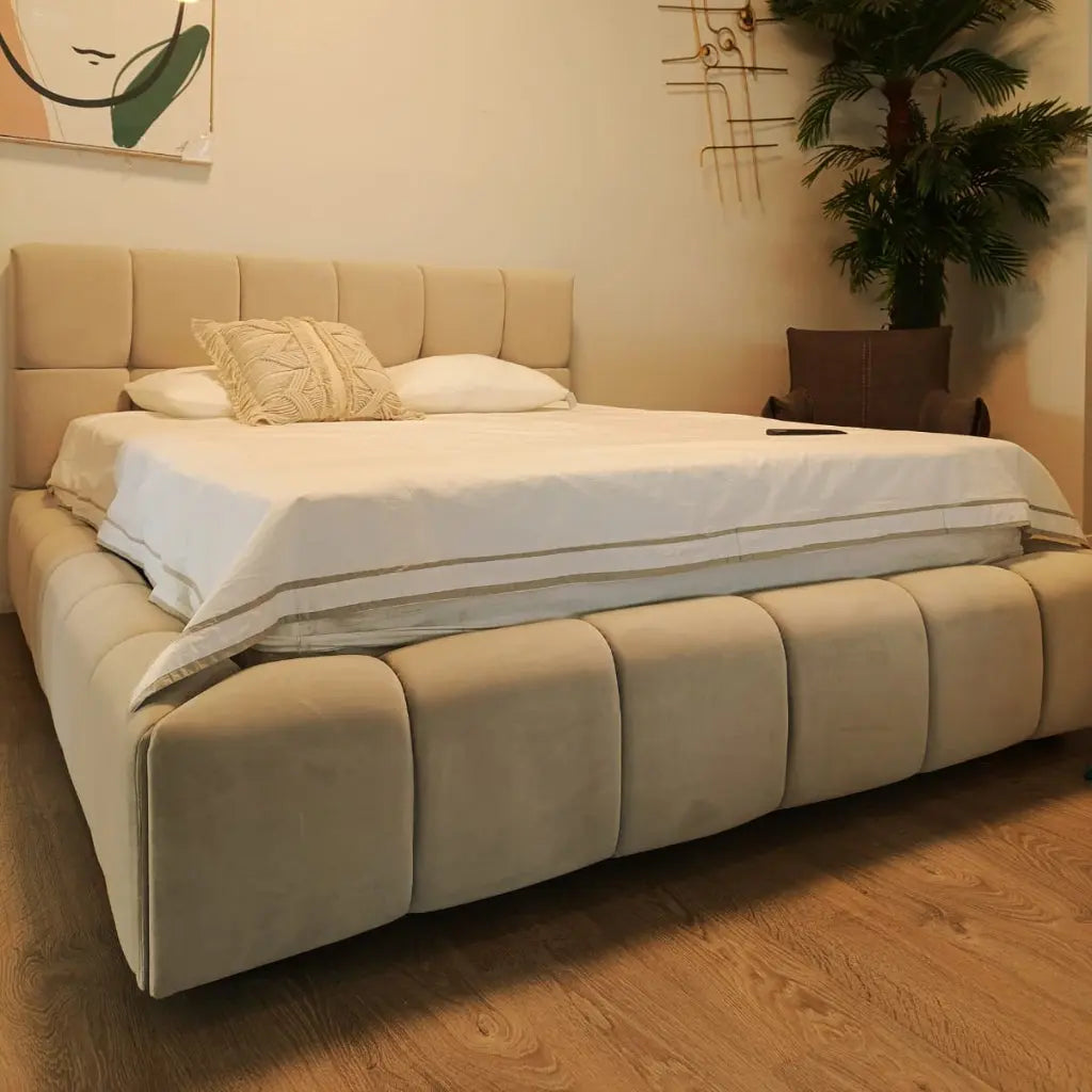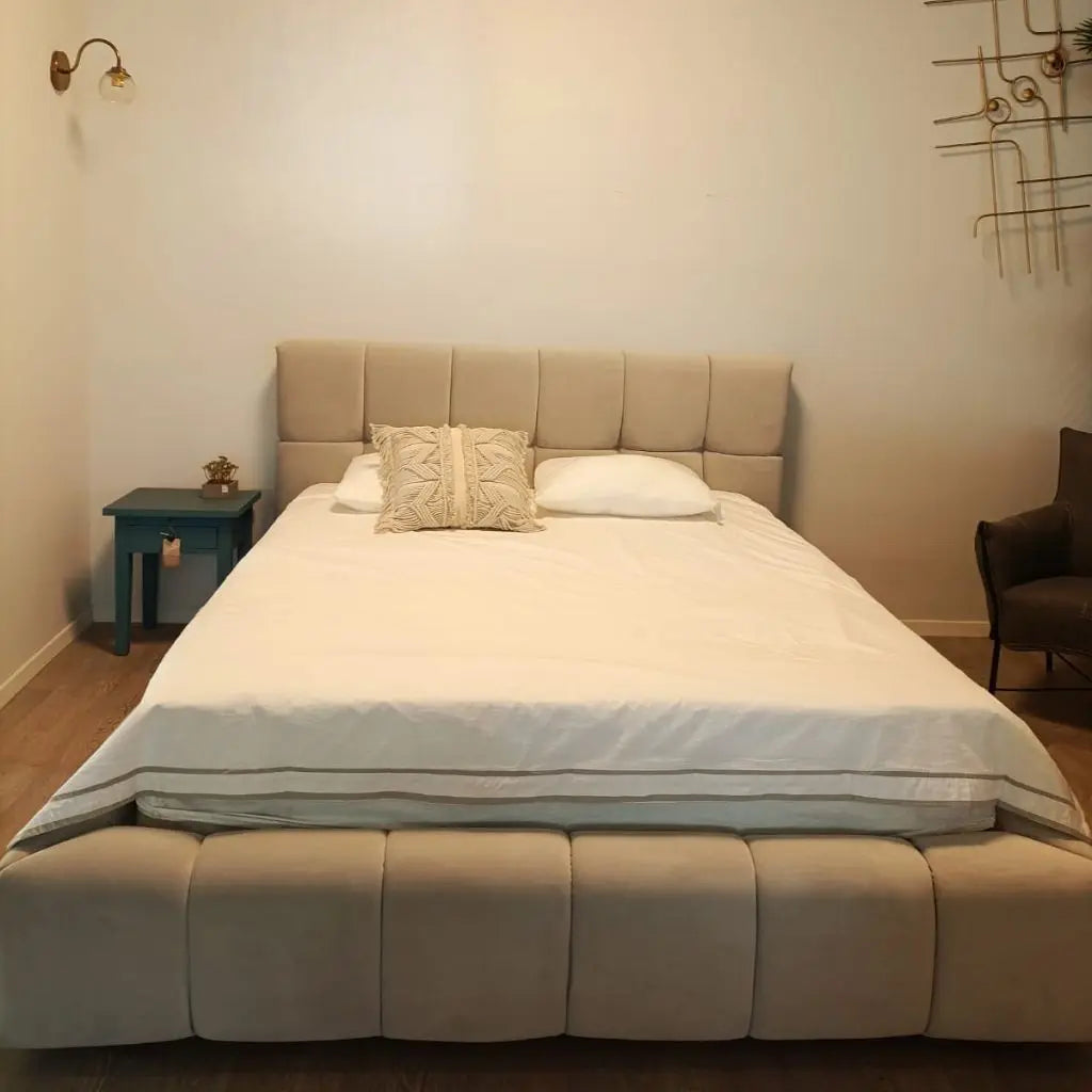 מיטה זוגית נסיכותית עם במה מרופדת ומרשימה, המקום שבו אנחנו מסיימים את היום שלנו ורוצים להרגיש את הרוגע וחום.