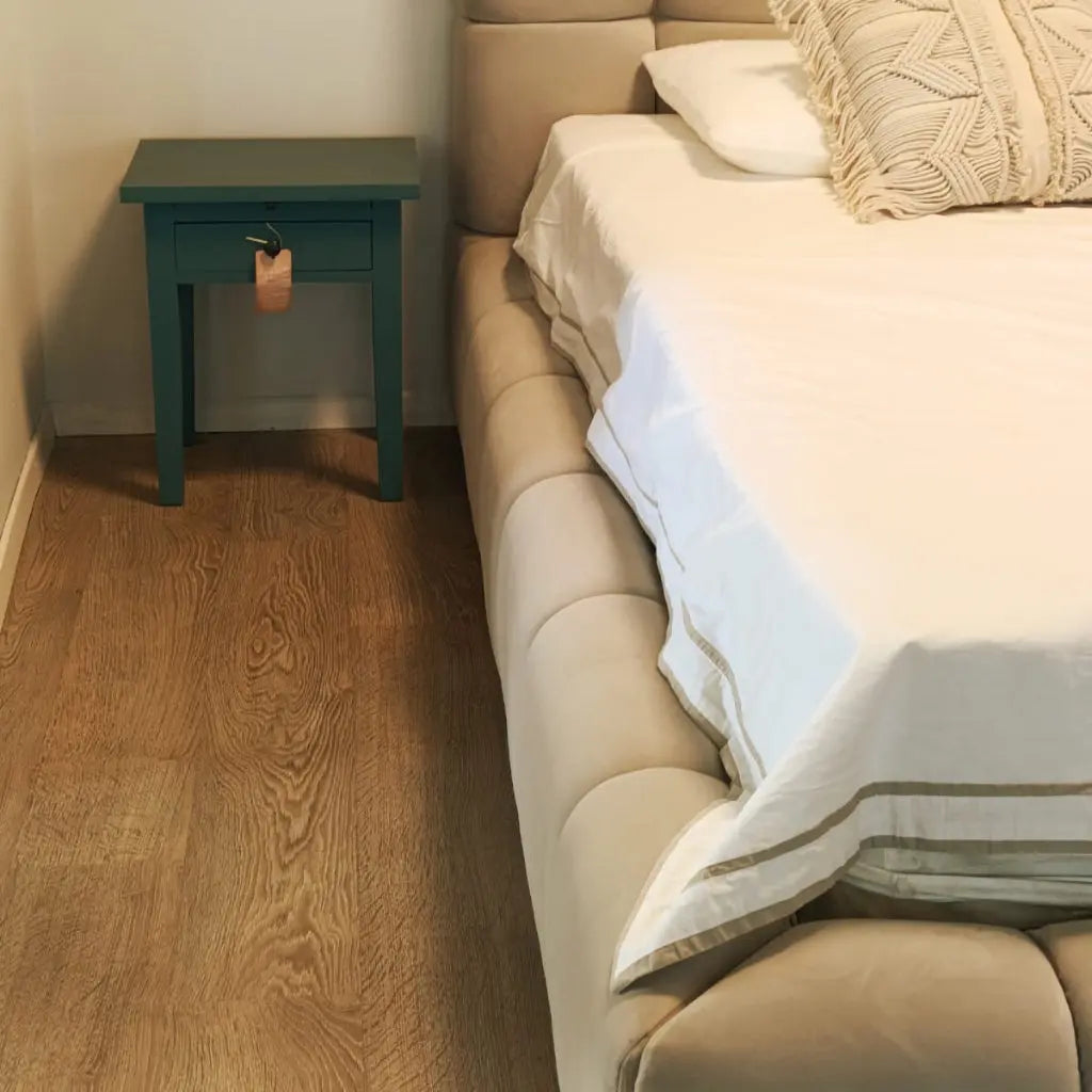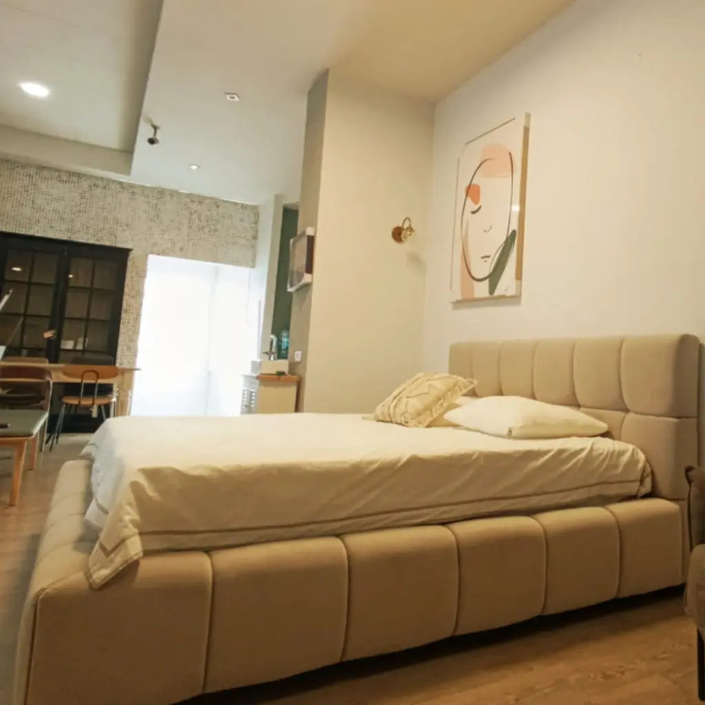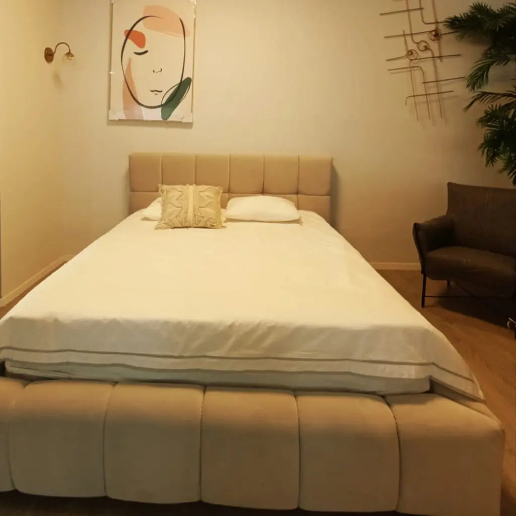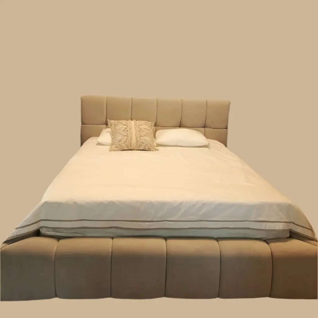 מיטה זוגית נסיכותית עם במה מרופדת ומרשימה, המקום שבו אנחנו מסיימים את היום שלנו ורוצים להרגיש את הרוגע וחום.