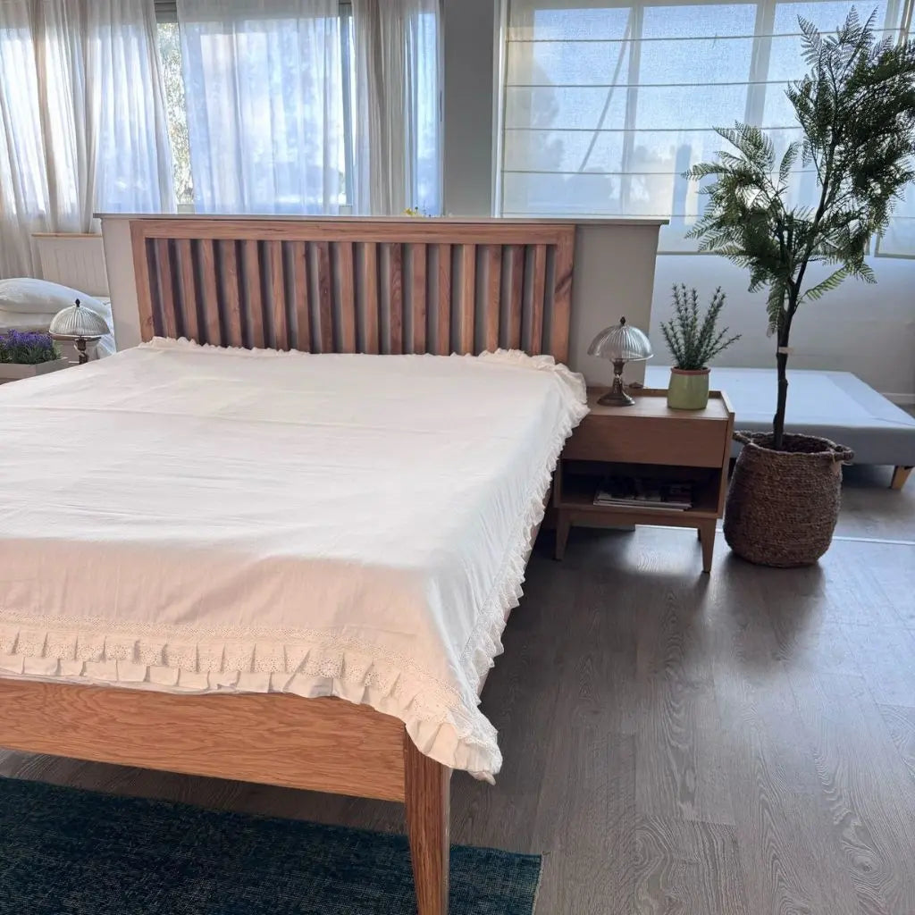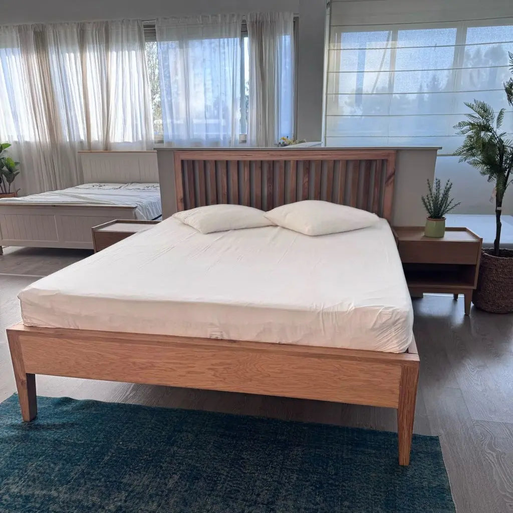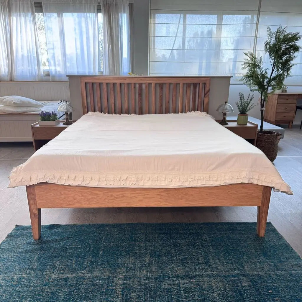 מיטה זוגית קלאסית עשויה מעץ אלון מלא ואיכותי, המעניק לה מראה חם ומזמין. העיצוב המוקפד של המיטה, עם קווים נקיים וזורמים, ישתלב בצורה מושלמת בכל סגנון עיצובי. עץ האלון האהוב ידוע בזכות עמידותו ויופיו הטבעי, הגוון החם של העץ מוסיף נופך יוקרתי ומרגיע המתאים בדיוק לחדרי שינה.
