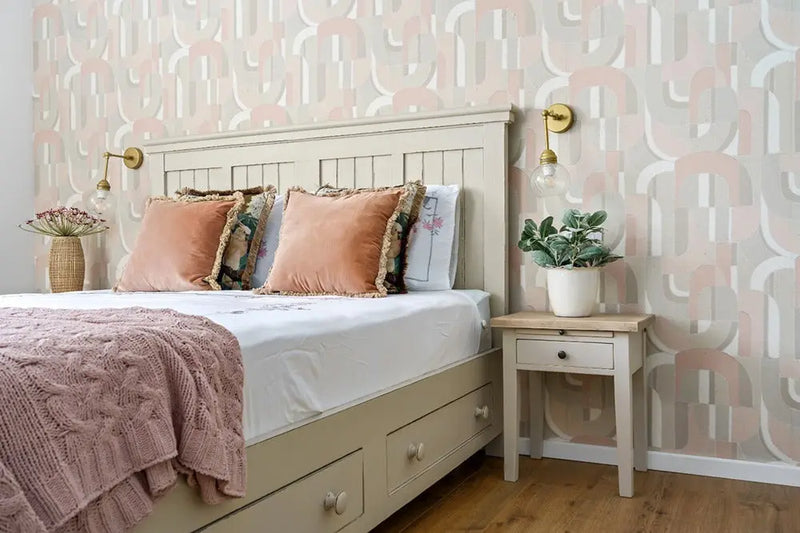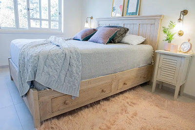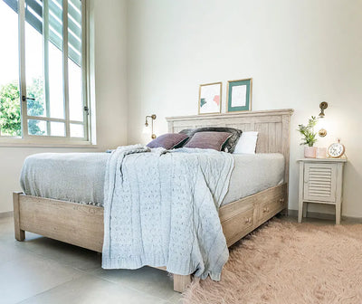 בבסיס המיטה הזוגית המעוצבת שתי מגירות אחסון נשלפות, וראש מיטה גבוה ומרשים