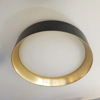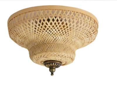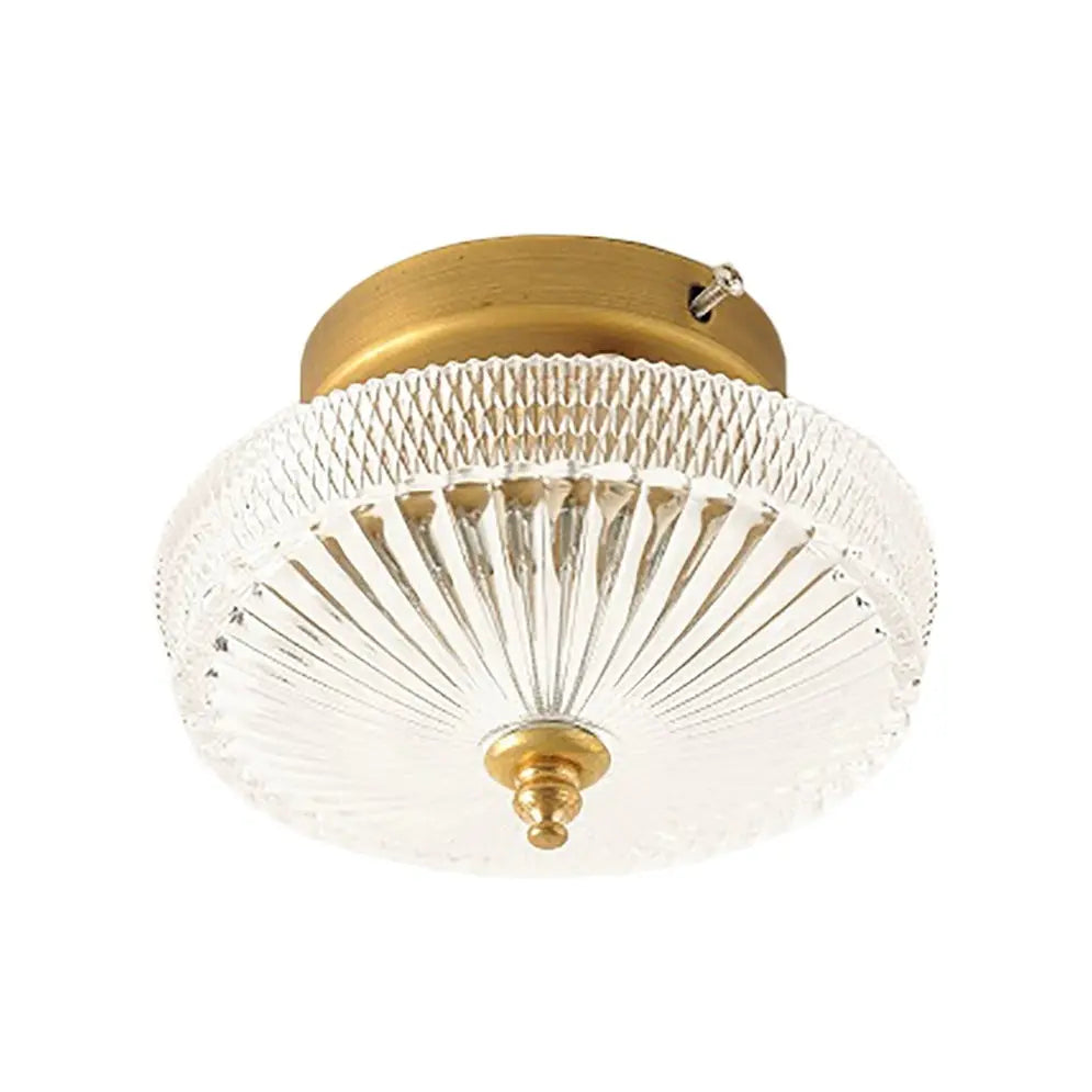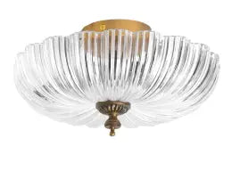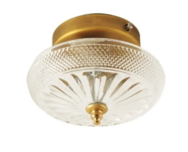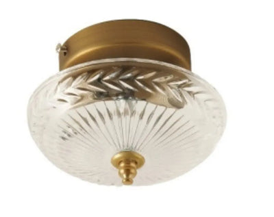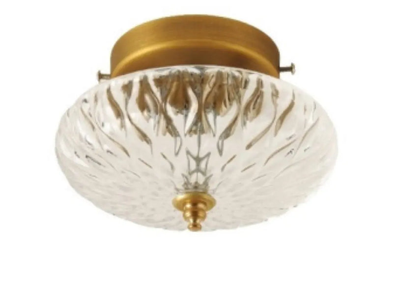 מנורה צמודת תקרה עשויה זכוכית שקופה מעוטרת משולבת גוף מתכת זהובה.