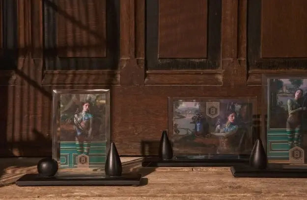 מסגרת העץ מורכבת ממעמד עץ נמוך עם כדור בצד אחד וצורת חרוט בצד השני.