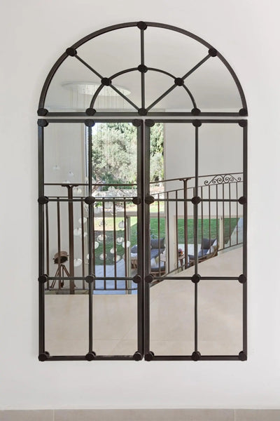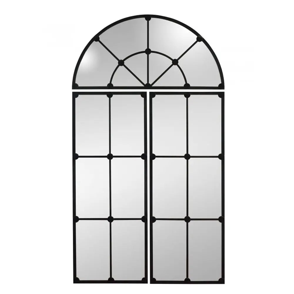 מראה מעוצבת עשויה ברזל תעשייתי. המראה המעוצבת מורכבת מ-3 חלקים, אשר שניתן להפרידם ולתלותם על הקיר במרחקים שונים לקבלת אפקט של מראה גדולה מאוד. ראי ייחודי.
