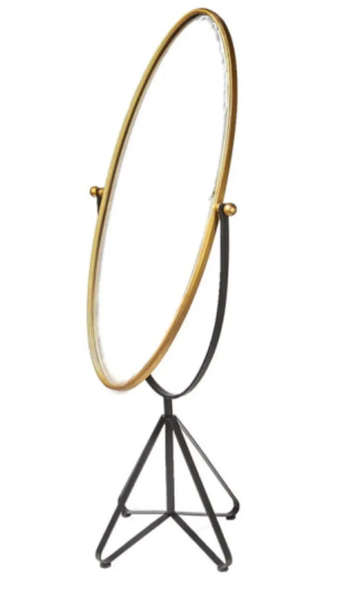 מראה מעוצבת אובלית ממוקמת על רגל ברזל שחורה,