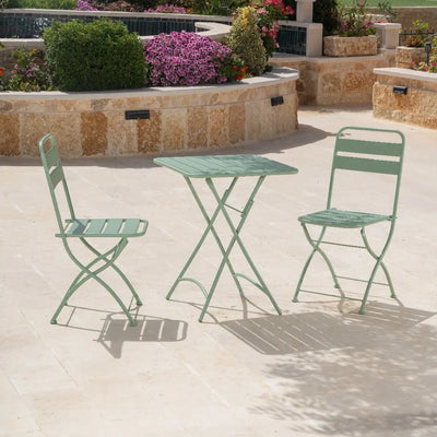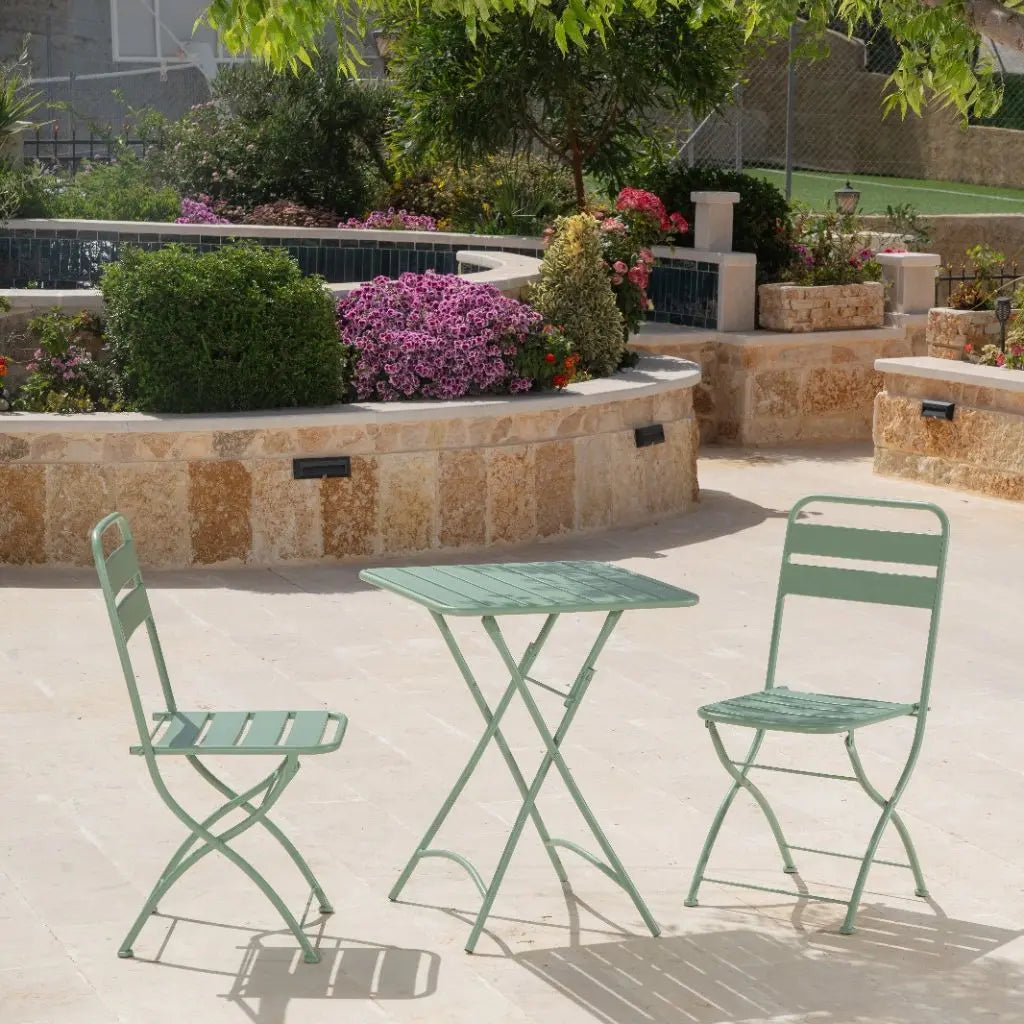 2 כסאות ושולחן אלומיניום מתקפל בצבע לבן לאירוח בגינה או במרפסת מייצרת אווירה ונוחות מקסימלית.