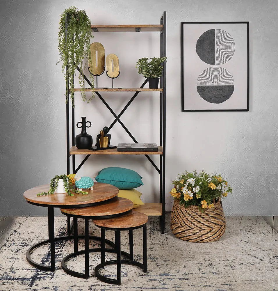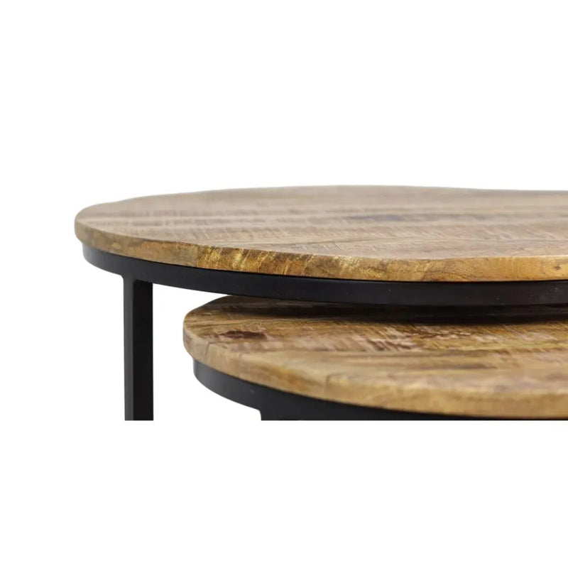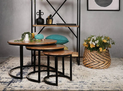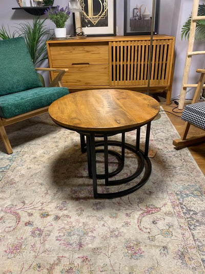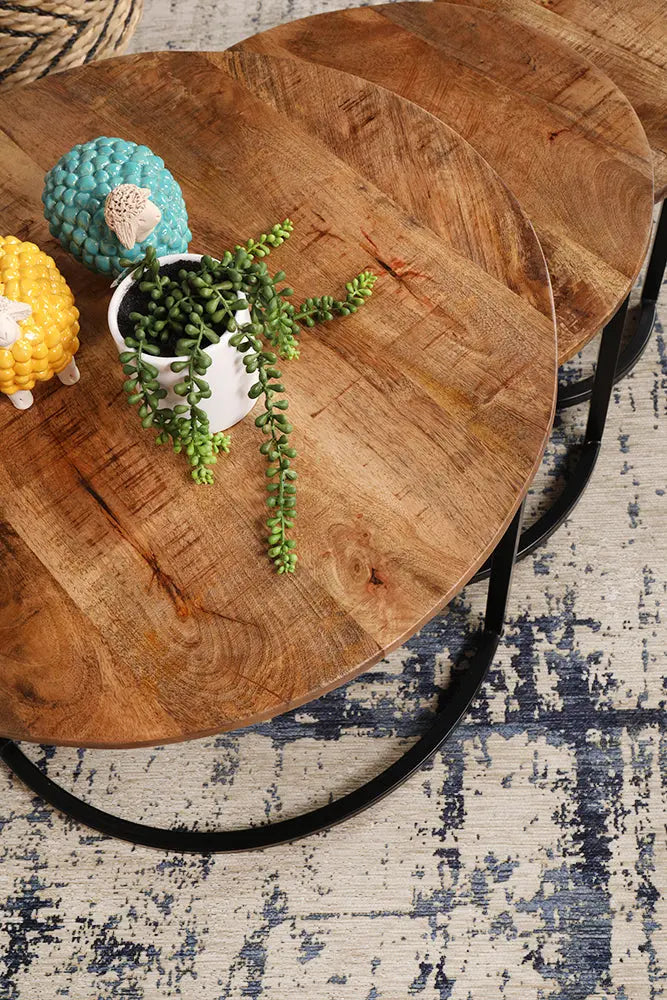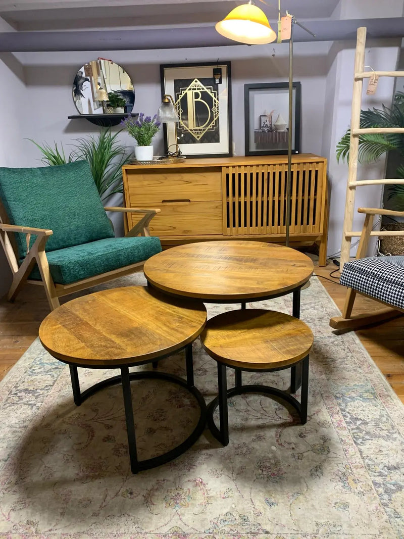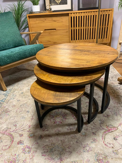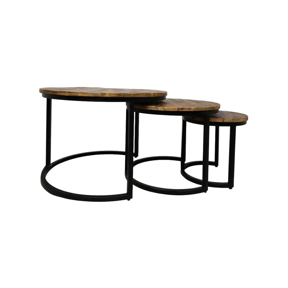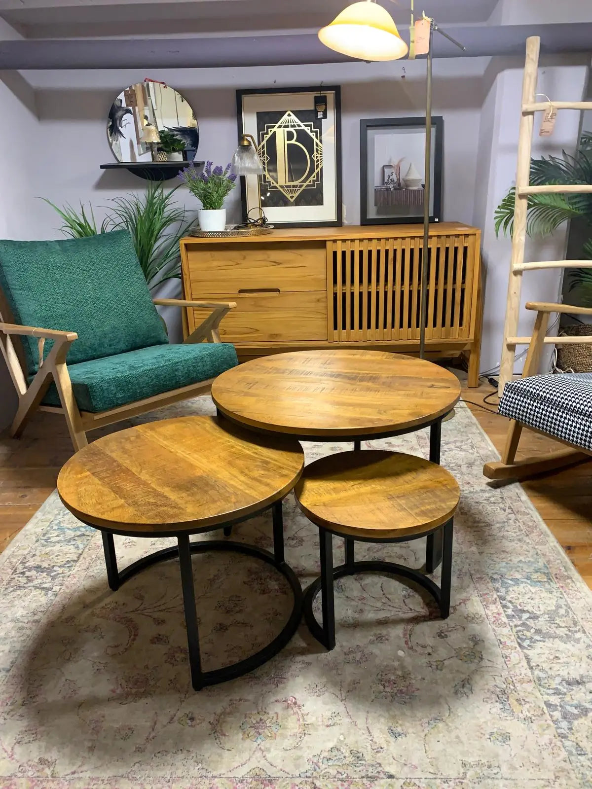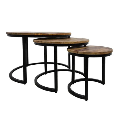 סט 3 שולחנות מעץ מנגו עם רגלי ברזל שחורות מתאימים לסלון או לכל פינת ישיבה