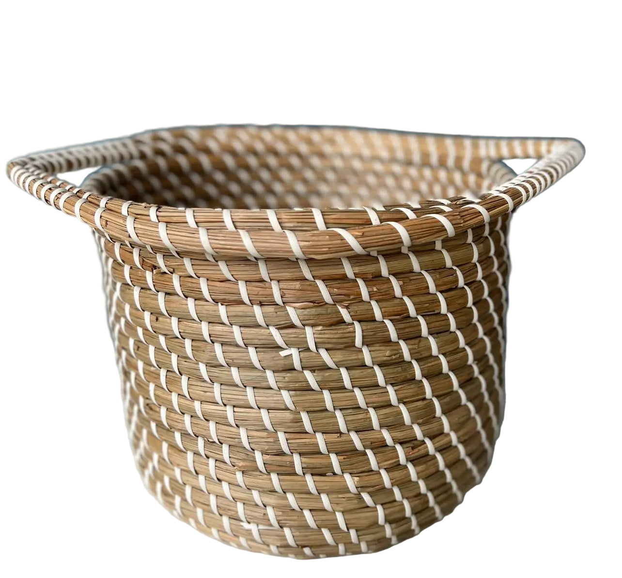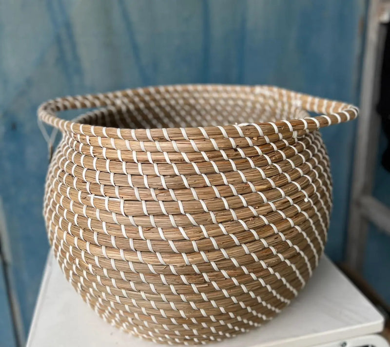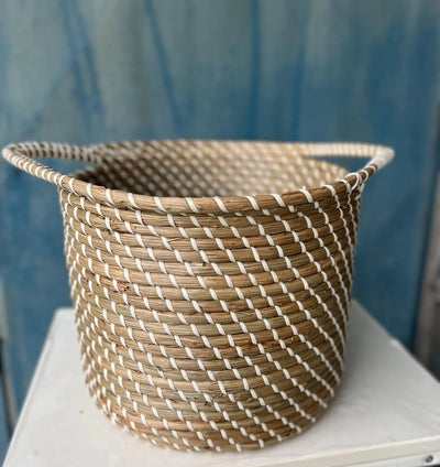 סל דקורטיבי עשוי מראטן בהיר שזור חוט לבן