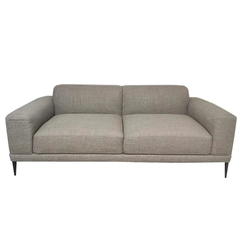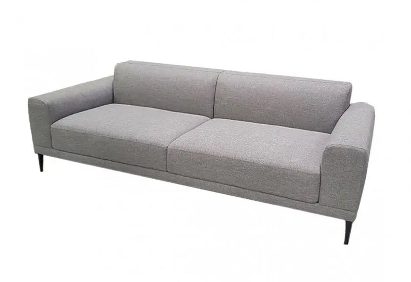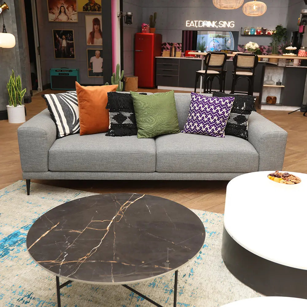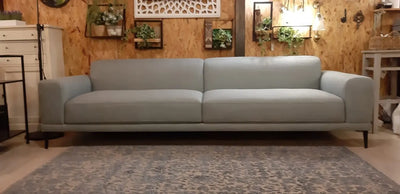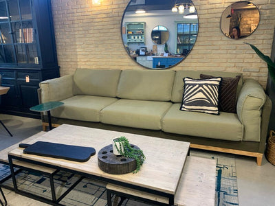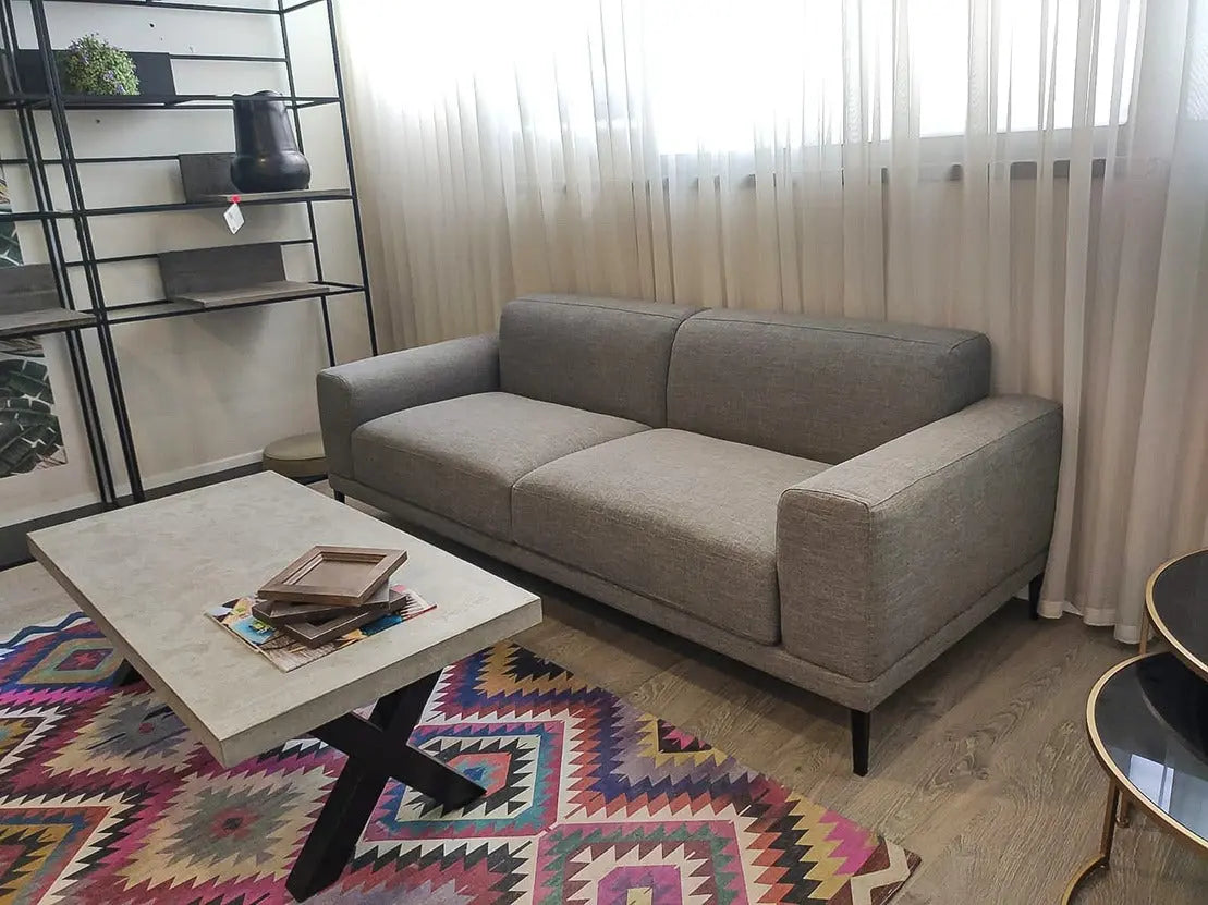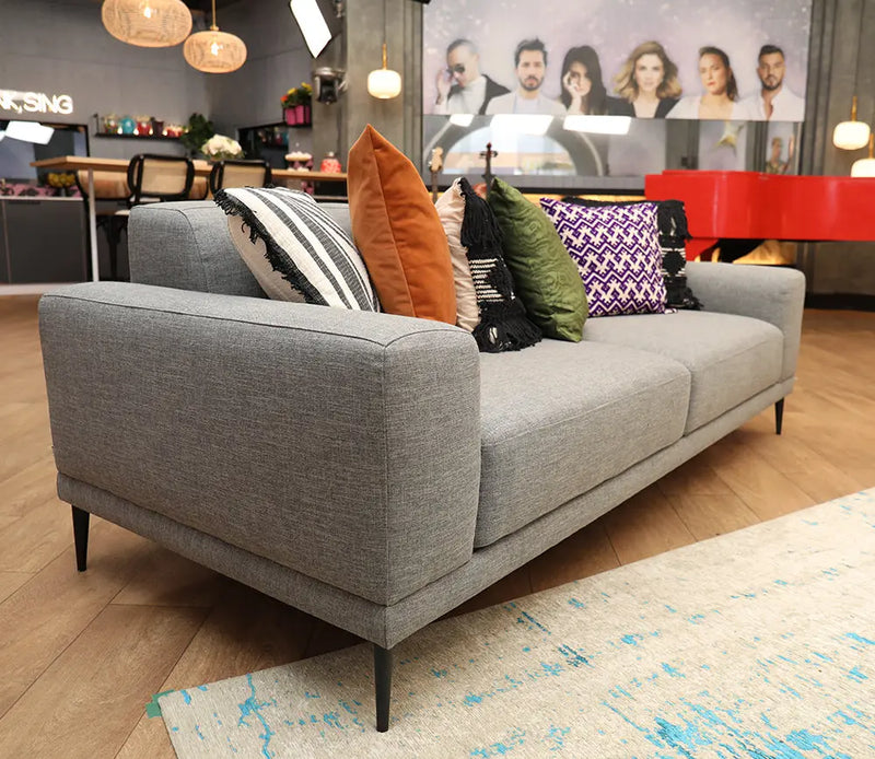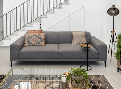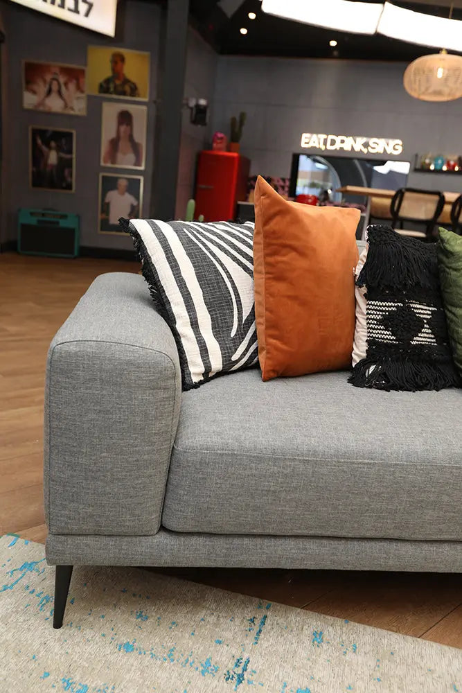 ספה מעוצבת במראה קלאסי, נקי, הכריות והמושב מחוברים לגוף הספה