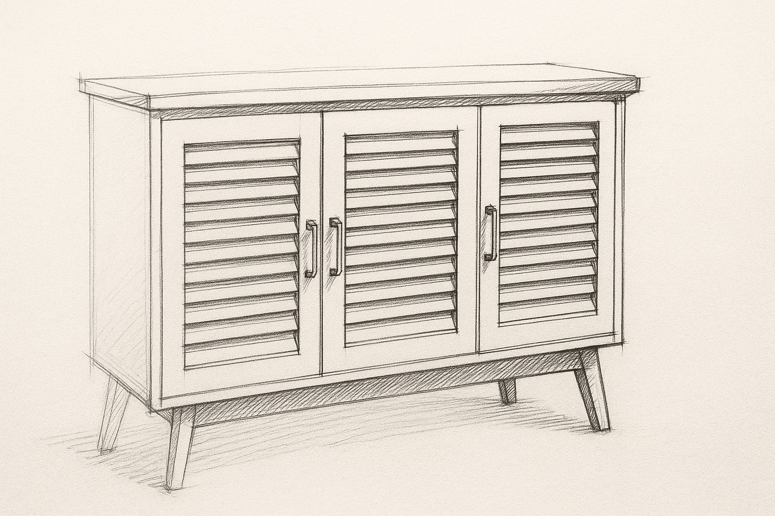 שידה מעוצבת בסגנון כפרי. לשידה 3 דלתות בעיצוב תריס ו 4 תאי אחסון גדולים .