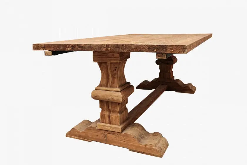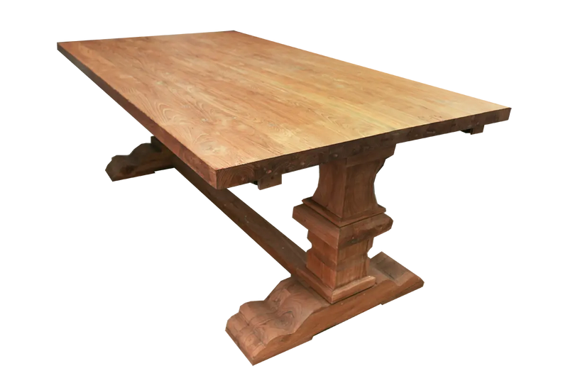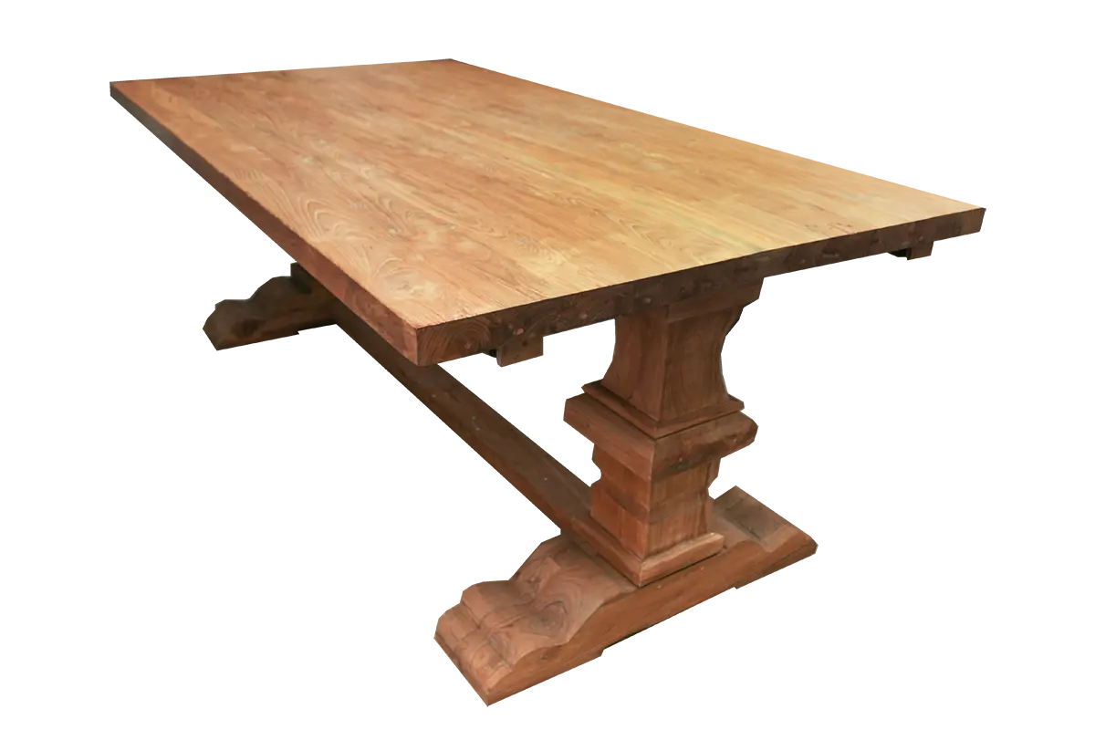 השולחן בגימור ראסטיק גס בעל רגל מגולפת בצורת אננס העץ טיק בן עשרות שנים ,עובר תהליך של מחזור, ניקוי והברשה,