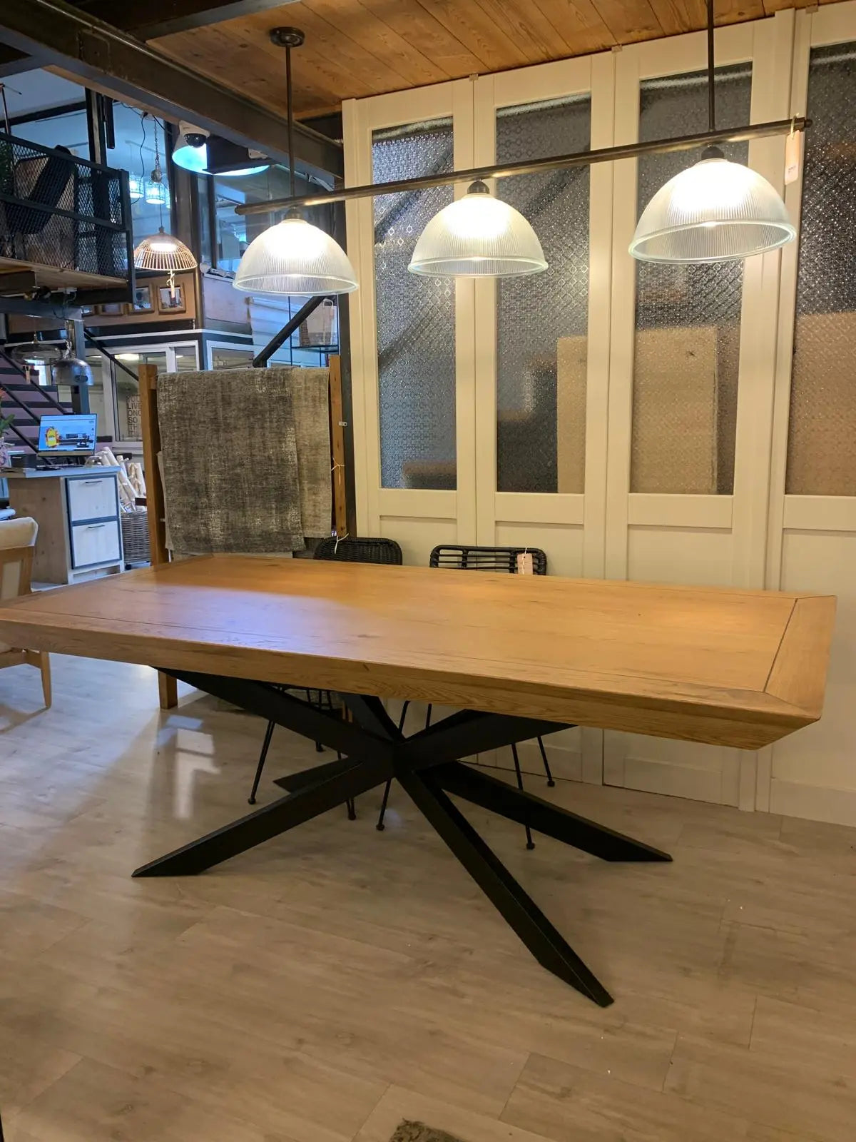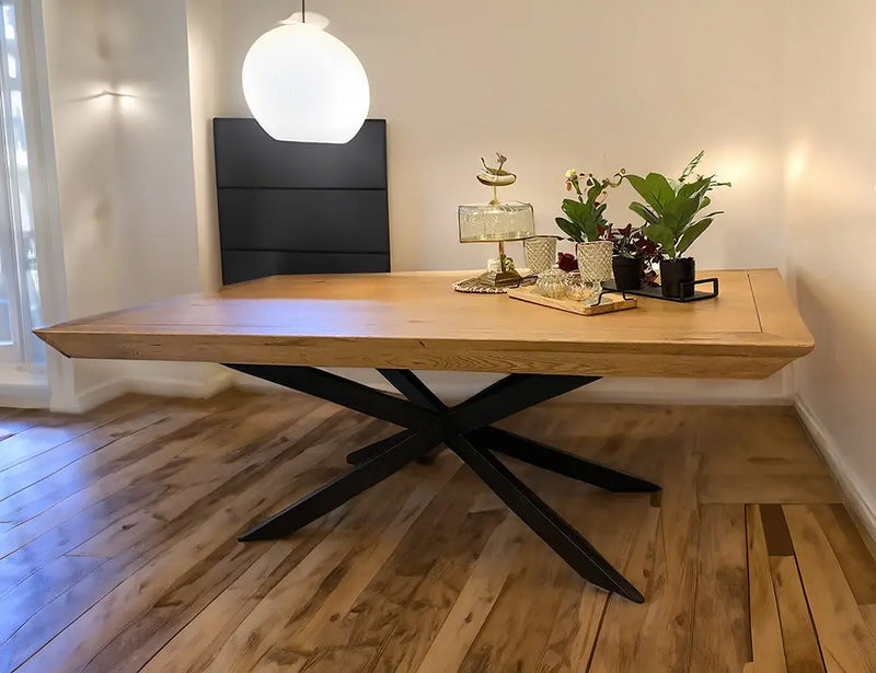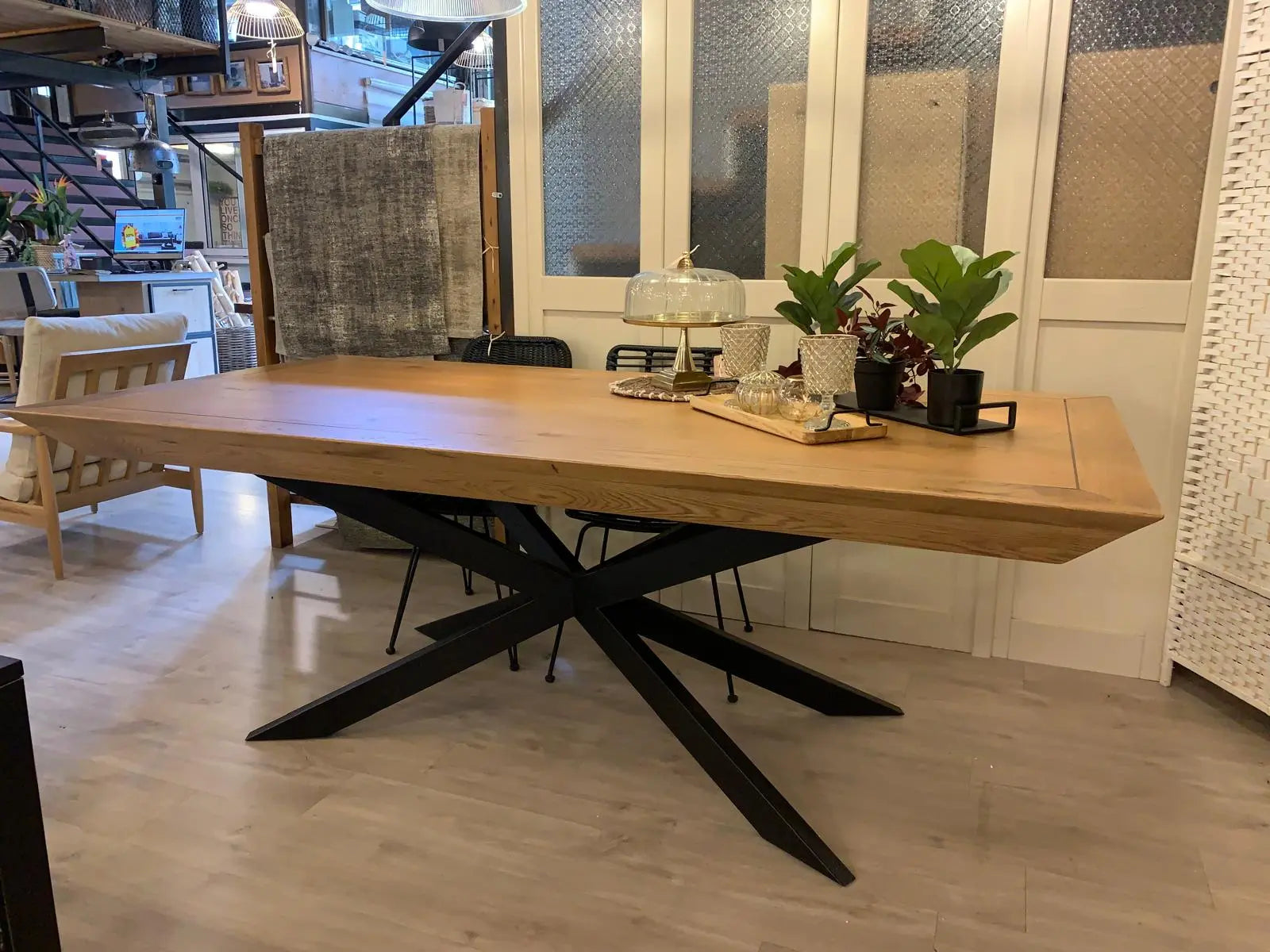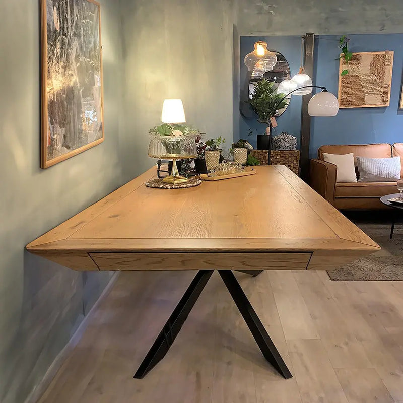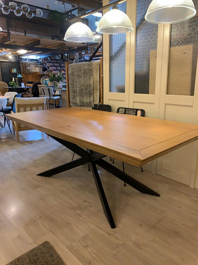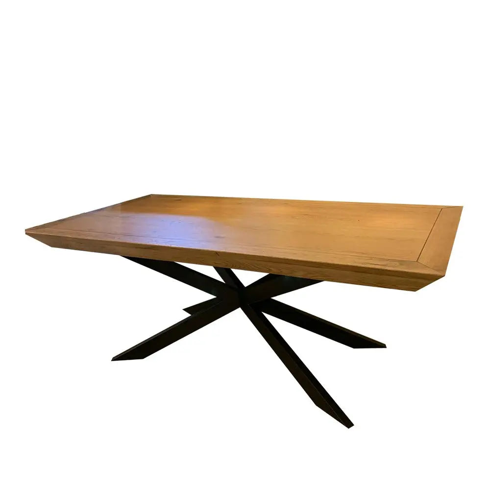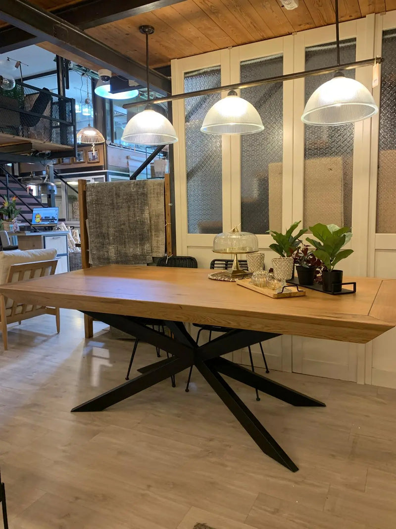שולחן אוכל מסוגנן ויפהפה במראה אקלקטי .רגל השולחן עשויה מברזל בעוד הפלטה עשויה מפורניר אלון הקנט מסביב לשולחן עשוי מאלון מלא