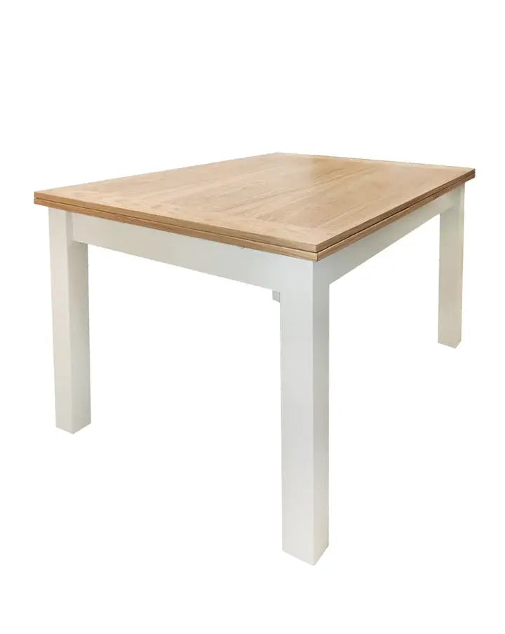 לשולחן האוכל הנפתח פלטה בגוון טבעי ורגליים מעץ בוק מלא בצבע שמנת. במצב סגור, מתאים השולחן ל-6 סועדים.