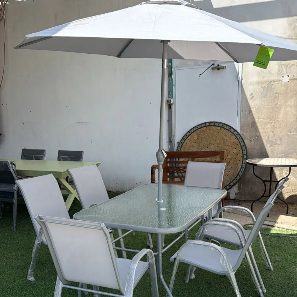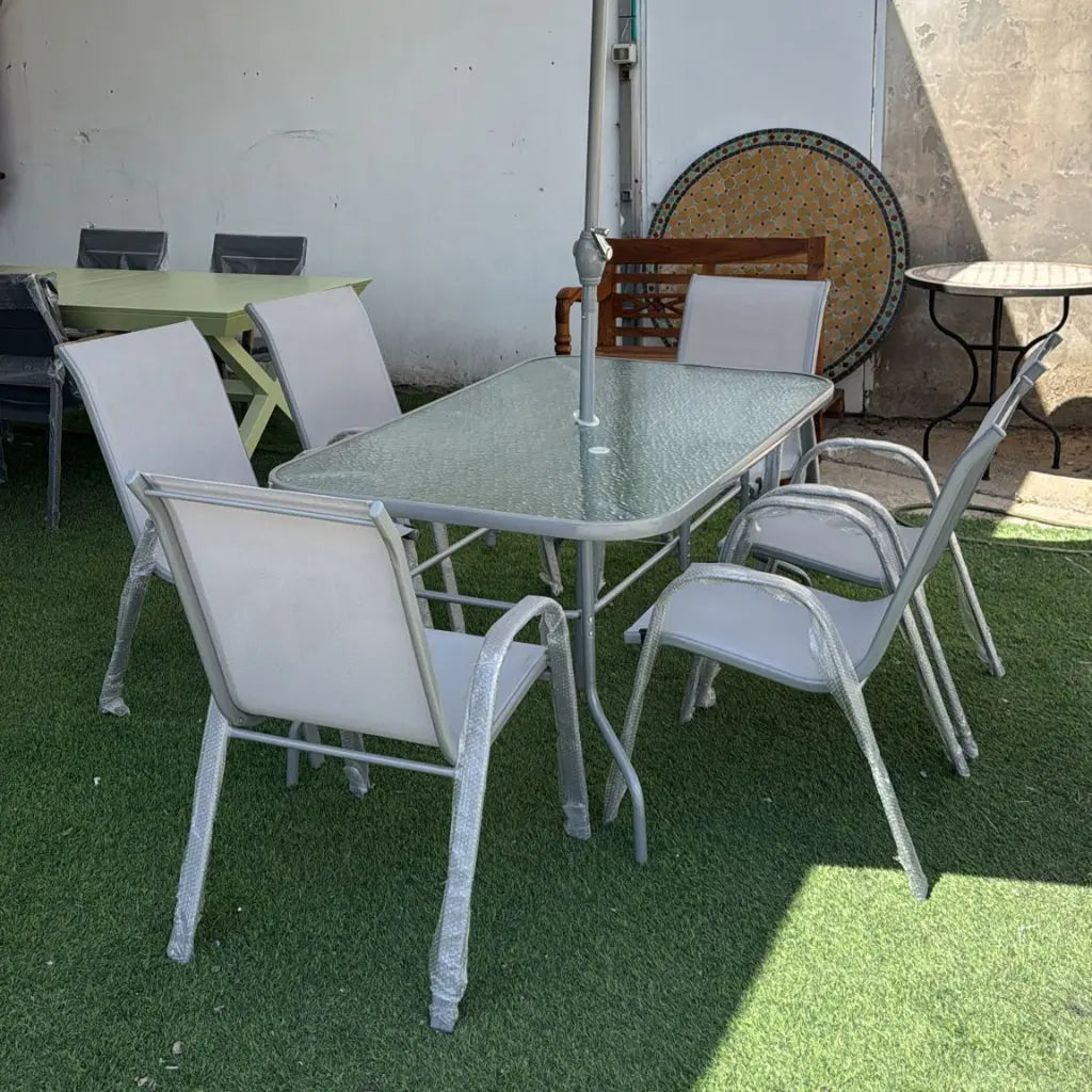 סט ונציה כולל 6 כסאות נוחים, שולחן זכוכית מחוסמת איכותי ומטריית צל גדולה.(תוספת לבחירה) ה סט הזה הוא הפתרון המושלם לאירוח משפחה וחברים בגינה, במרפסת או בחצר.