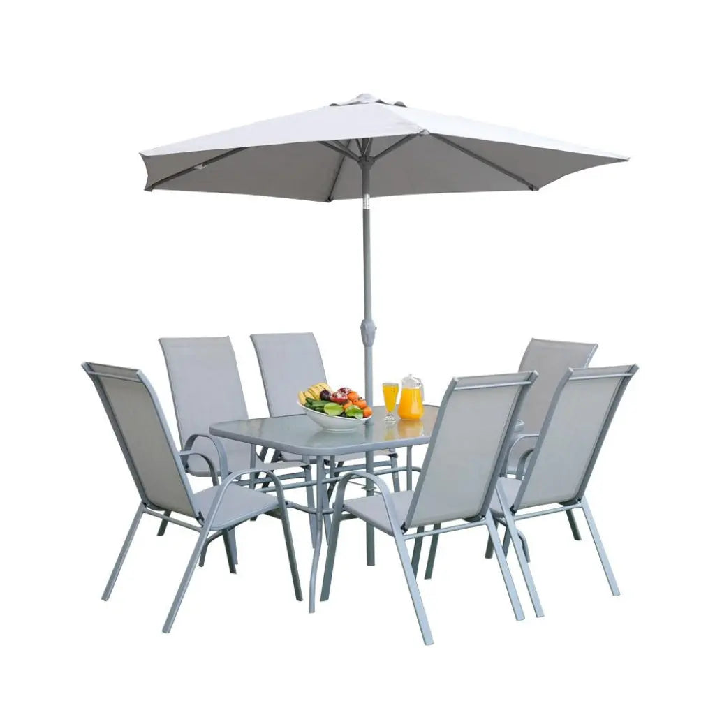 סט פינת אוכל גן ל-6 סועדים עם שולחן זכוכית ומטרייה - נוחות וצל מושלמים לגינה ולמרפסת.