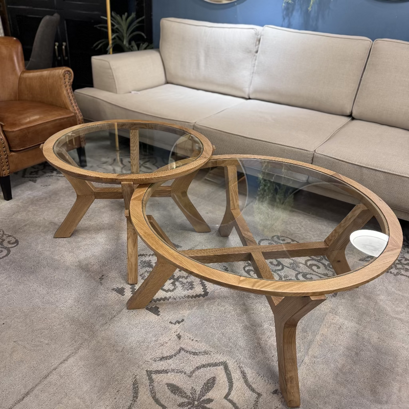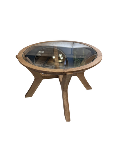 שולחן סלון עגול עשוי עץ אלון מלא משולב עם זכוכית .