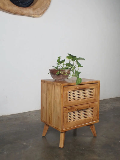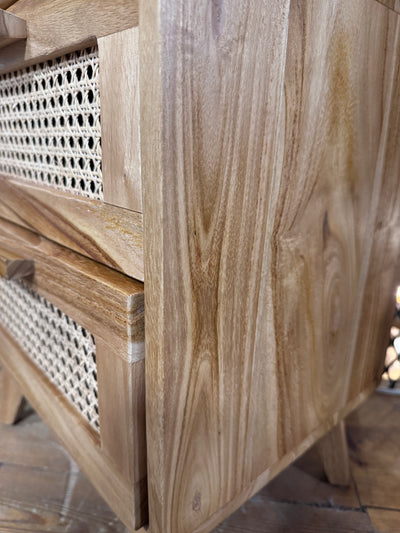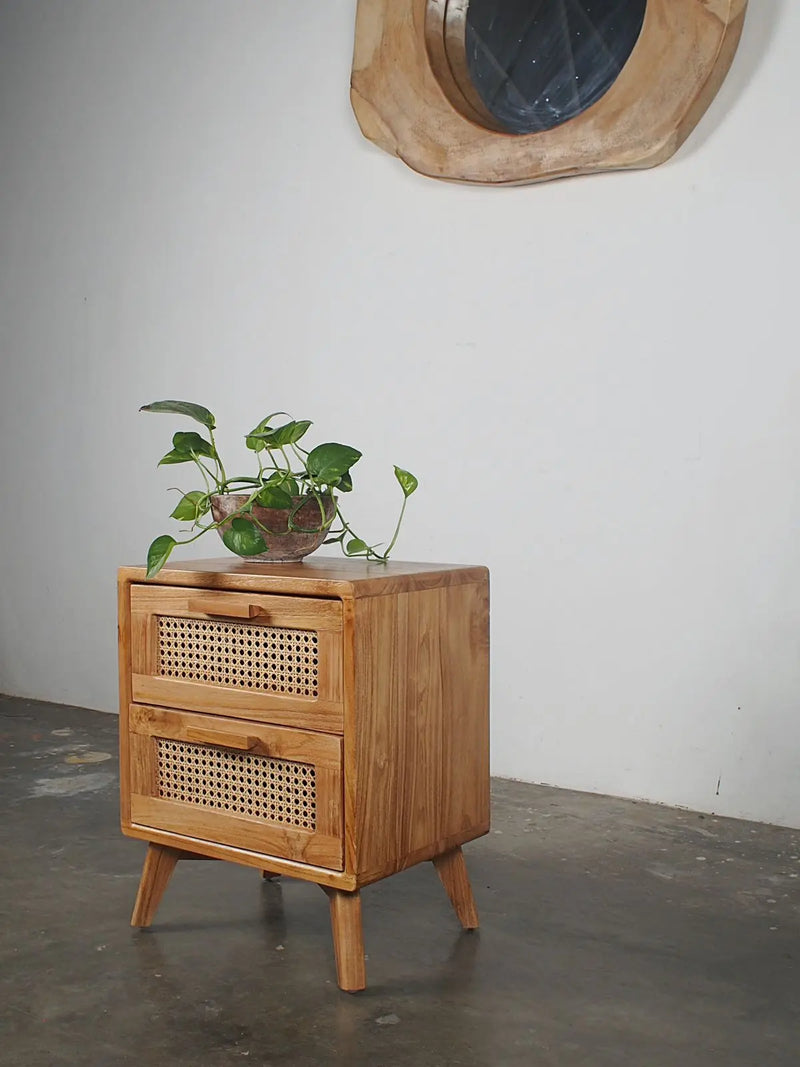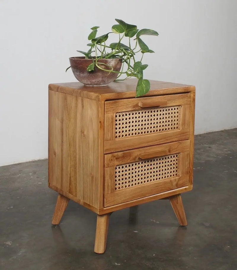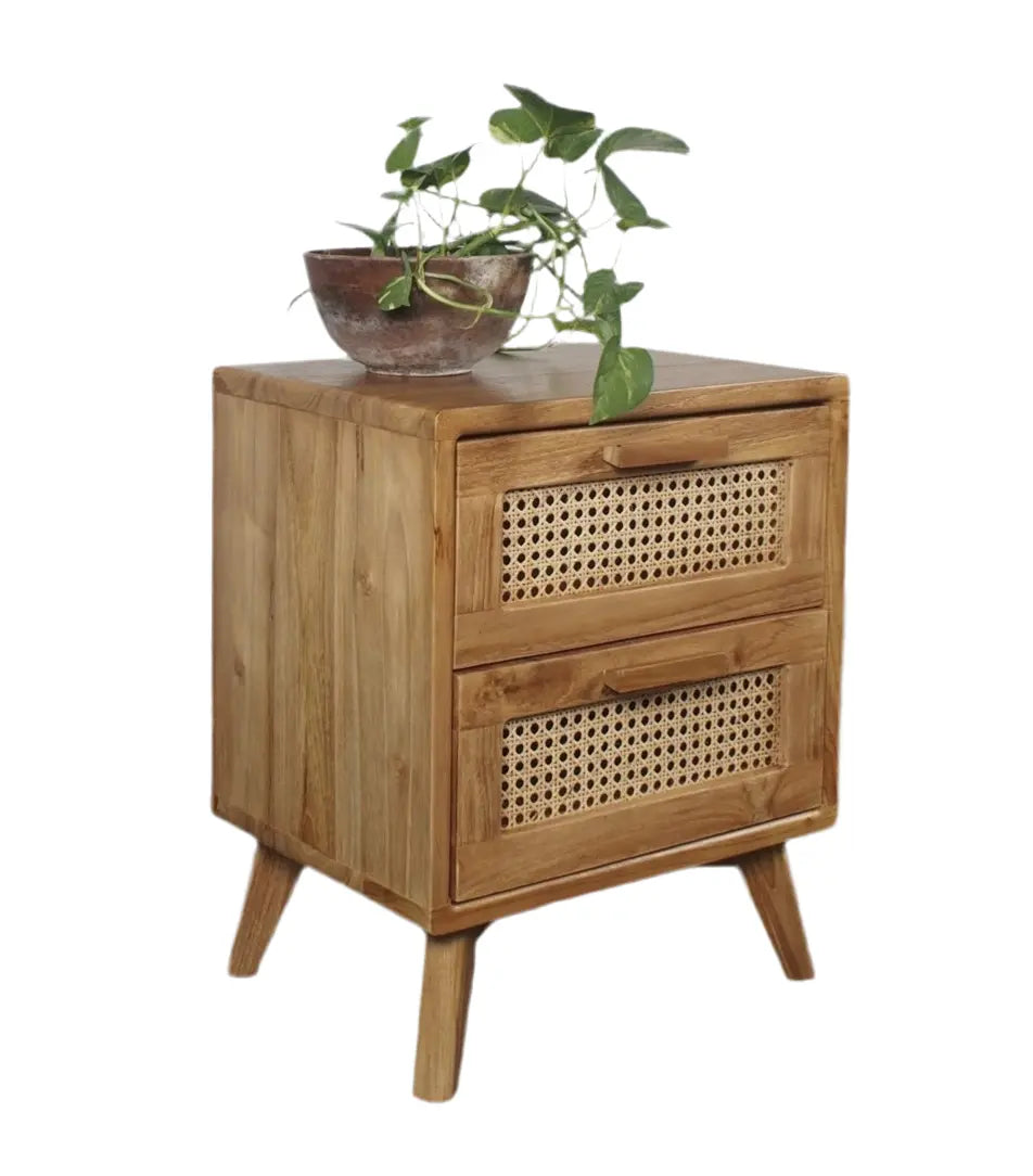 שידה קומפקטית מדהימה מעץ טיק מלא בגוון טבעי מאינדונזיה, ראטן משולב בשתי מגירות מתאים לצד מיטה