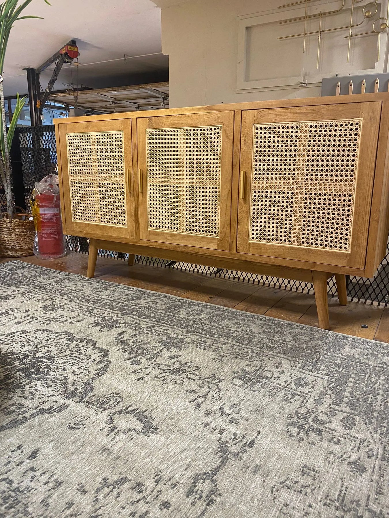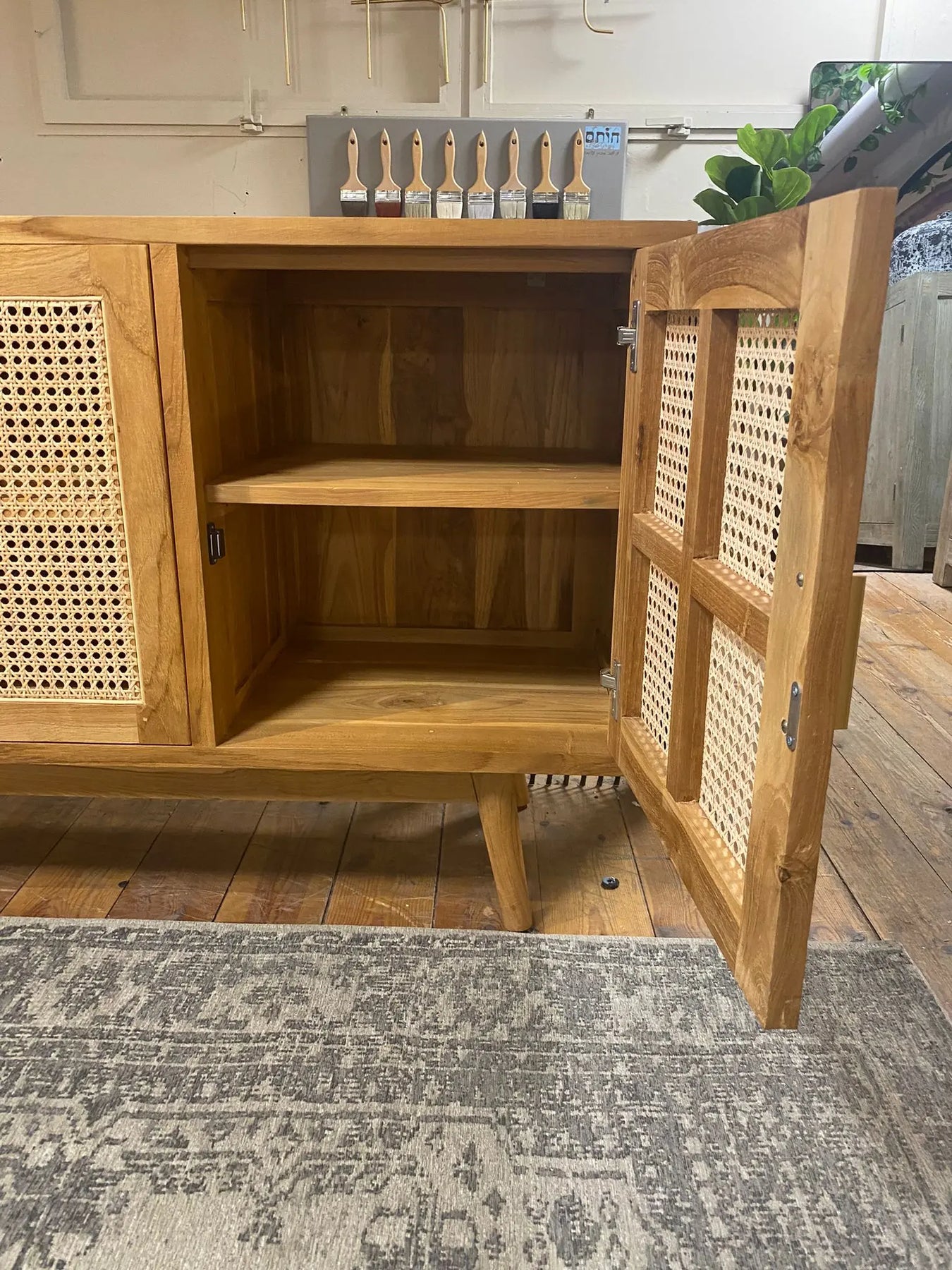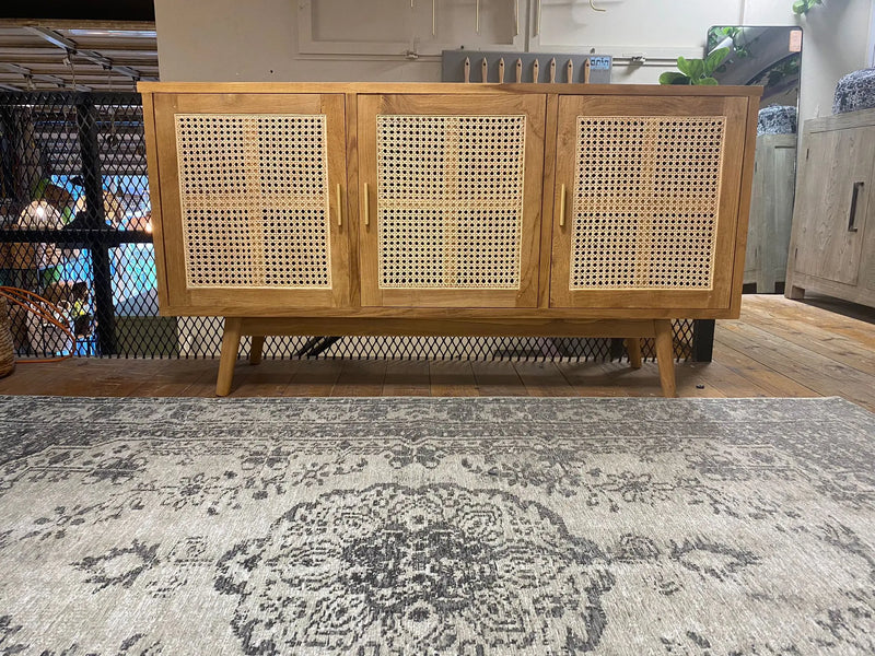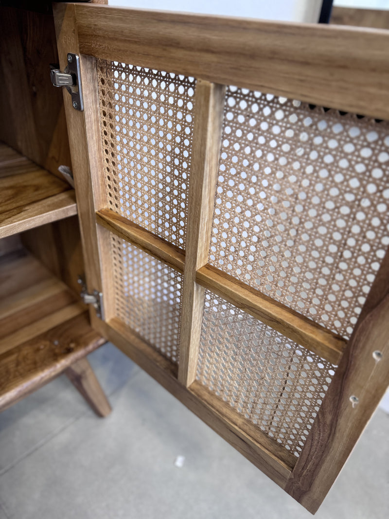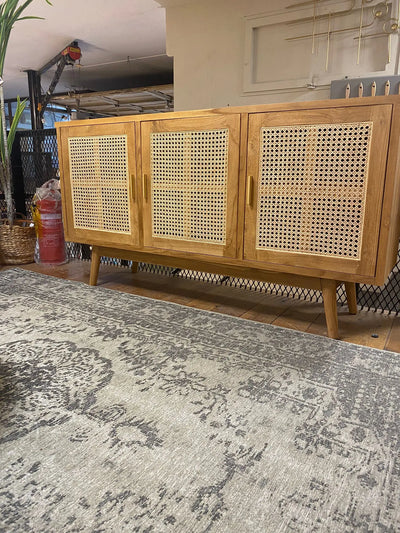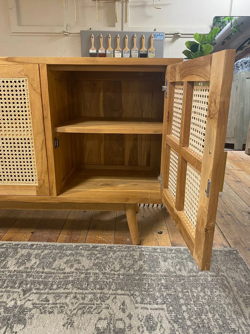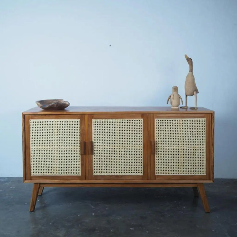שידה דקורטיבית עם רגלים אלכסוניות מעץ טיק בשילוב 3 דלתות מראטן