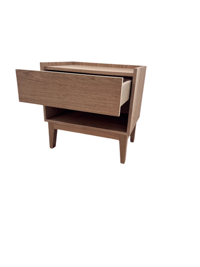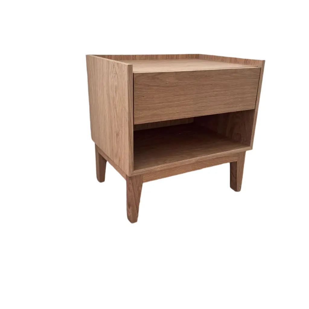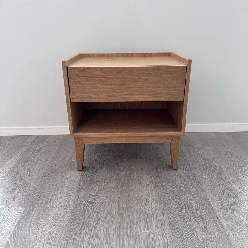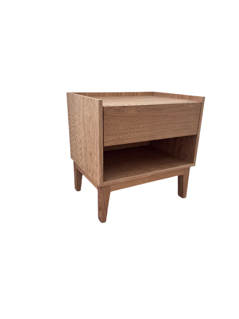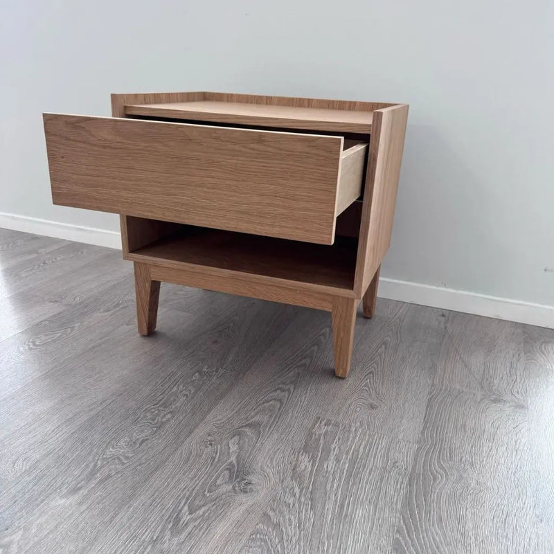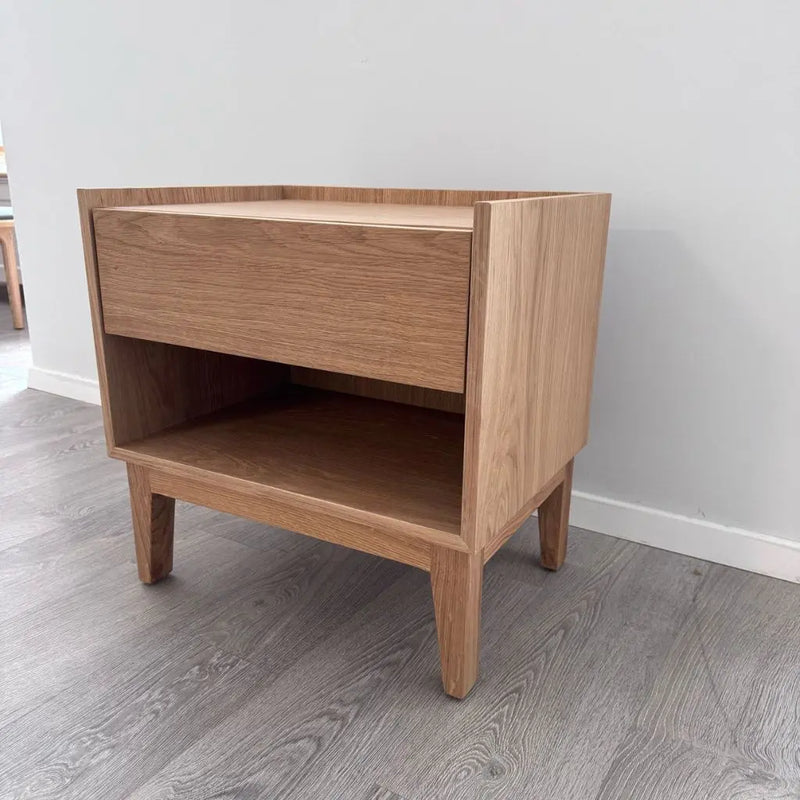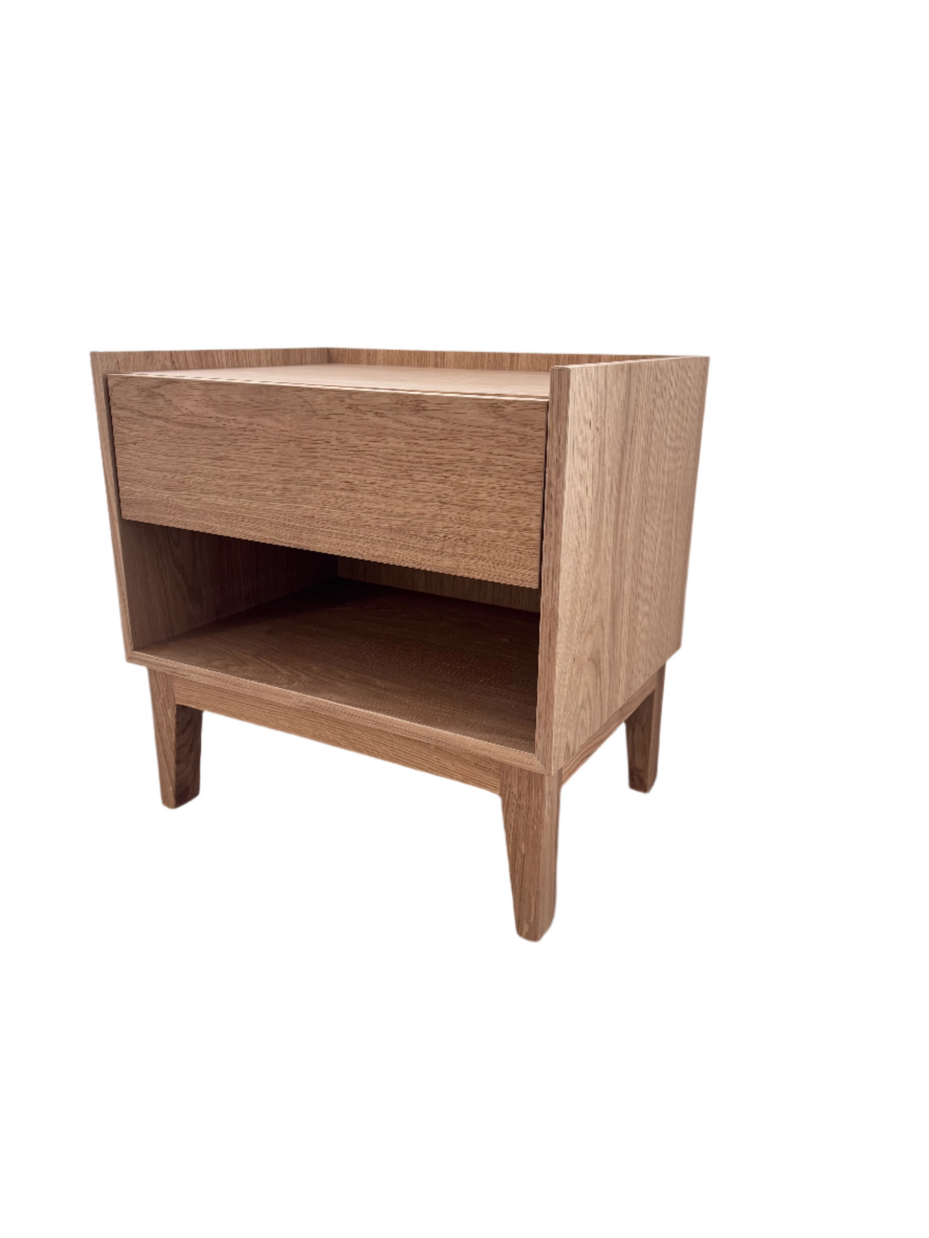 שידה לצד מיטה בעיצוב עכשיוי שילוב עץ אלון מלא עם פורניר אלון ומגירה עם טריקה שקטה