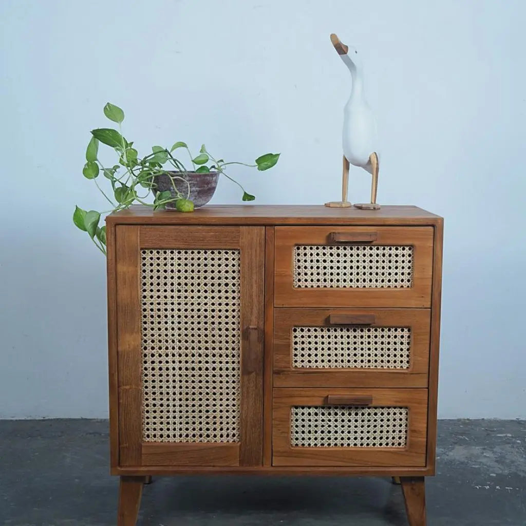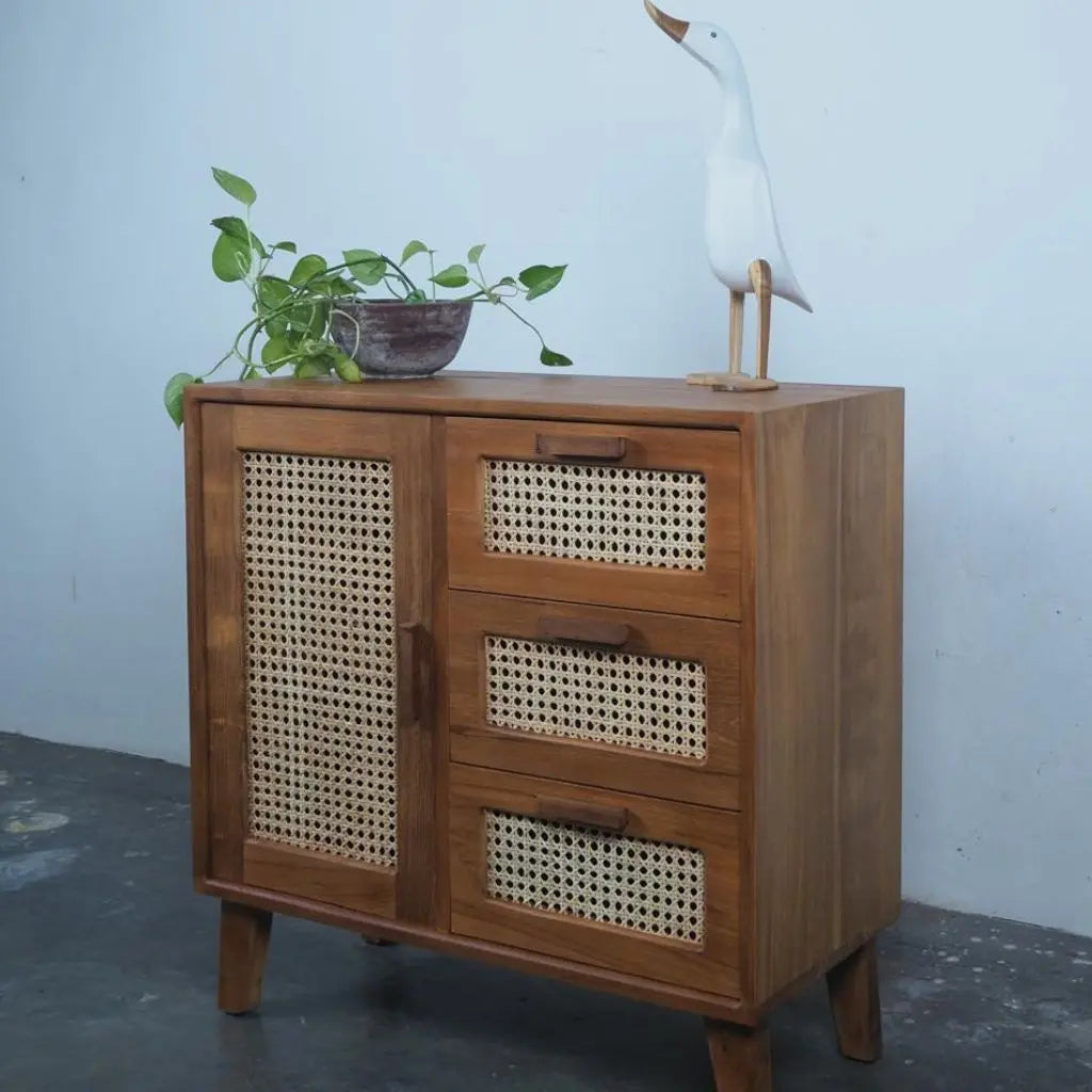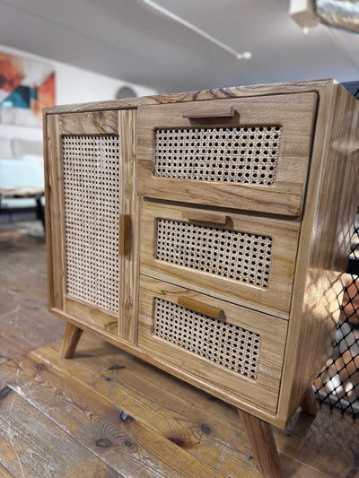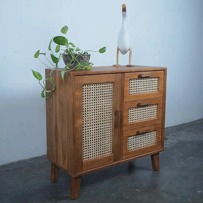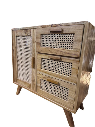 ארונית קסם טבעי המשלבת עיצוב ייחודי עם חומרים איכותיים. ארונית זו עשויה מעץ טיק מלא בשילוב ראטן ארוג, ויוצרת פריט ריהוט מרשים שיוסיף חמימות ואופי לכל חלל.