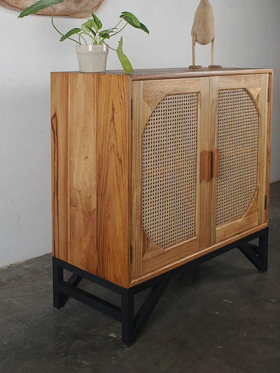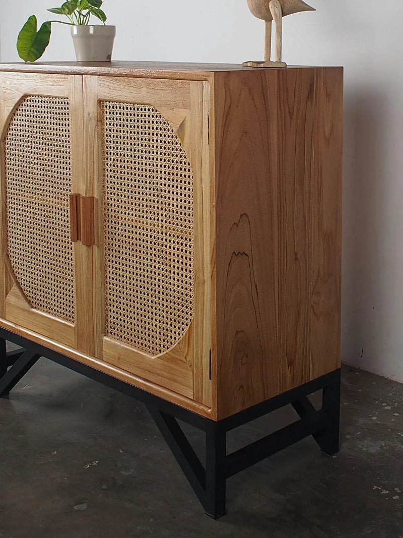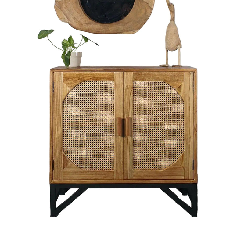 שידה מעץ טיק מלא בגוון טבעי מאינדונזיה, ראטן משולב שתי דלתות, מייצר אווירה אינטימית ומעוצבת