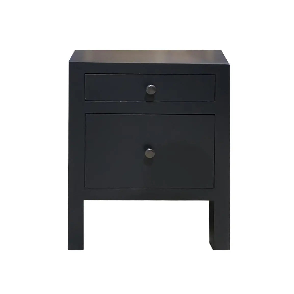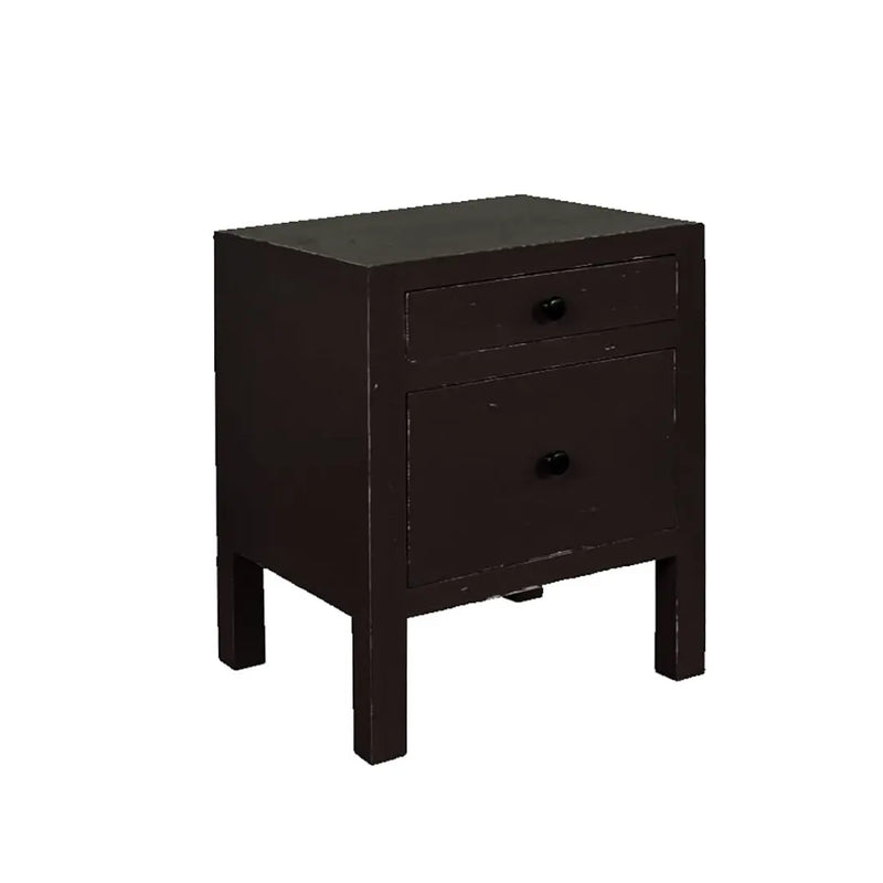 לשידה מעץ שטח אחסון הכולל שתי מגירות עם ידיות ברזל דקורטיביות.