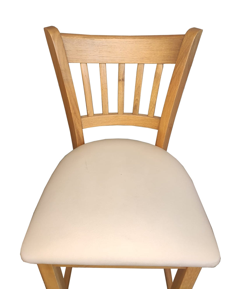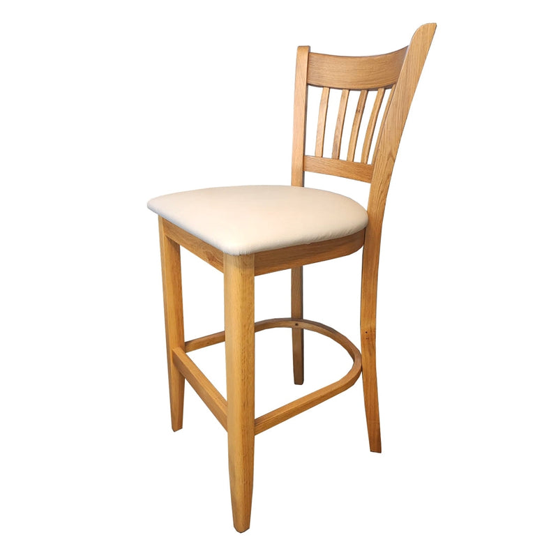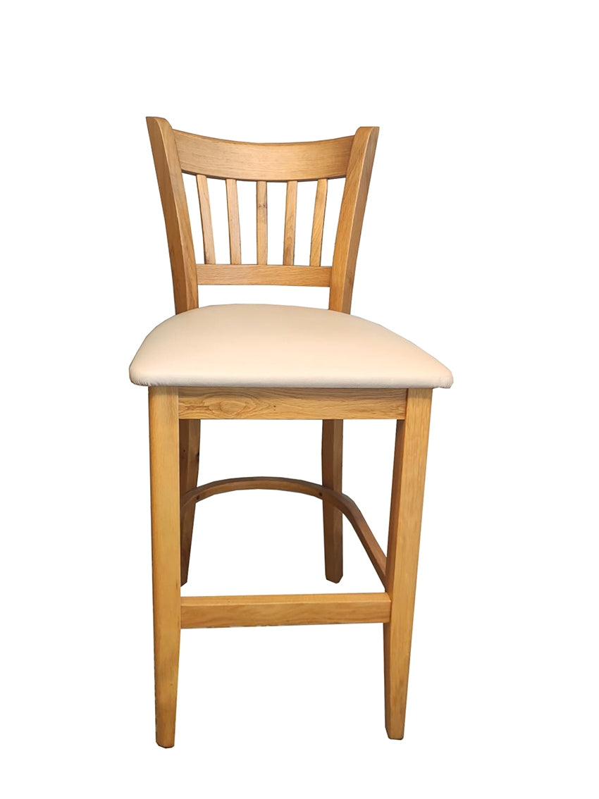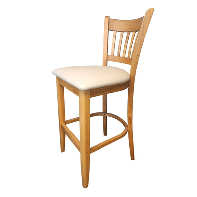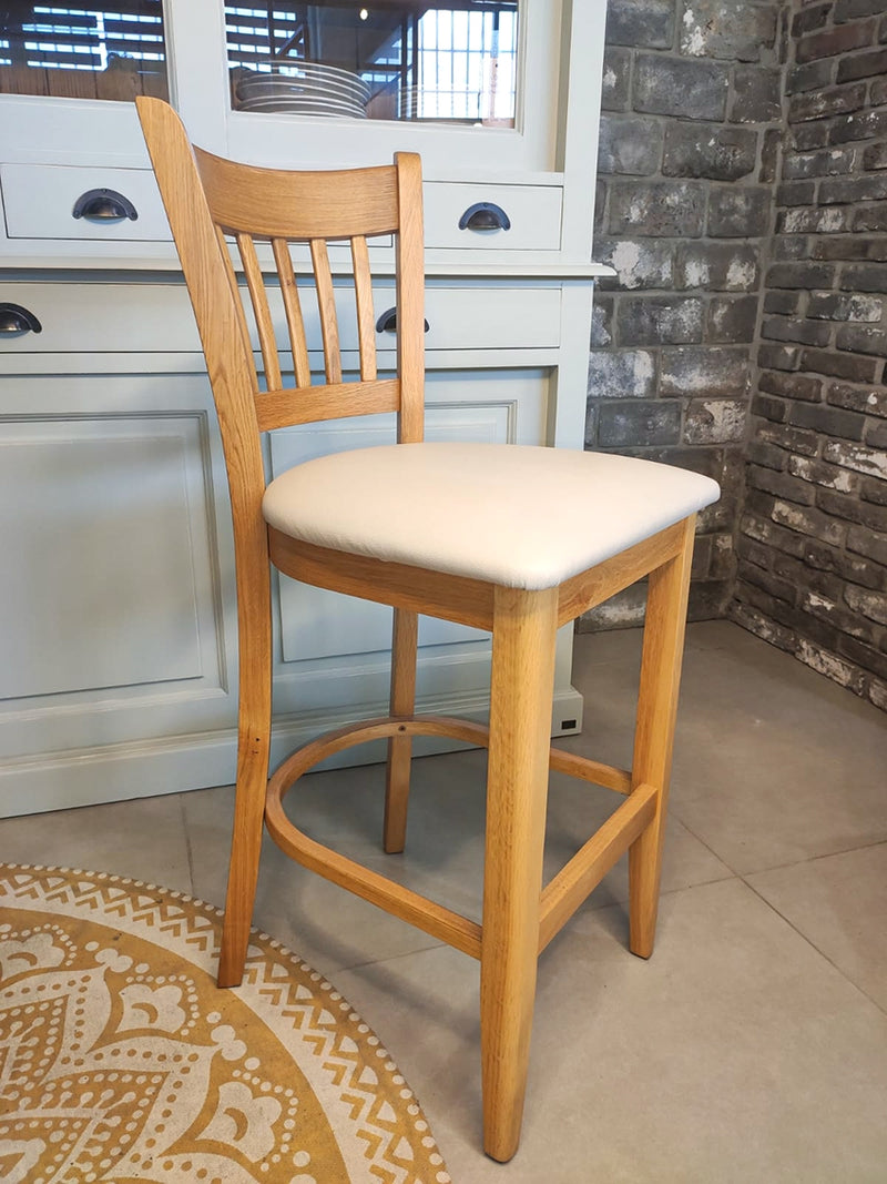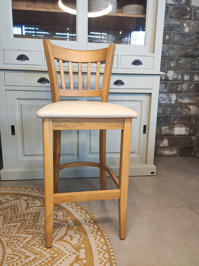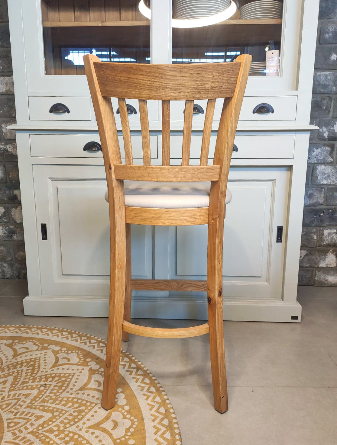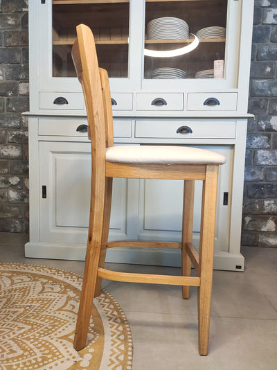 כסא בר מעץ אלון מלא בגוון טבעי בעיצוב כפרי.